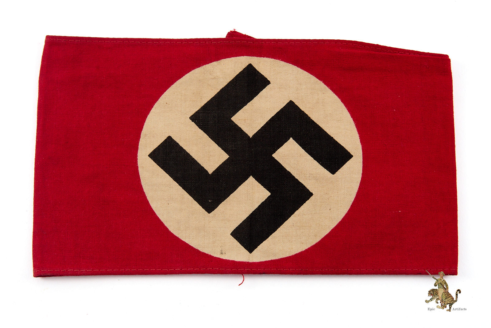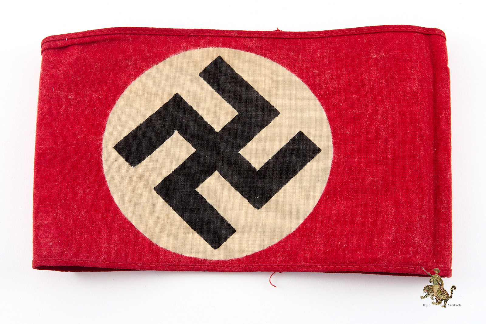 Product Description: A nice example of a Printed NSDAP Armband, executed in bold red cotton and featuring a sharply defined black swastika centered within a white roundel. The armband displays light, even age toning and gentle creasing consistent with period use, suggesting it was likely removed from a tunic.