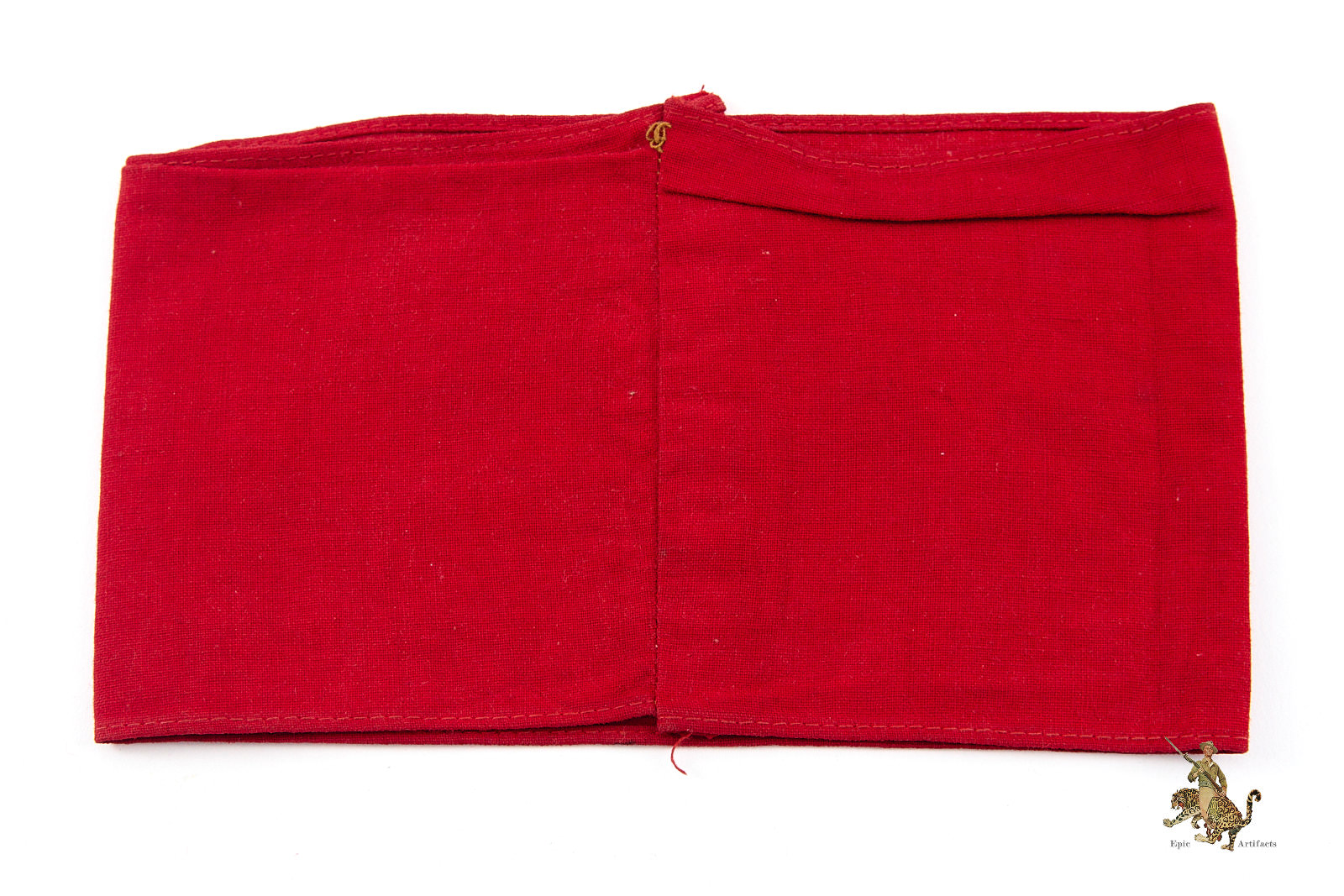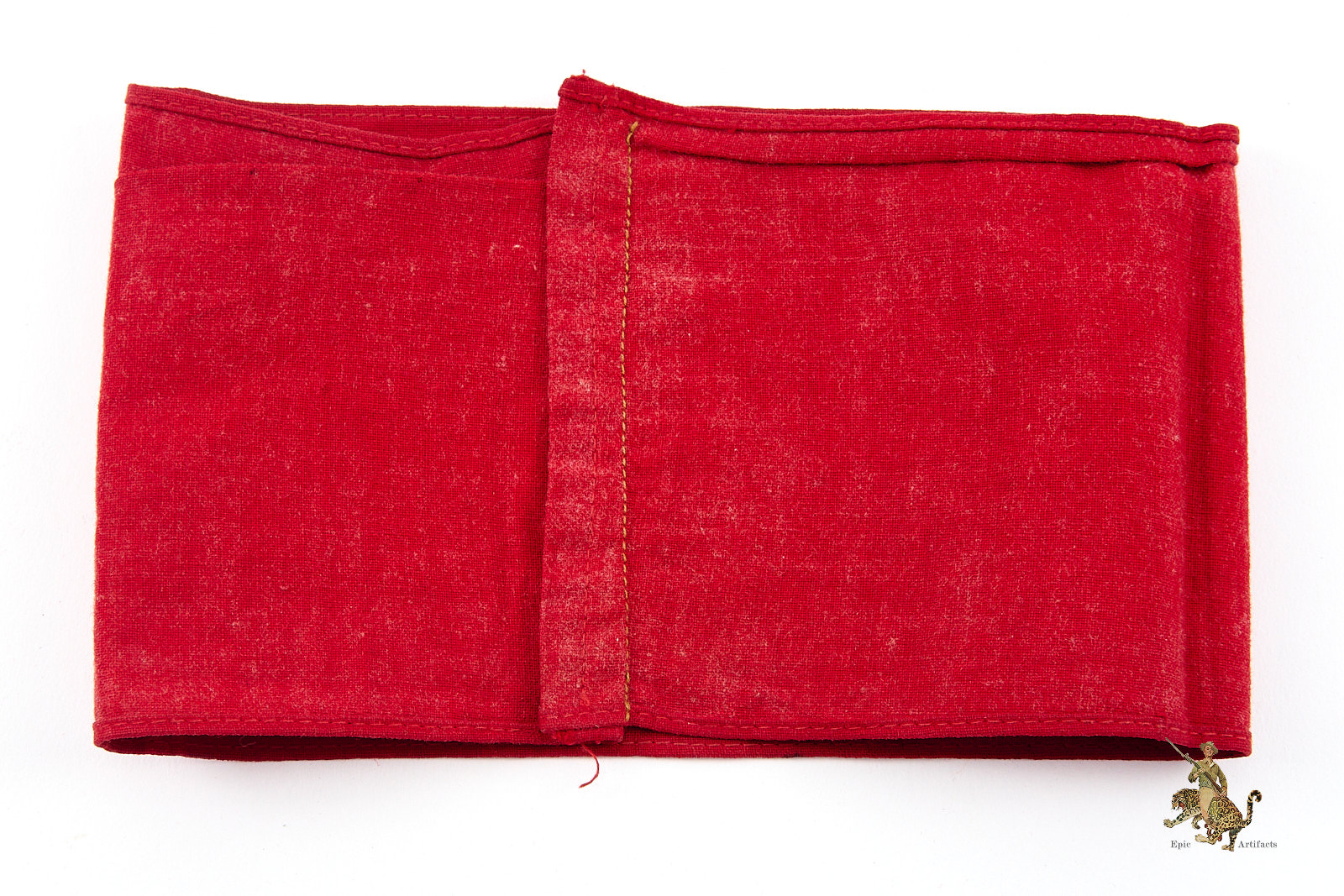 The construction is notably precise, the long edges are cleanly machine-sewn in red thread, while the ends are neatly finished with machine stitching in matching red, further reinforced with additional khaki-thread stitching to adjust sizing. The fabric retains strong color saturation and clear printed detail throughout.