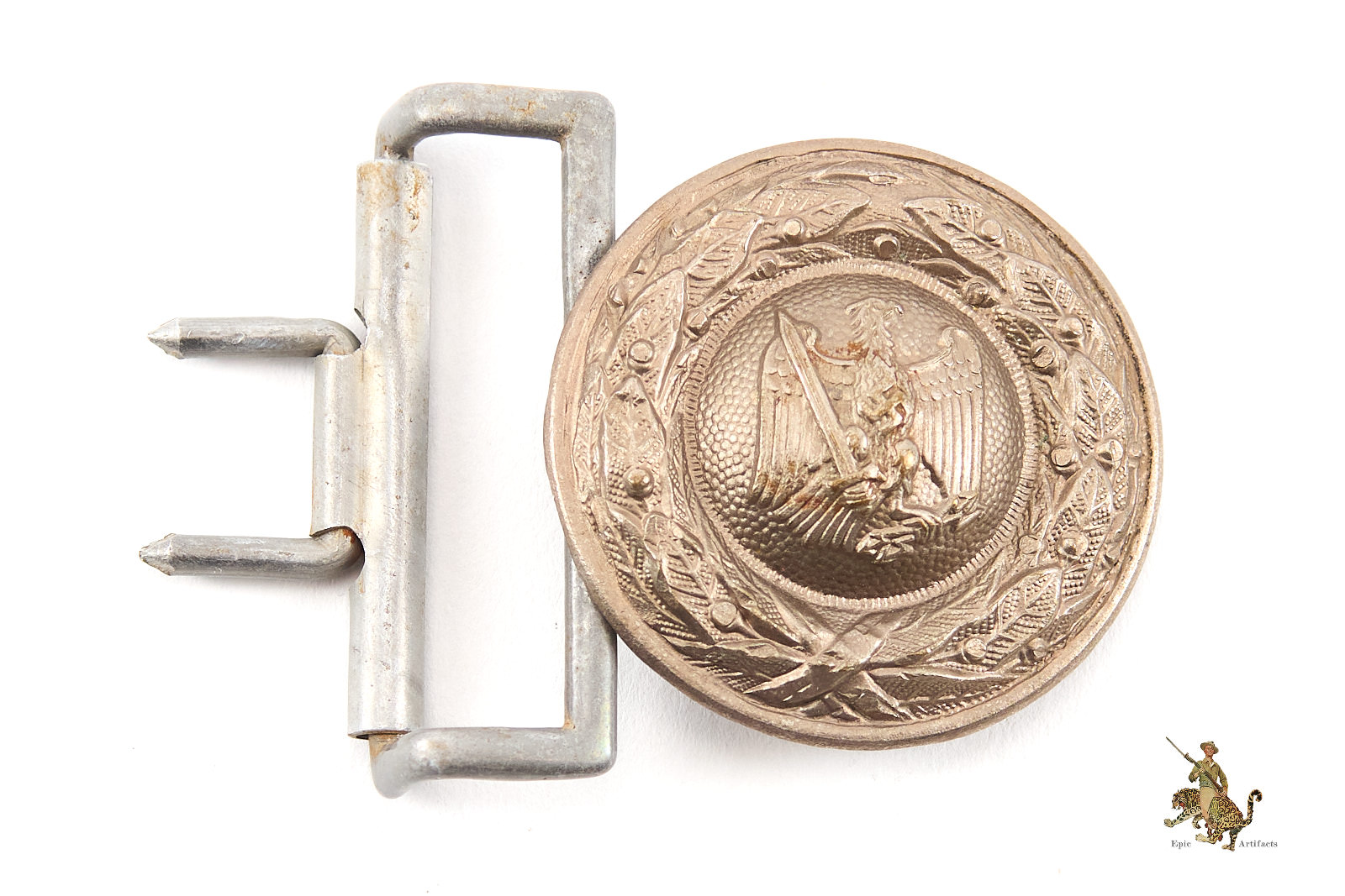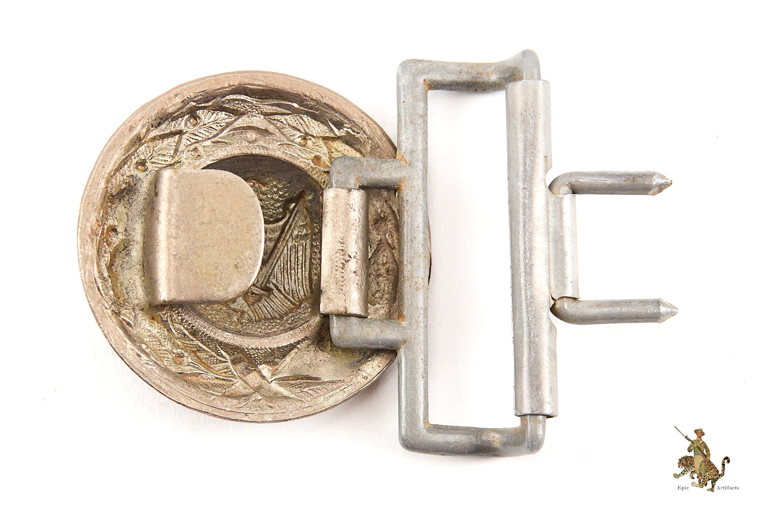 Product Description: This Prussian Forestry Official Buckle is a great example of an uncommon buckle to find. This buckle has a very appealing design, with a Prussian style eagle and swastika emblem on a pebbled oval field, surrounded by a wreath of oak leaves. This buckle is made of bunt metal. There never was any paint, as these were issued bare. The front of this buckle has a pleasant, slight age patina, and shows virtually no wear, with all of the crisp detail still intact. The reverse of this buckle is complete, and an aluminum loop that would be use to affix this to an officer style belt. There is no marking on the back. This Prussian Forestry Official Buckle is in excellent condition.
