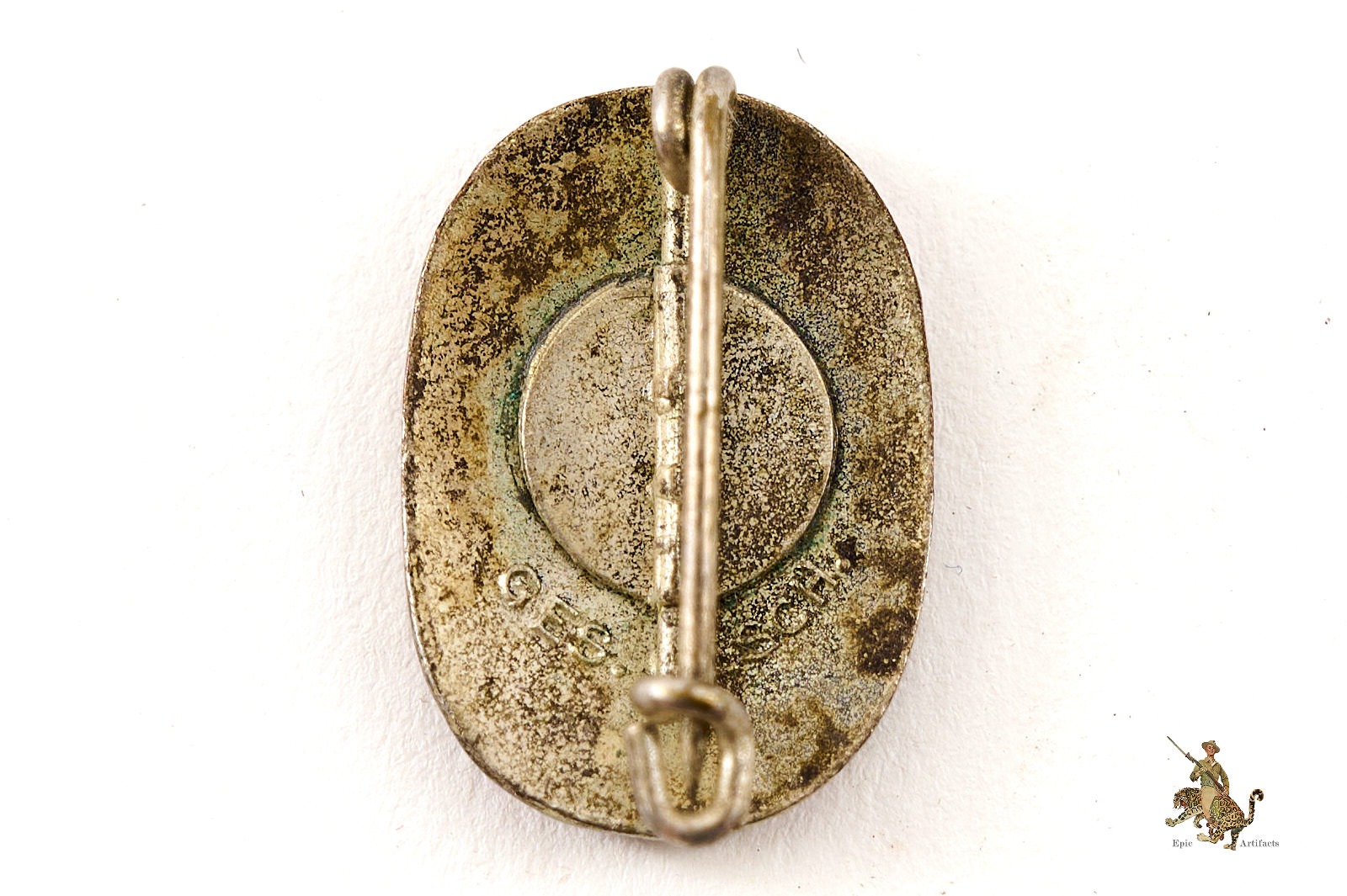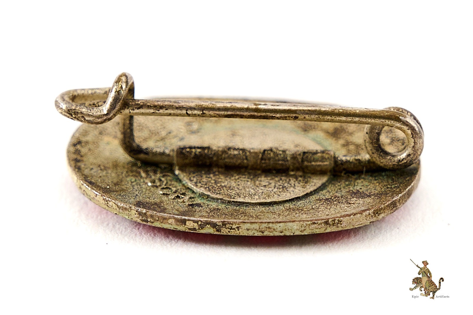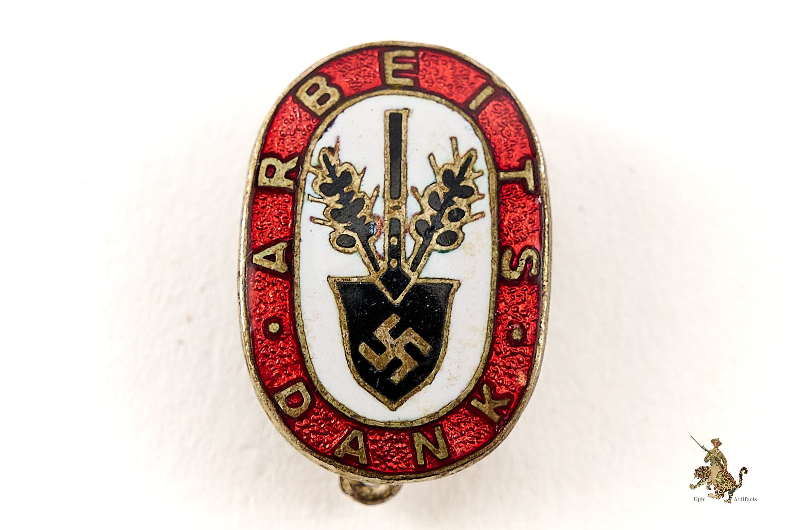 Product Description: This RAD Arbeitsdank Labor Appreciation Badge is an attractive, top quality original enamel piece. It measures 16 mm x 23 mm, and is made of silvered Tombak, with black, white and translucent red enamel. The enamel is flawless and without damage. The badge depicts the shovel, wheat and swastika organizational emblem of the RAD, with the wording “Arbeits Dank” around the edge. The front of the badge shows slight, honest wear, with the golden color of the base metal showing on most of the metalwork. The reverse of this RAD Arbeitsdank Labor Appreciation Badge still retains most of the original silver finish, with a bit of patina. It’s well marked, with “Ges. Gesch.” indicating a legally protected design. The vertical pinback is functional with no repairs. This is a nice example of this appealing enamel pin, in excellent plus condition.