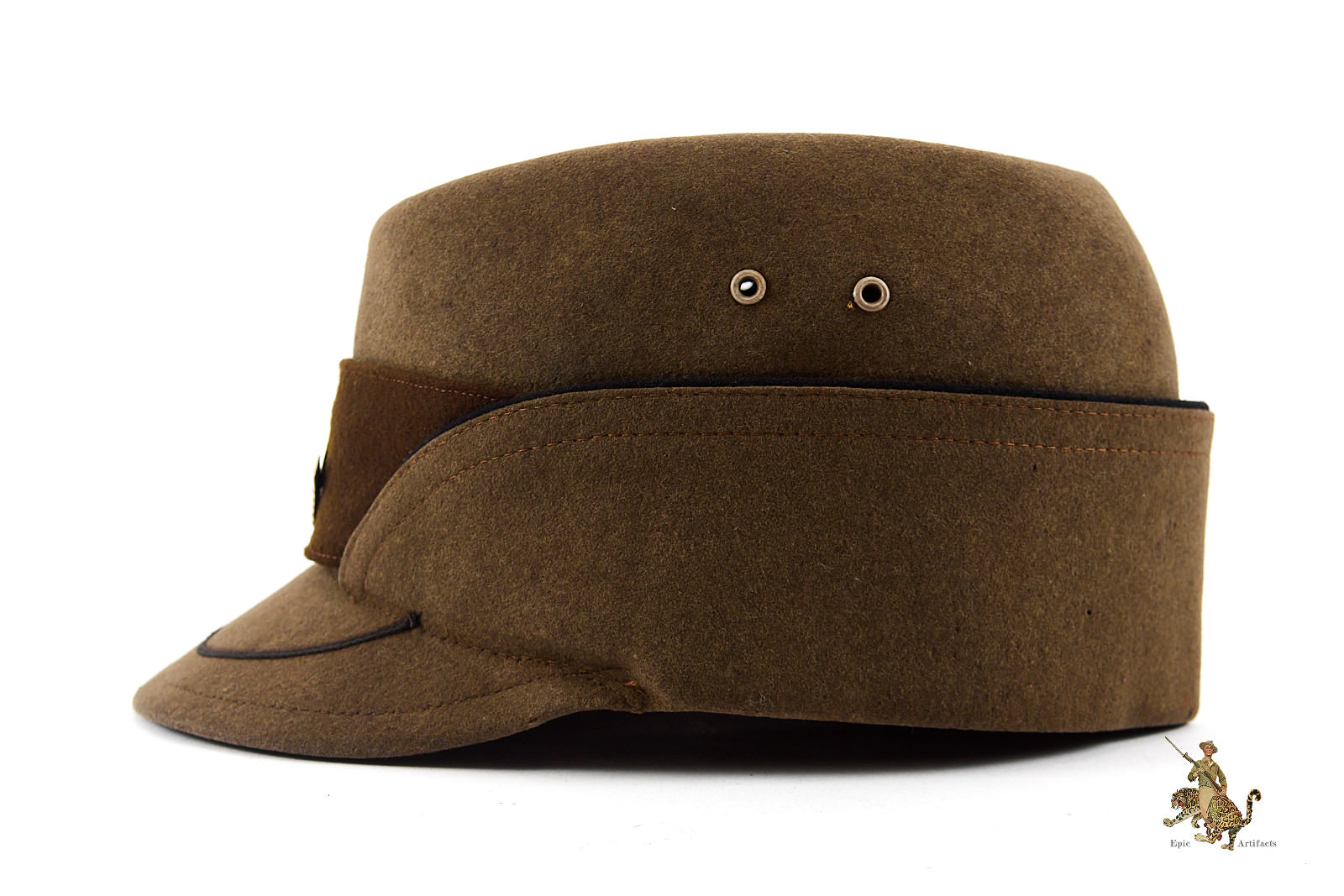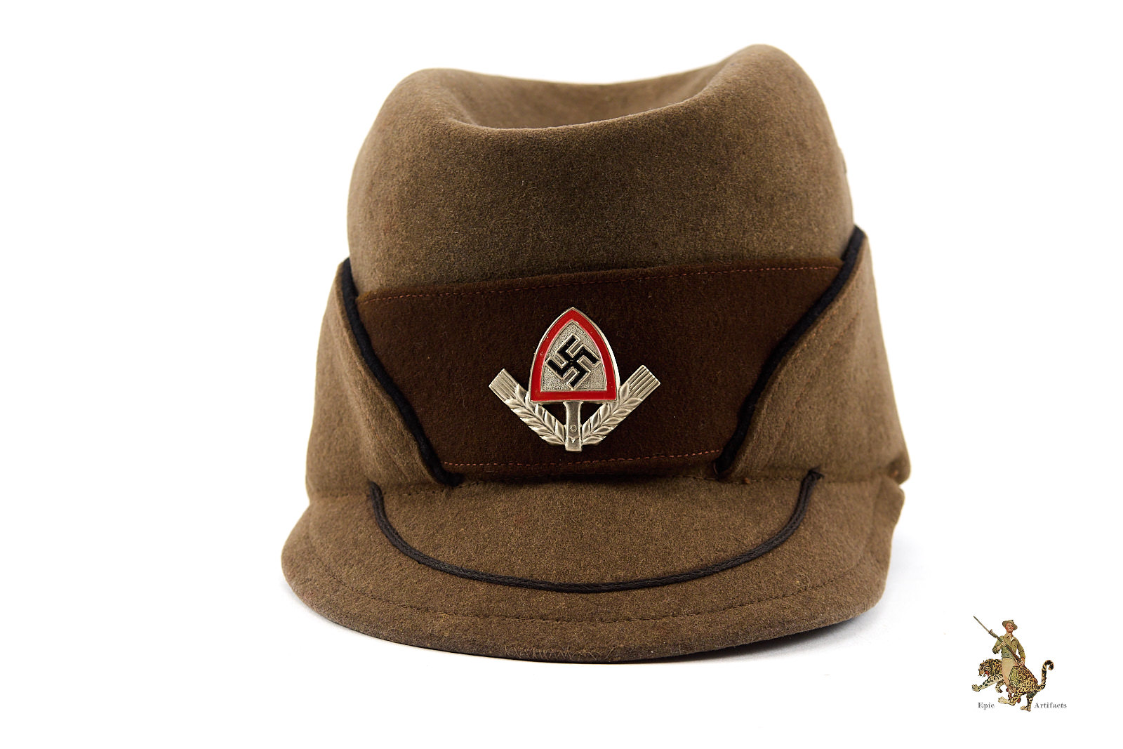 Product Description: RAD Enlisted Cap – Robin Hood, an original example of Reichsarbeitsdienst headgear for enlisted personnel. Constructed of brown wool with a slightly darker wool band, the cap features a period metal insignia in near-mint condition, showing only minor paint ticks to the red detailing. The wool body remains free of moth holes or tracking, reflecting careful preservation over time.