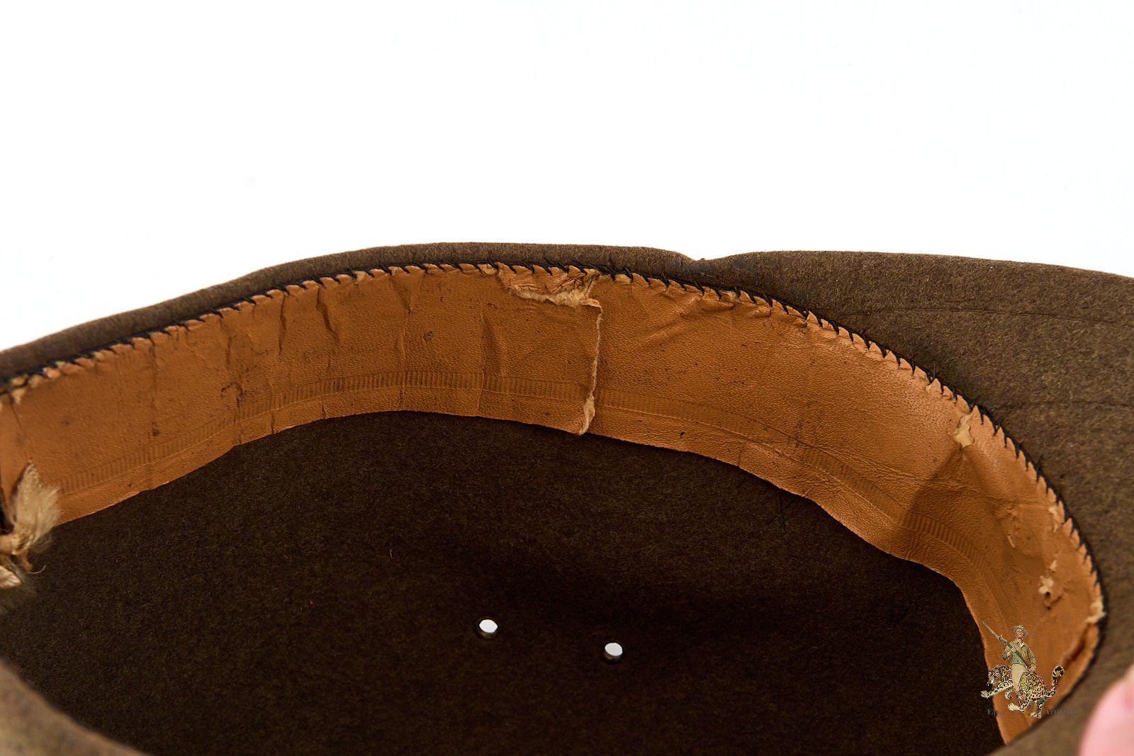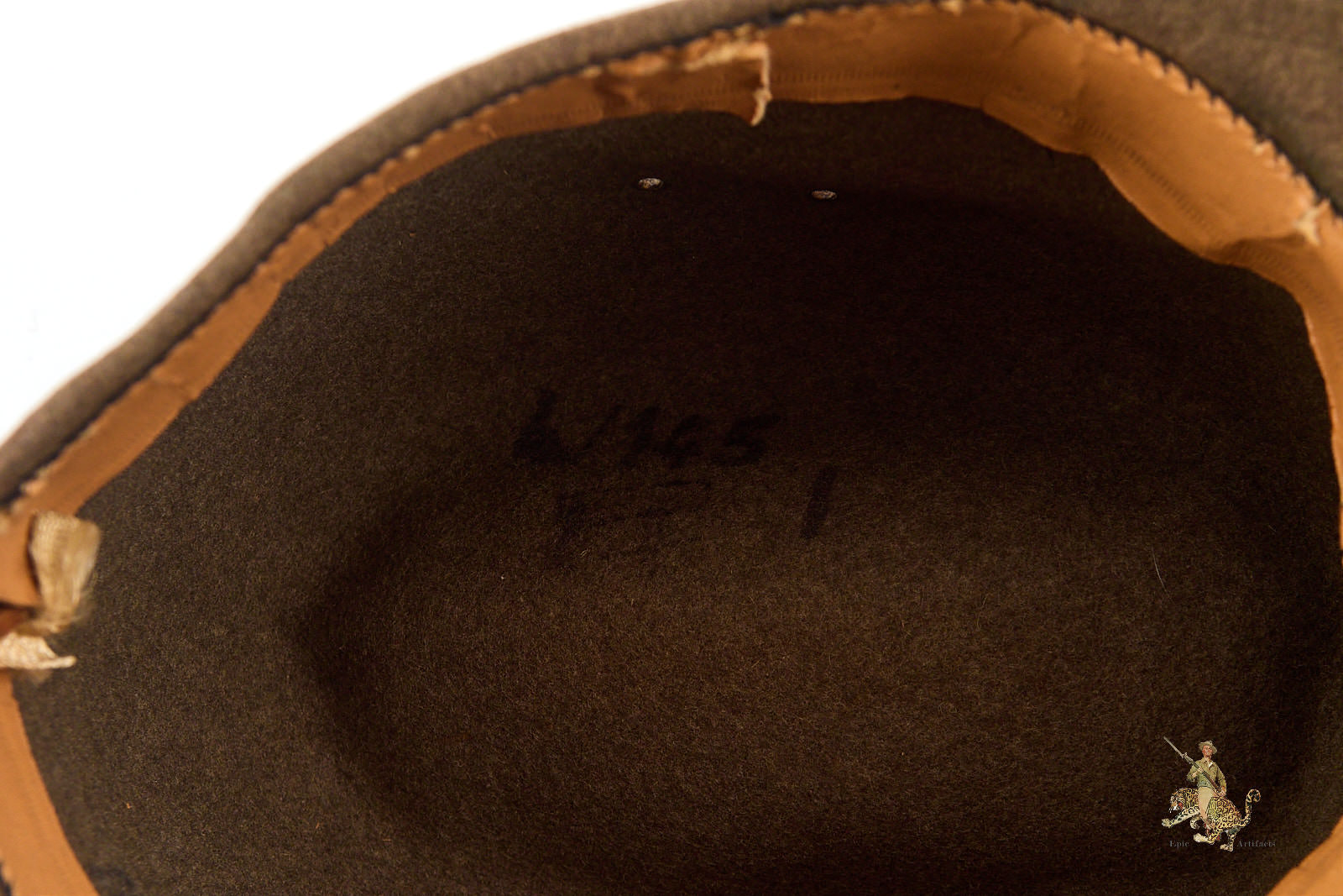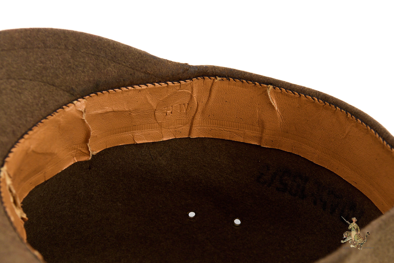 The interior retains its complete faux leather sweatband, which shows expected minor cracking and wear. The cap is stamped with the initials MH and bears additional period stamps on the crown. All four metal ventilation eyelets are intact and original. A well-preserved and visually striking RAD Enlisted Cap – Robin Hood, suitable for display or inclusion in a specialized collection of Third Reich uniforms and insignia.