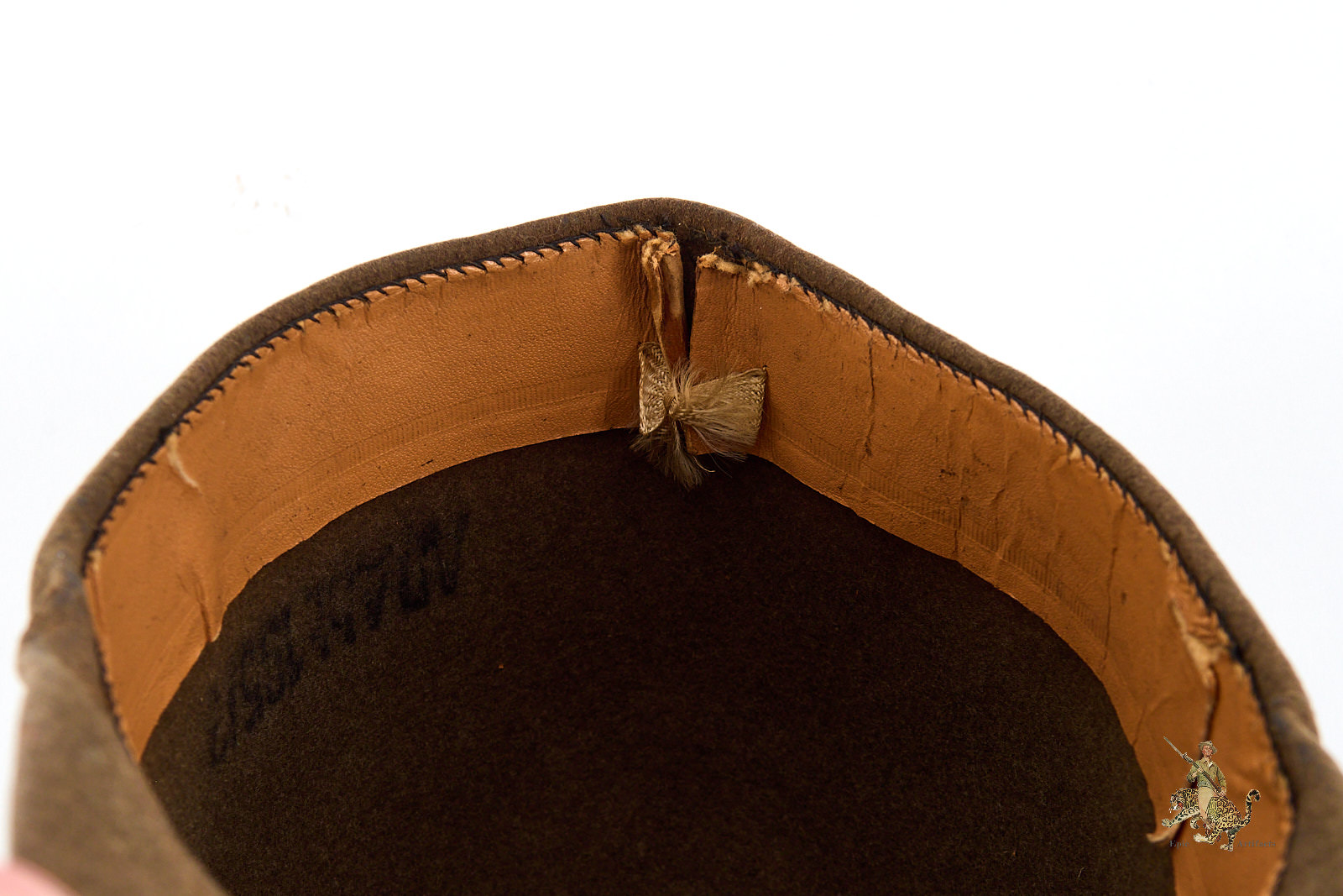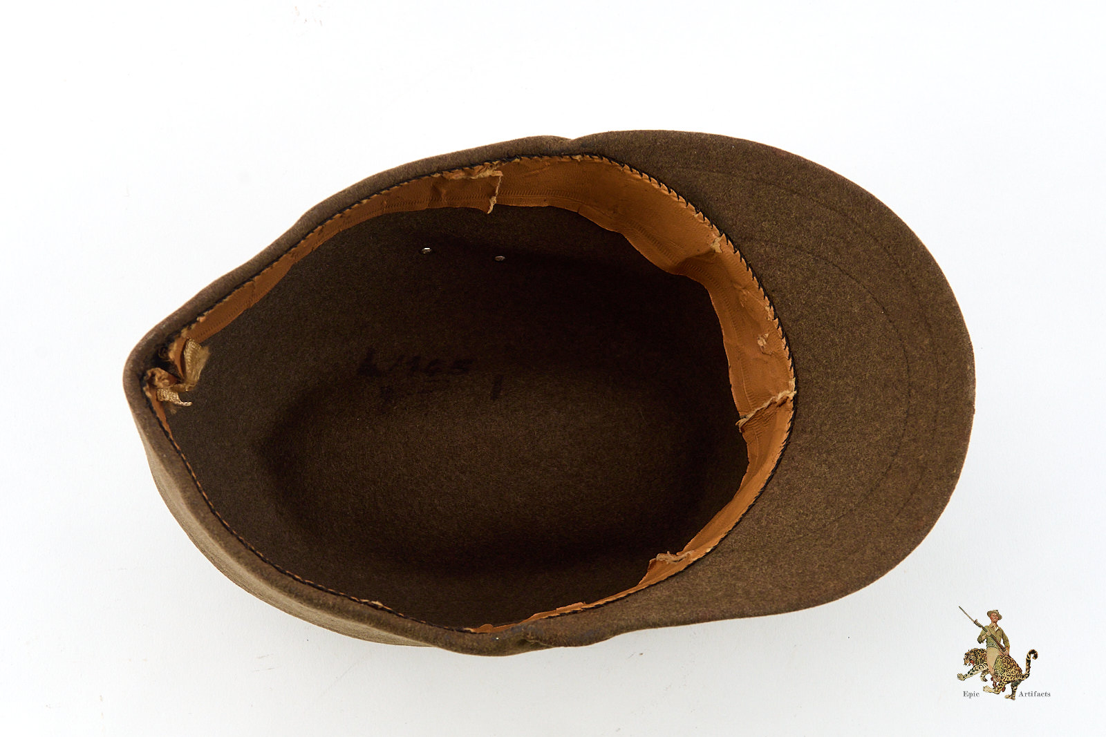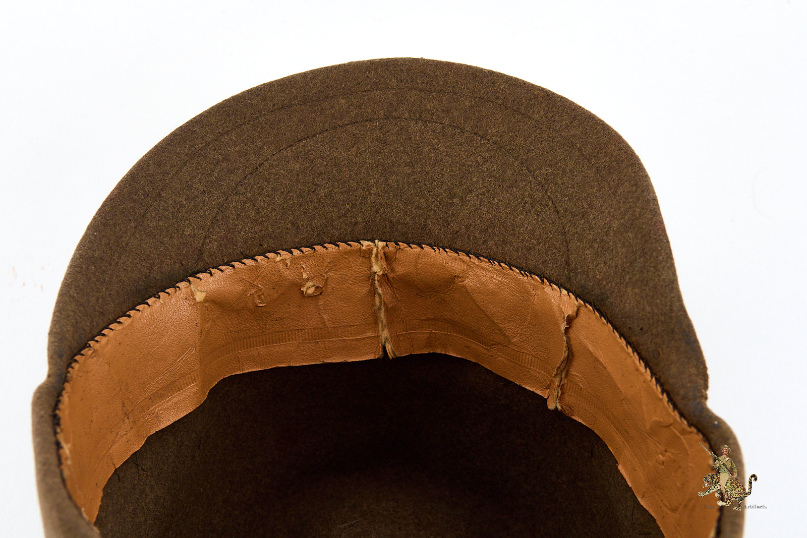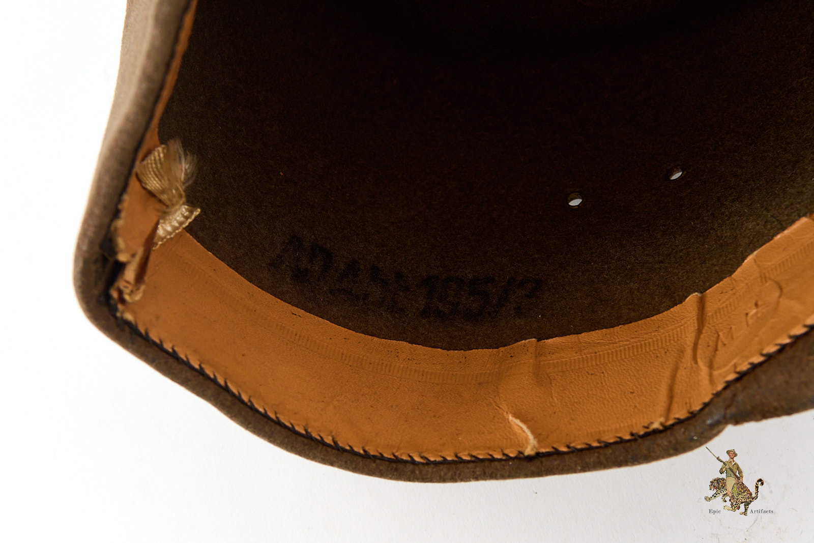 The interior retains its complete faux leather sweatband, which shows expected minor cracking and wear. The cap is stamped with the initials MH and bears additional period stamps on the crown. All four metal ventilation eyelets are intact and original. A well-preserved and visually striking RAD Enlisted Cap – Robin Hood, suitable for display or inclusion in a specialized collection of Third Reich uniforms and insignia.