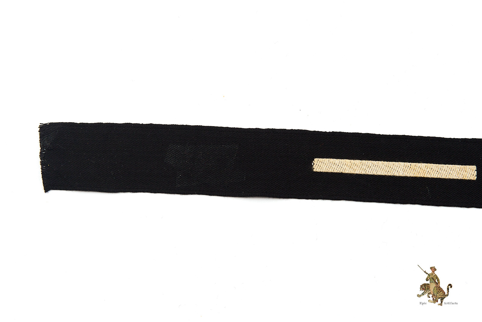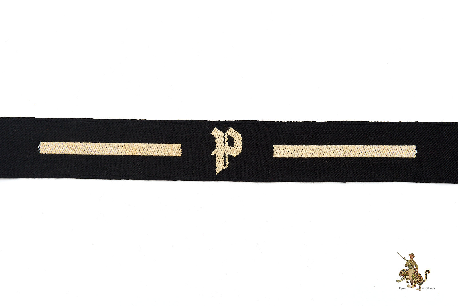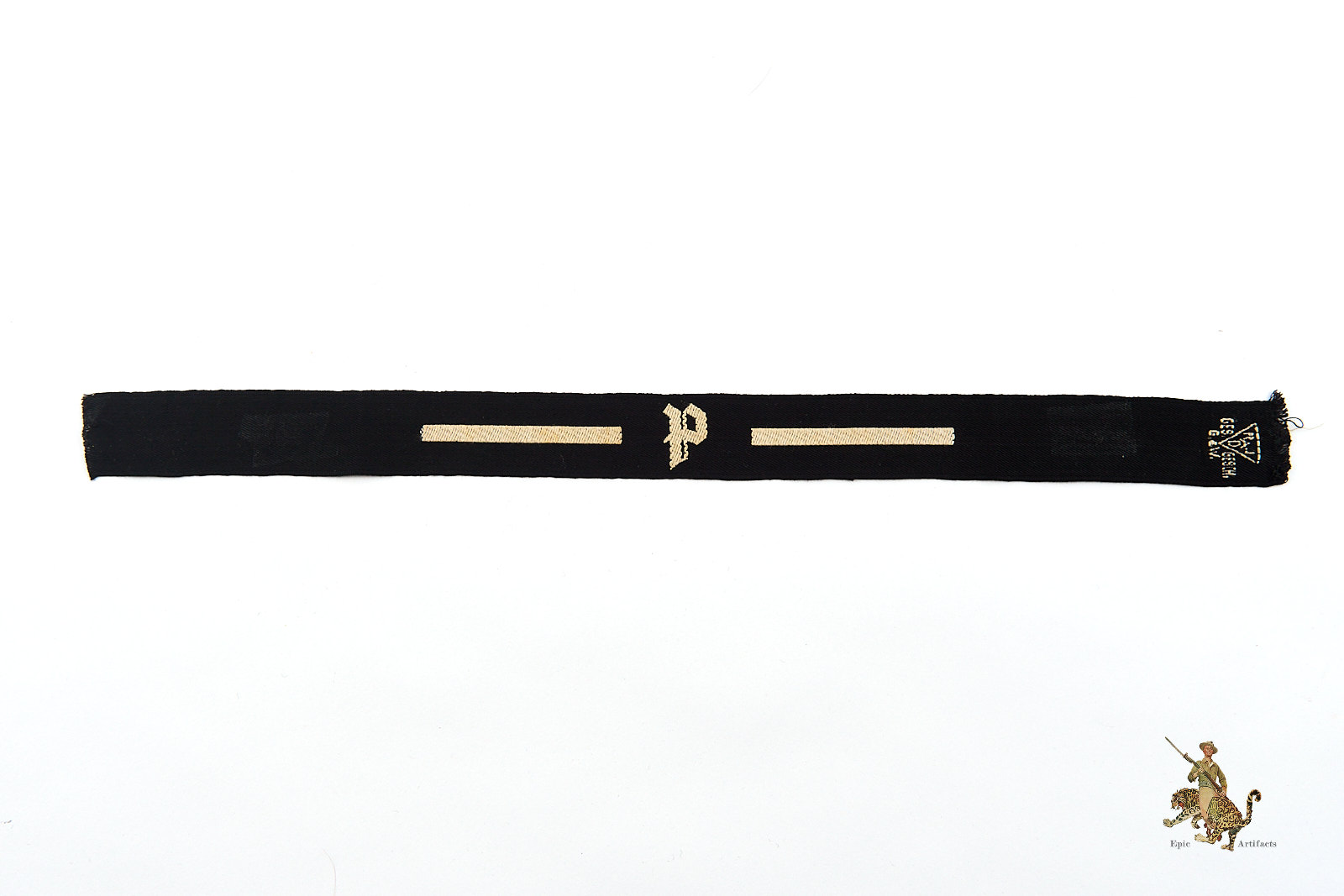 Product Description: A well-preserved RAD Labor Service District Cuff Title, identified as a leader’s pattern example, executed in BeVo woven construction and featuring a centralized “P” device flanked by narrow white lines to either side. The title retains crisp woven detail and strong coloration, consistent with period manufacture. The reverse bears the RADJ insignia mark “Ges. Gesch.” together with the maker’s designation “G.&W.” positioned at the terminal end of the band.