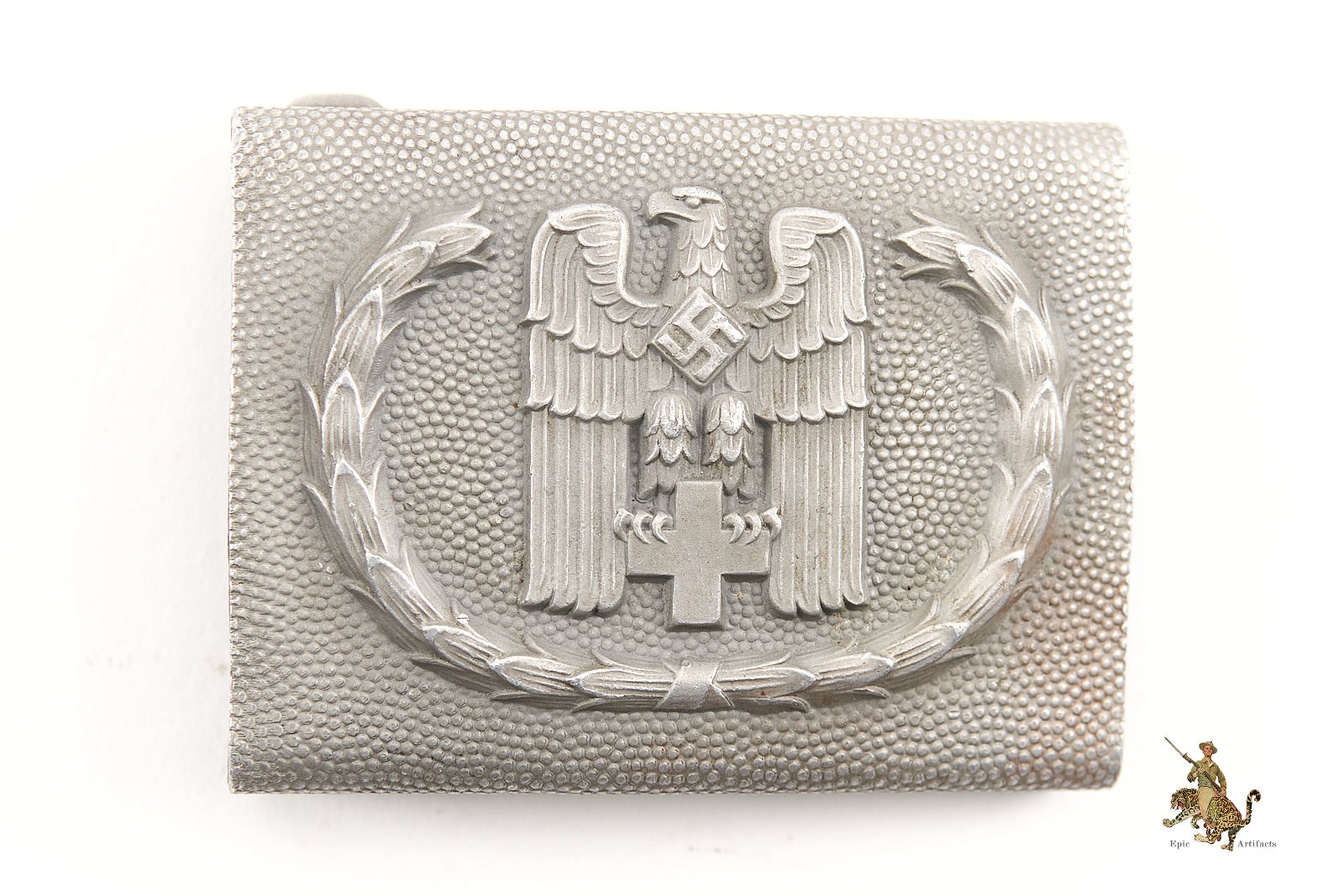 Product Description: This is a great, representative example of a Red Cross EM buckle. This pattern of belt buckle was worn by enlisted men and NCOs of the Deutsches Rotes Kreuz (DRK), the German Red Cross. This is a wartime example of the Red Cross EM buckle, made of Aluminum. This buckle exhibits a nice patina with light wear to the raised surface. It retains lots of great detail, and shows typical age patina on the front and back, but no real wear- the overall condition rates excellent. The front of the buckle bears the DRK eagle emblem, surrounded by a wreath. The reverse of this one-piece Red Cross EM buckle has an interesting integral cast catch, rather than the separate piece usually encountered on stamped buckles. The prongs for affixing this to a belt are intact and functional. The buckle is marked Ges.Gesch.1 near catch on reverse. Overall, this is a really nice example of a wartime Red Cross EM Buckle.