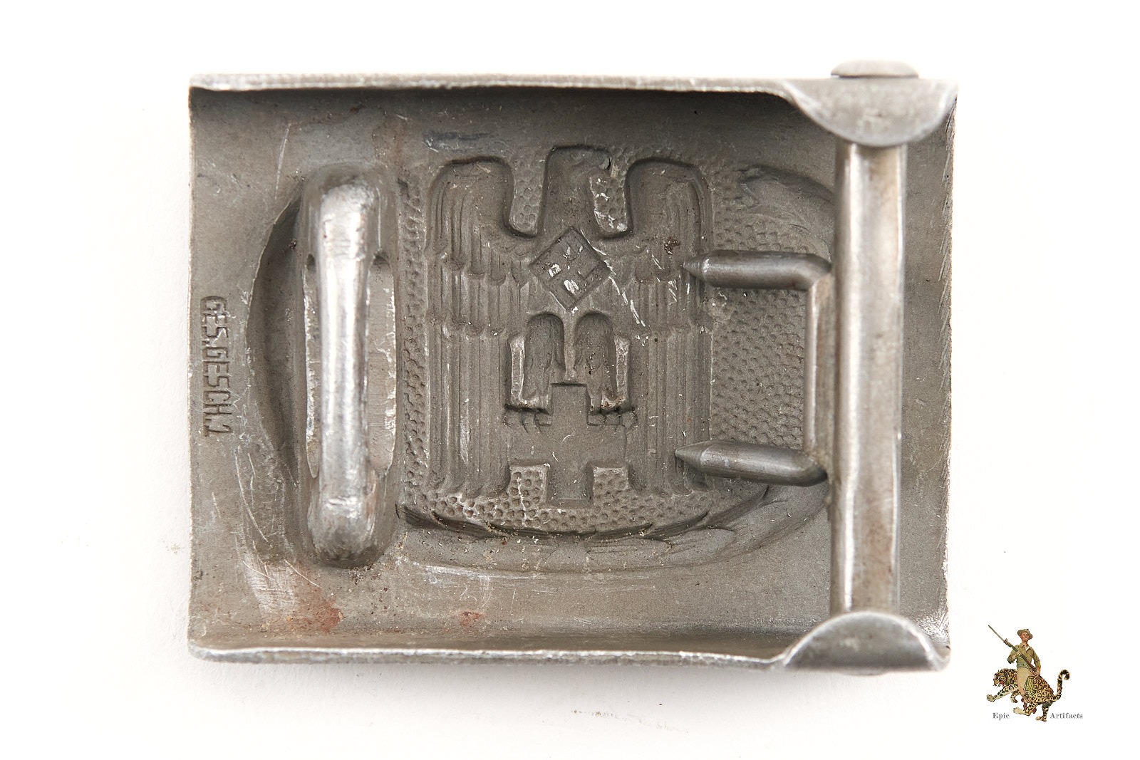 Historical Description: The belt buckle was an important part of the regalia worn by all uniformed military, civil, political and paramilitary organizations during the Third Reich. The belt (“Koppel”) was part of the uniform, and would always be worn while on duty. The belt buckle (“Koppelschloss”) was generally specific to each organization, with many organizations having separate belt buckles for officers and for enlisted personnel, sometimes with different colors and finishes to further denote specific purposes. The buckles were adorned with various mottos and designs specific to the organizations for which they were intended. Many designs used the German national eagle emblem, in a variety of forms. Belt buckles were worn with uniforms ranging from finely tailored officer parade uniforms, to the issue uniforms of enlisted soldiers in combat. Generally speaking, most German belt buckles of the Third Reich were made with two prongs on the reverse, to allow the buckle to be worn and adjusted on a belt. The buckle had a catch that would mate with a hook on the belt, when worn. The earliest Third Reich buckles were often made of brass, or nickel silver. Later, aluminum became very common, and was used on private purchase as well as enlisted buckles of the German military, with or without a painted or plated finish. After WWII began, most enlisted military buckles were steel. Nazi belt buckles were popular souvenirs for Allied troops who served in Europe. Some types were made by the millions and remain quite common today. Others were made in limited numbers and are very rare.