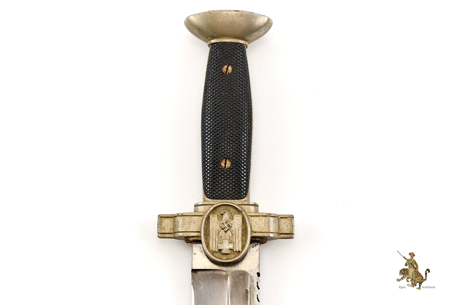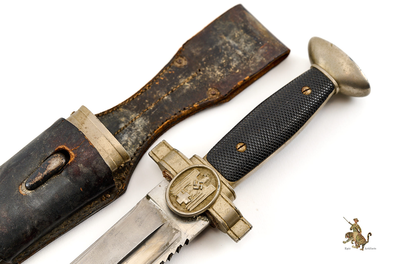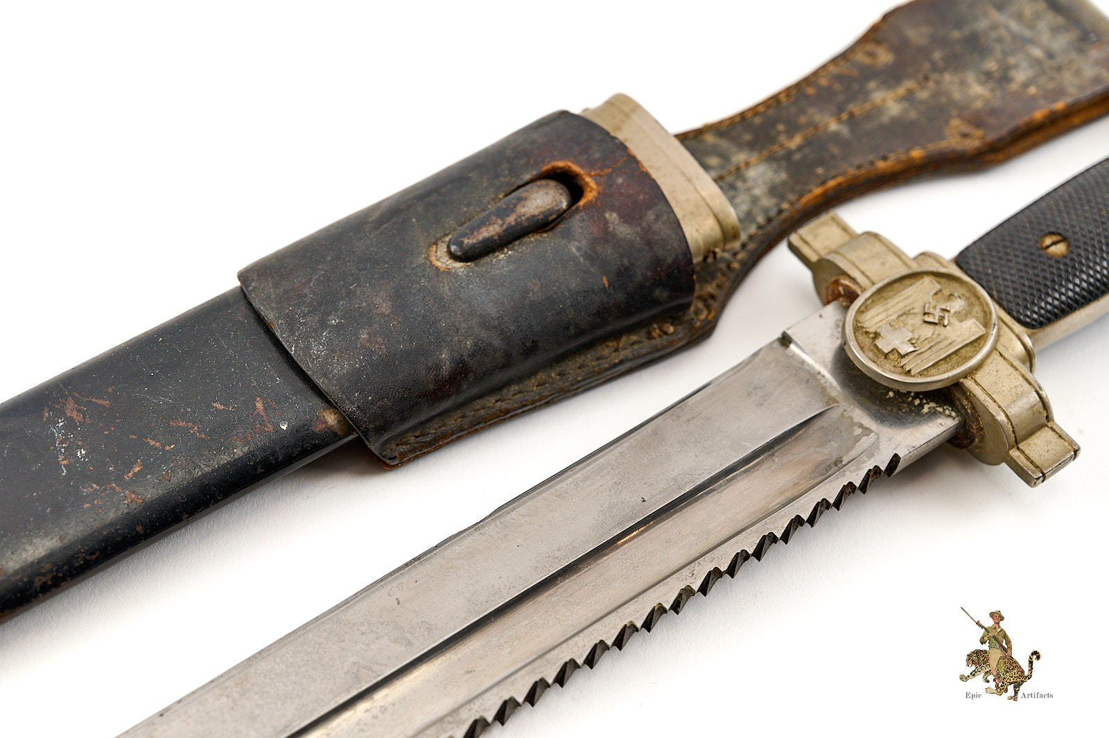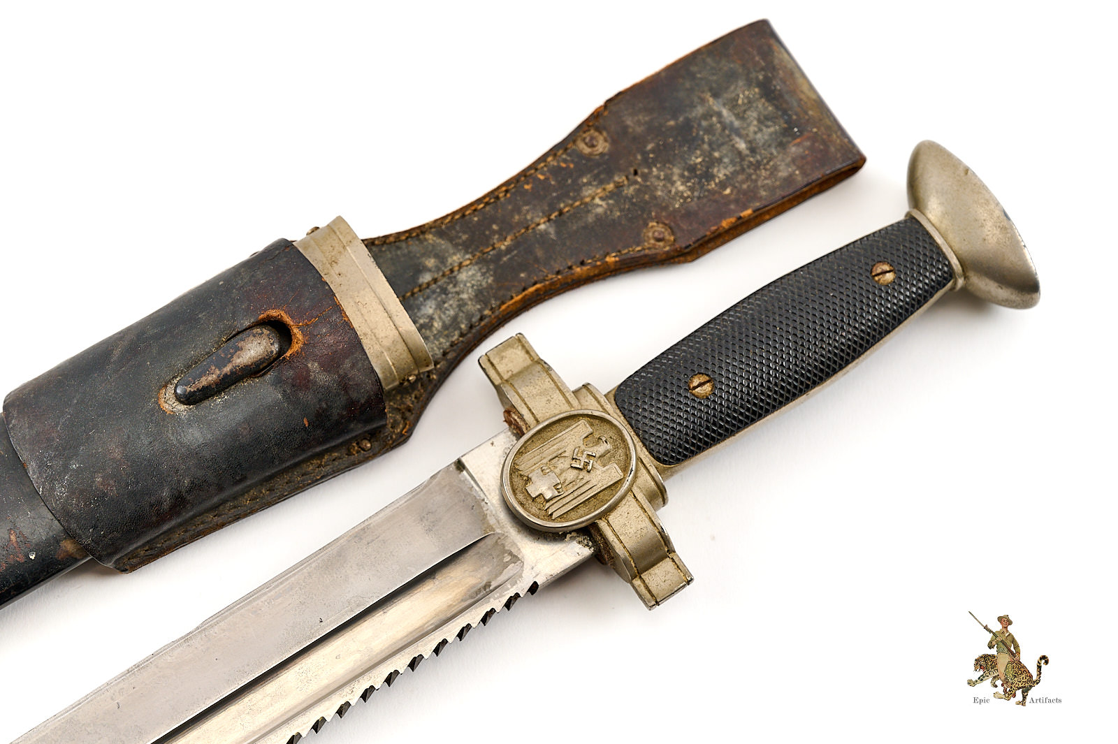 Historical Description: The German Red Cross (Deutsches Rotes Kreuz, DRK) was given organizational status by the Nazi Party in 1938. As with all official organizations, it fell under the auspices of the NSDAP; the DRK fell under the German Ministry of the Interior.  In 1938, a special and unique edged weapon, the “Hauer für Mannschaften” (known to collectors as the Red Cross EM Hewer) was introduced for enlisted personnel of the DRK. It was a blunt-pointed tool, with one cutting edge, and one saw edge on the blade spine. It was intended not only as a dress dagger for ceremonial and formal wear, but as a practical knife for preparing splints, casts and bandages. The purpose of the blunt tip was to avoid violating Geneva Convention prohibitions against medical staff carrying offensive weapons. Unlike most German blades intended for dress purposes, the Red Cross EM Hewer was not a private purchase item but was issued from unit stocks as needed. Officers in the DRK wore a different dagger. Manufacture of the enlisted hewer ceased in 1940.