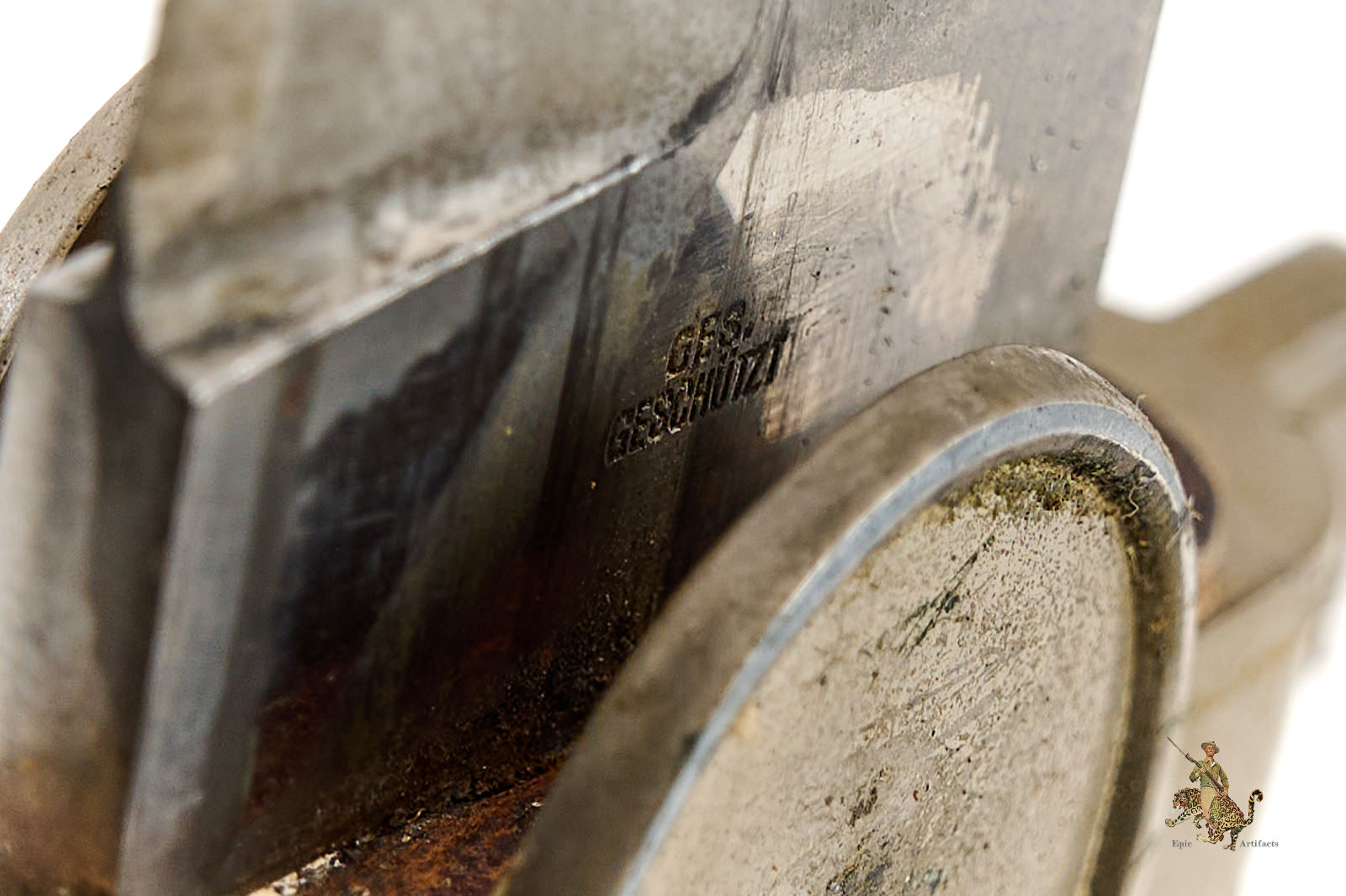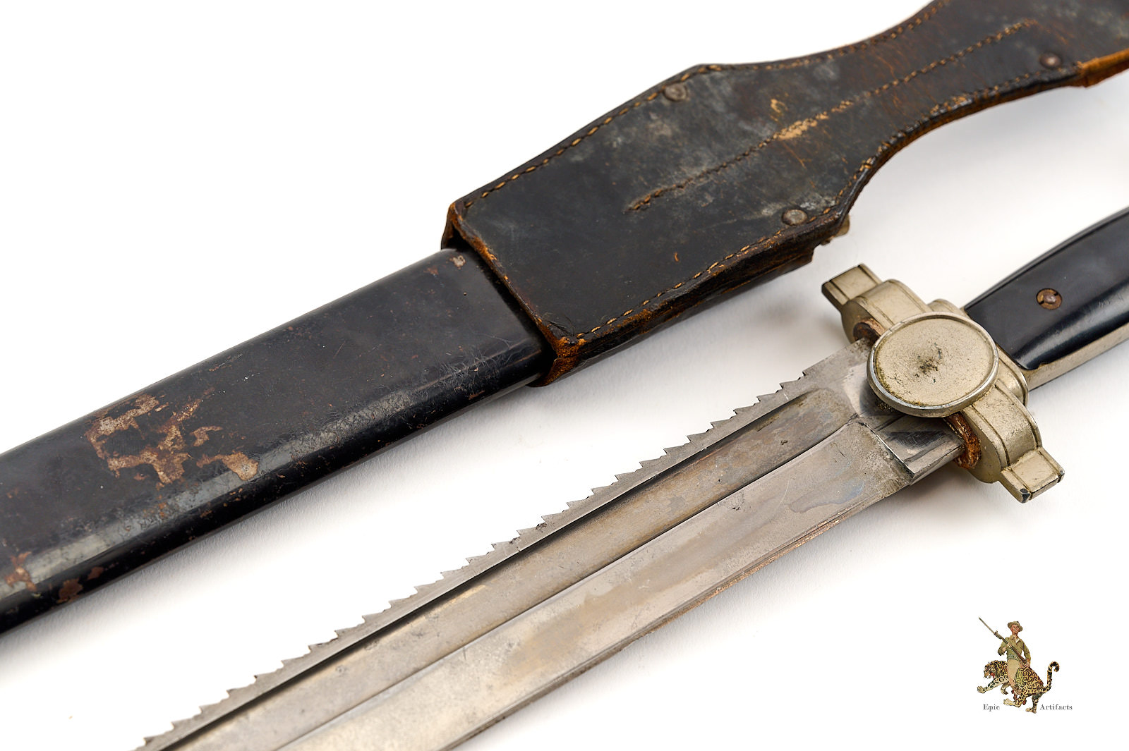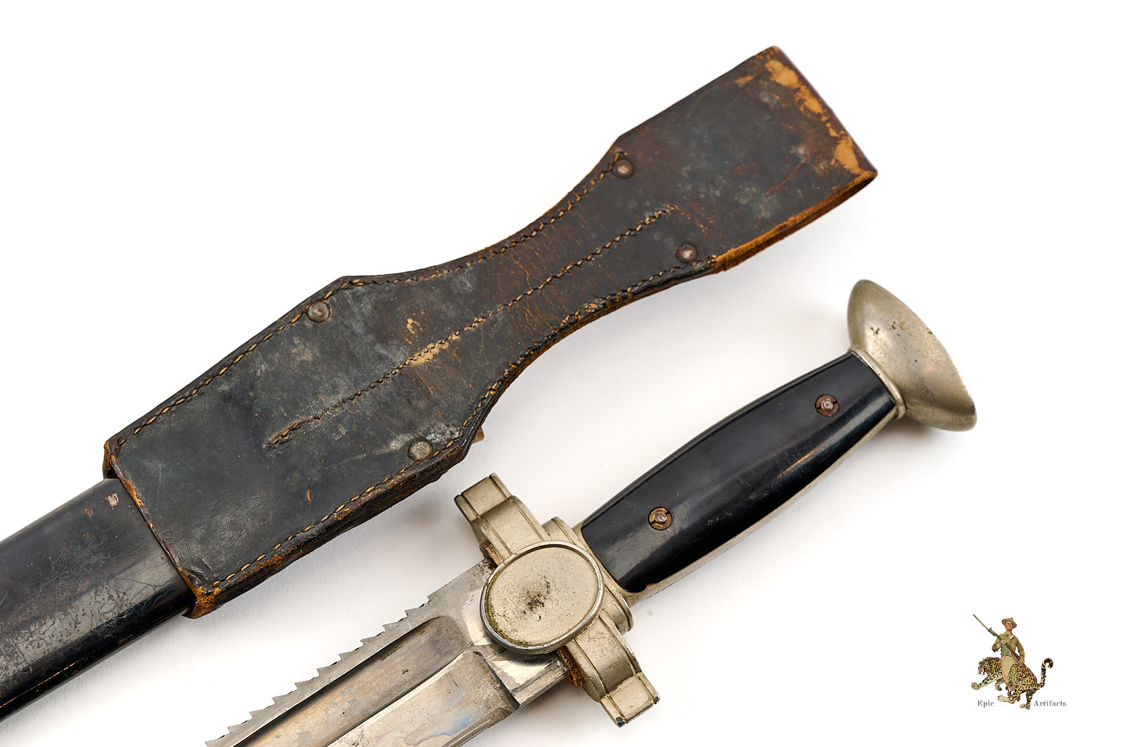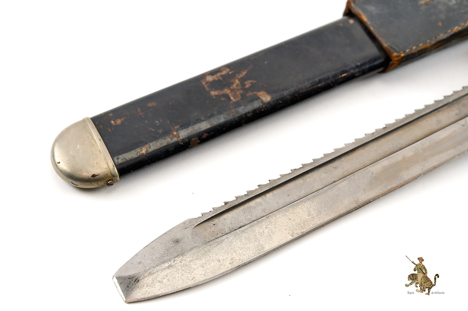 Historical Description: The German Red Cross (Deutsches Rotes Kreuz, DRK) was given organizational status by the Nazi Party in 1938. As with all official organizations, it fell under the auspices of the NSDAP; the DRK fell under the German Ministry of the Interior.  In 1938, a special and unique edged weapon, the “Hauer für Mannschaften” (known to collectors as the Red Cross EM Hewer) was introduced for enlisted personnel of the DRK. It was a blunt-pointed tool, with one cutting edge, and one saw edge on the blade spine. It was intended not only as a dress dagger for ceremonial and formal wear, but as a practical knife for preparing splints, casts and bandages. The purpose of the blunt tip was to avoid violating Geneva Convention prohibitions against medical staff carrying offensive weapons. Unlike most German blades intended for dress purposes, the Red Cross EM Hewer was not a private purchase item but was issued from unit stocks as needed. Officers in the DRK wore a different dagger. Manufacture of the enlisted hewer ceased in 1940.