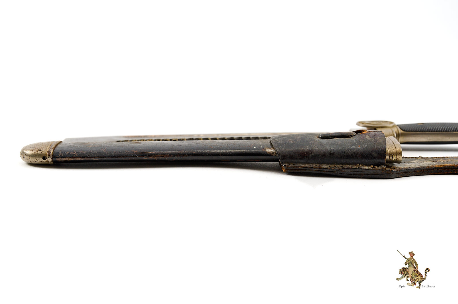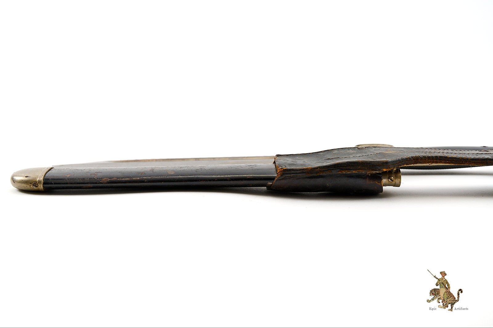 The scabbard presents well, showing wear and paint loss to its original black enamel finish. The metal fittings remain free from major flaws, retaining both screws at the throat and one of the two at the tip.  Some light corrosion is present throughout as shown. The accompanying leather frog is original and complete, with stitching intact and a smooth surface throughout, showing only localized color loss and light surface cracking. Frog is unmarked.