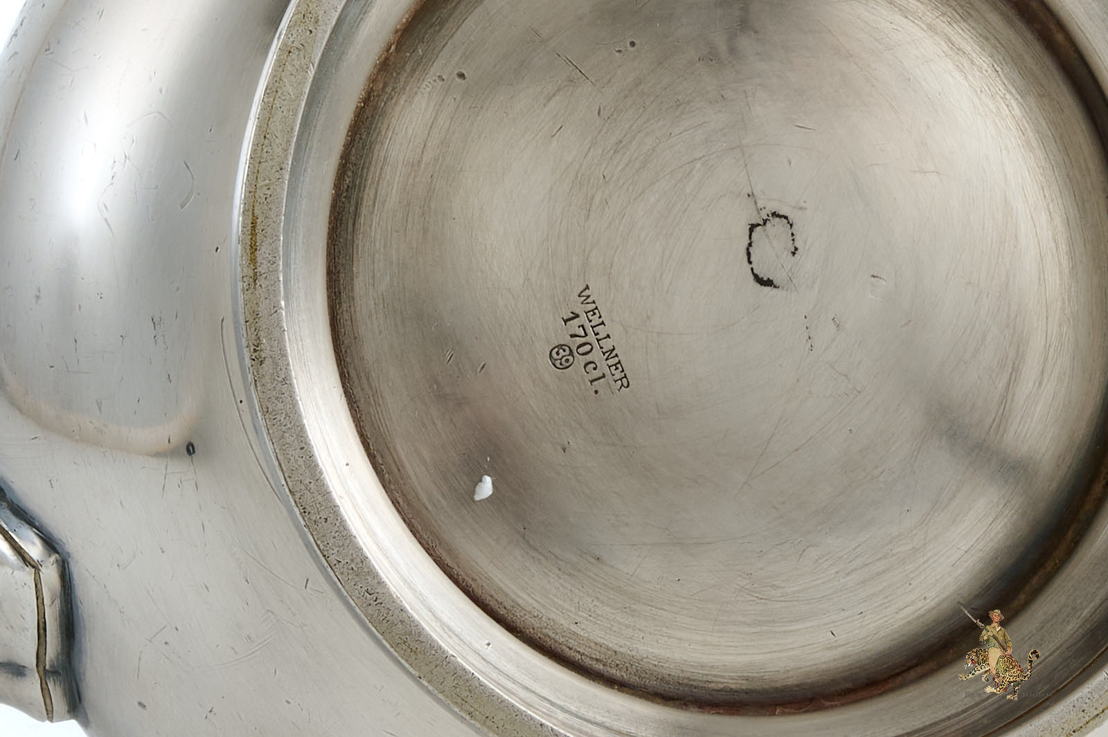 The underside is stamped with the Wellner maker’s mark, along with “39” denoting the year of manufacture. The piece remains in near mint condition, exhibiting minimal signs of handling and retaining strong visual appeal throughout. Accompanying the tea pot is a copy of a jewelry appraisal dated July 23, 1945, issued by Paul Feldenheimer Inc. of Portland, Oregon, for Mrs. H. Clayberger, identified as a relative of the soldier who returned the item, adding a compelling layer of early post-war provenance.