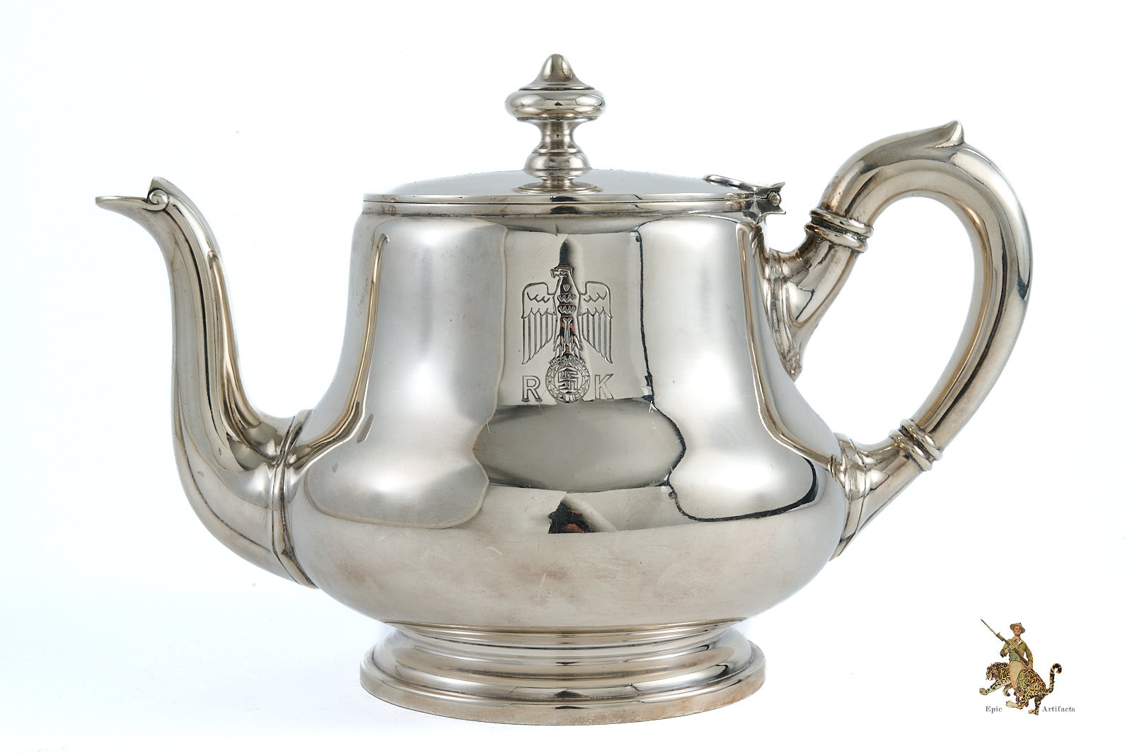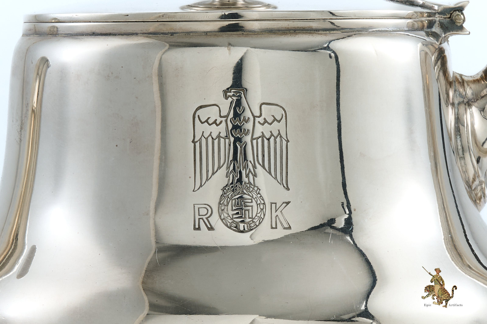 Product Description: A highly desirable and well-presented example of official state service ware, this Reich Chancellery RK Wellner 150 cl Tea Pot 1939 reflects the refined production standards of the Wellner firm. This tea pot is marked to hold 150 cl on the bottom and features a finely polished surface, complemented by a bold and clearly defined RK insignia prominently displayed along the rim.