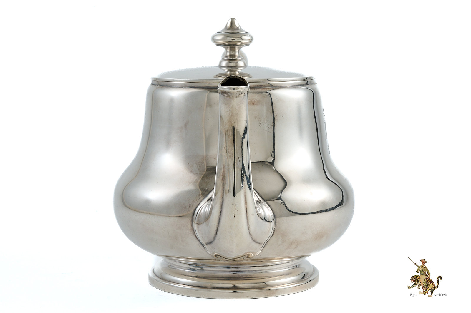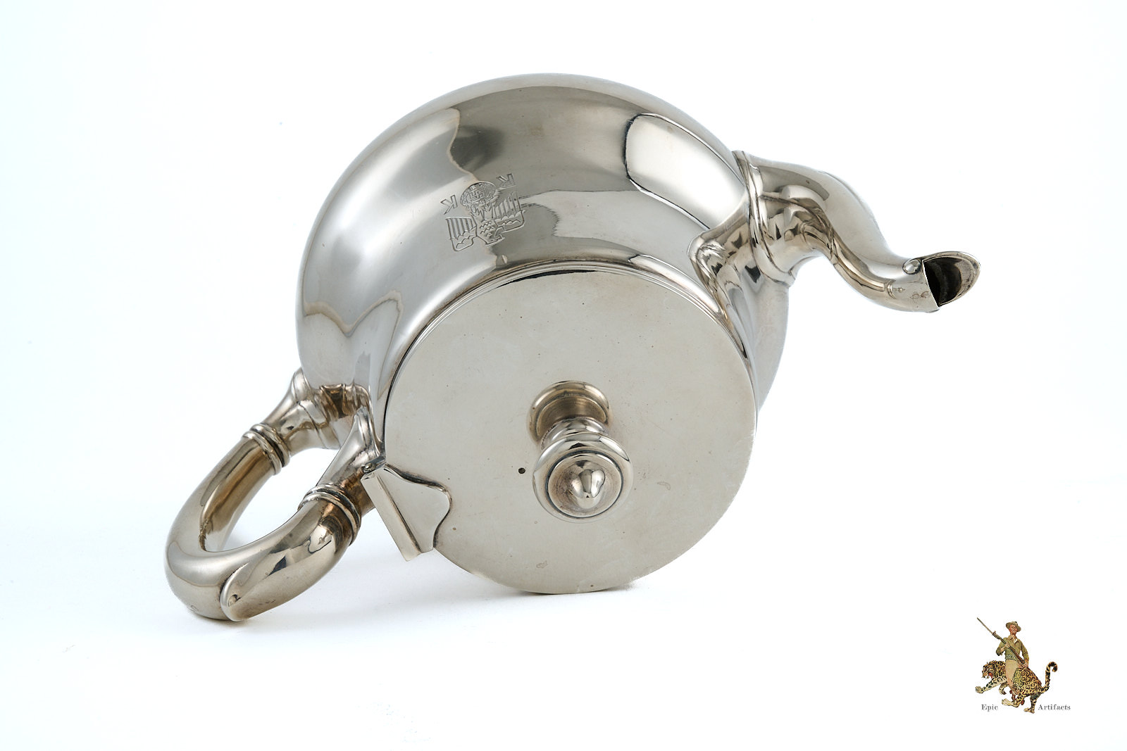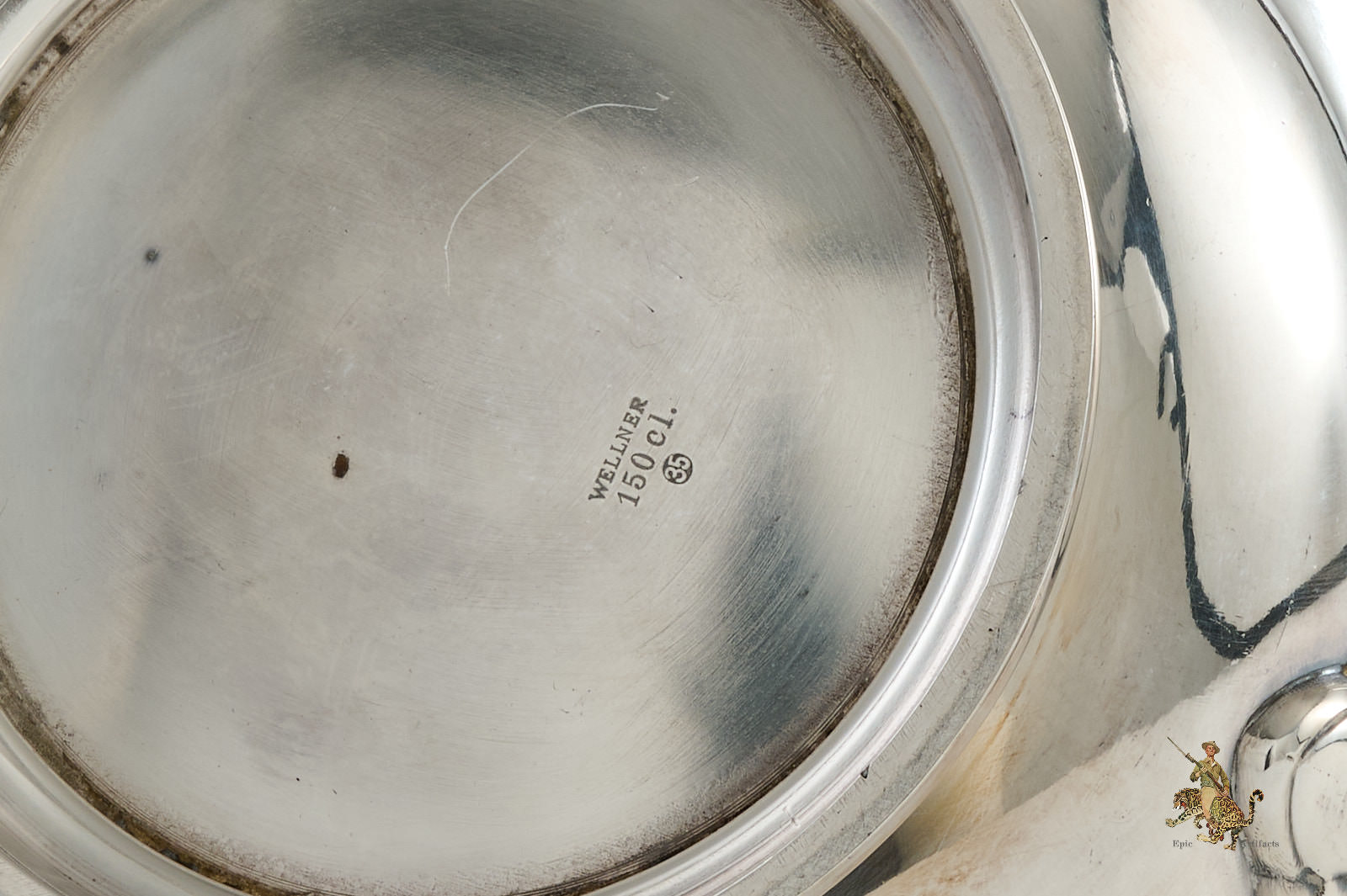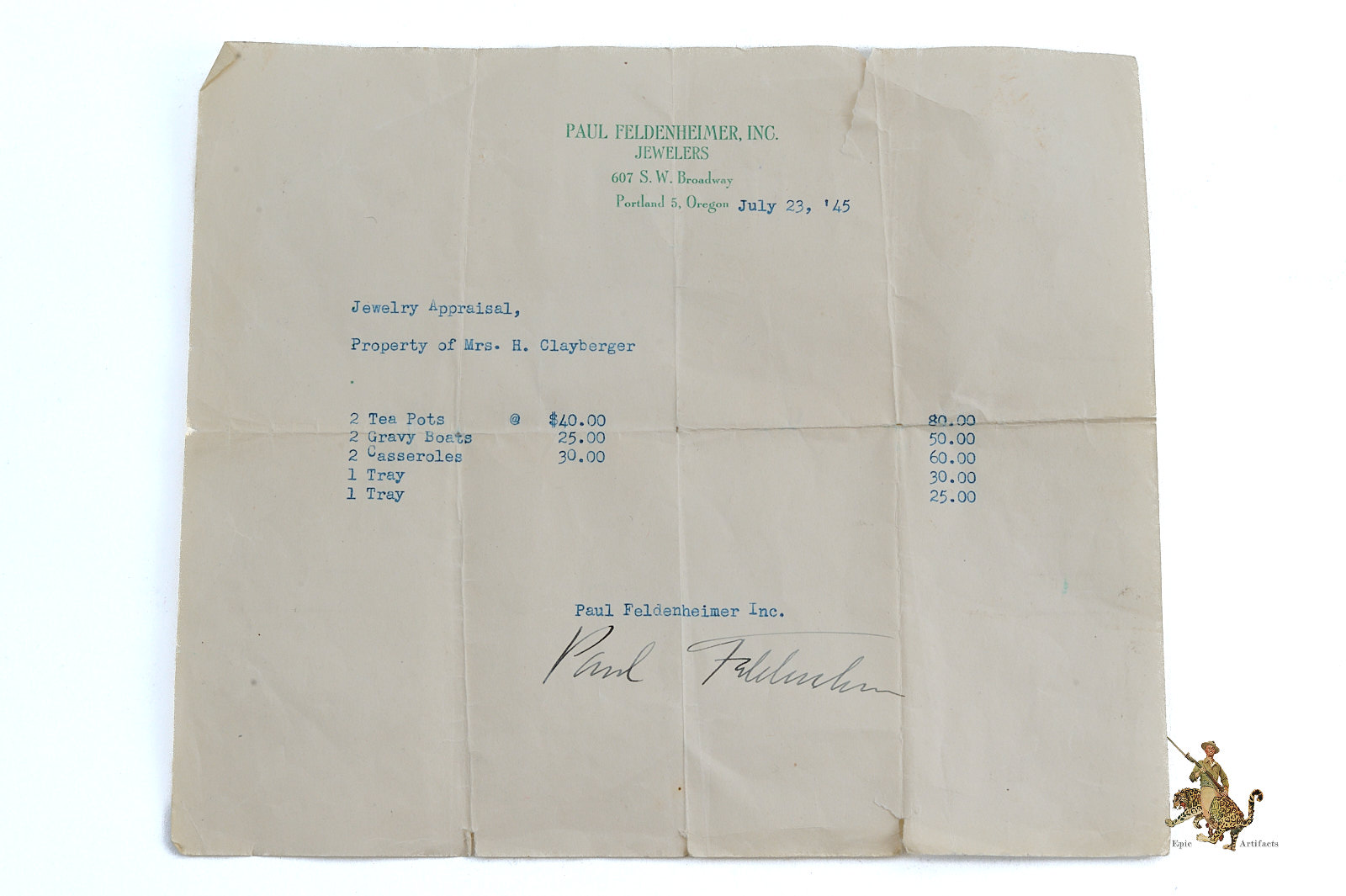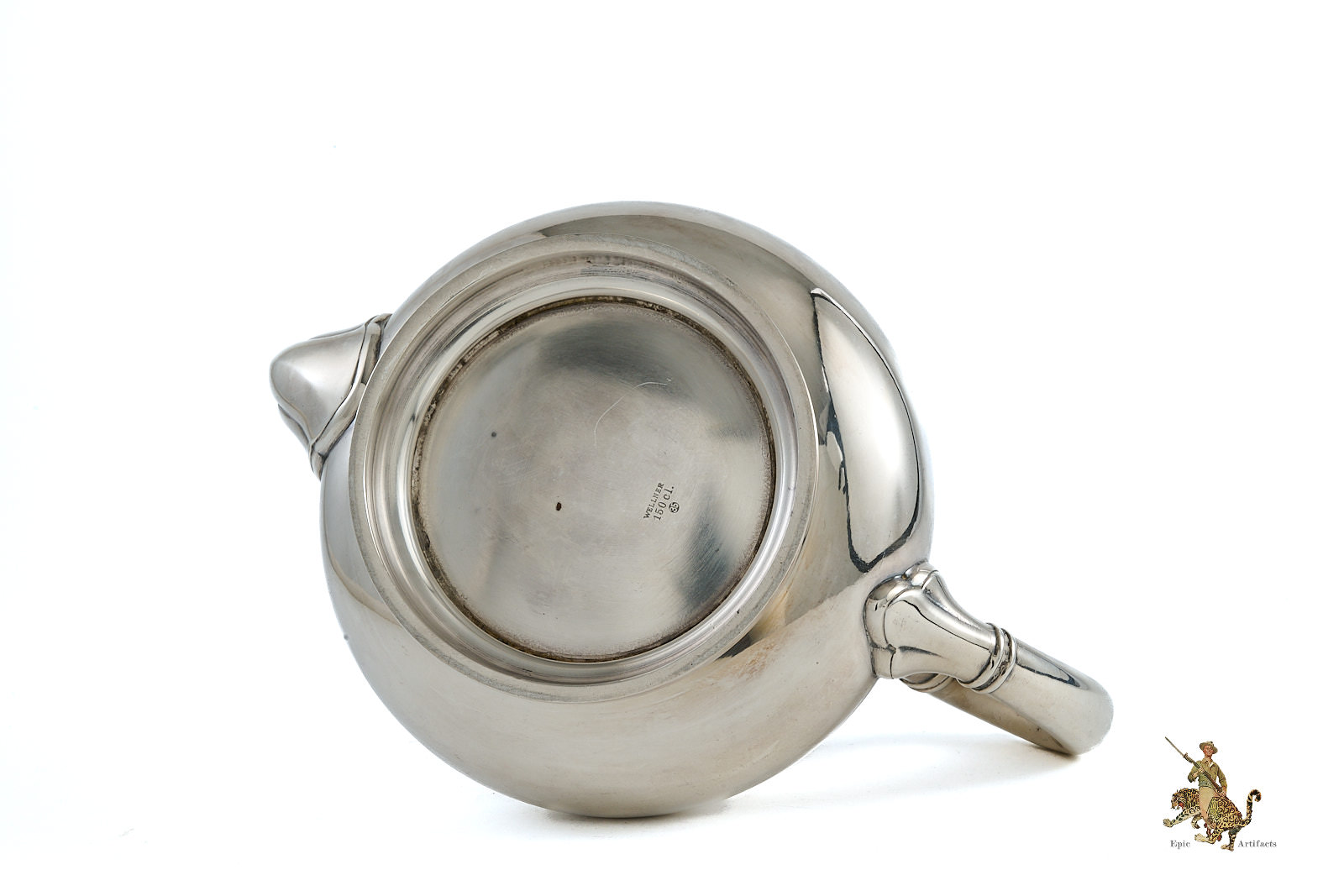 The underside is stamped with the Wellner maker’s mark, along with “39” denoting the year of manufacture. The piece remains in near mint condition, exhibiting minimal signs of handling and retaining strong visual appeal throughout. Accompanying the tea pot is a copy of a jewelry appraisal dated July 23, 1945, issued by Paul Feldenheimer Inc. of Portland, Oregon, for Mrs. H. Clayberger, identified as a relative of the soldier who returned the item, adding a compelling layer of early post-war provenance.