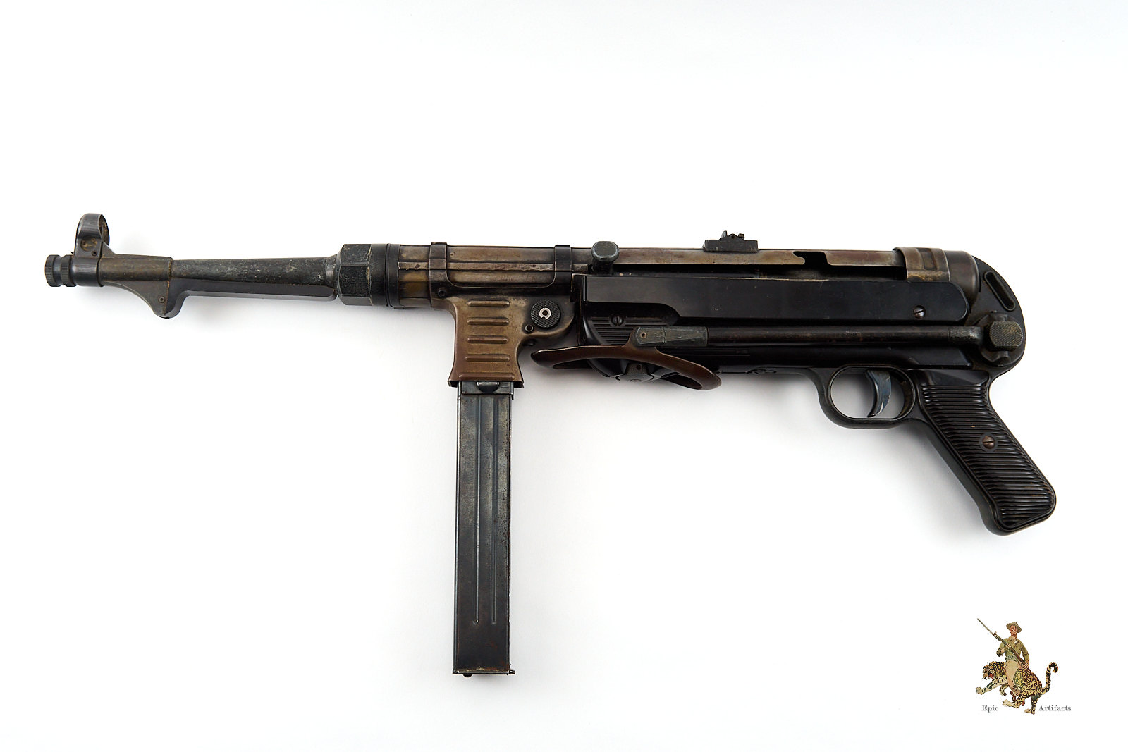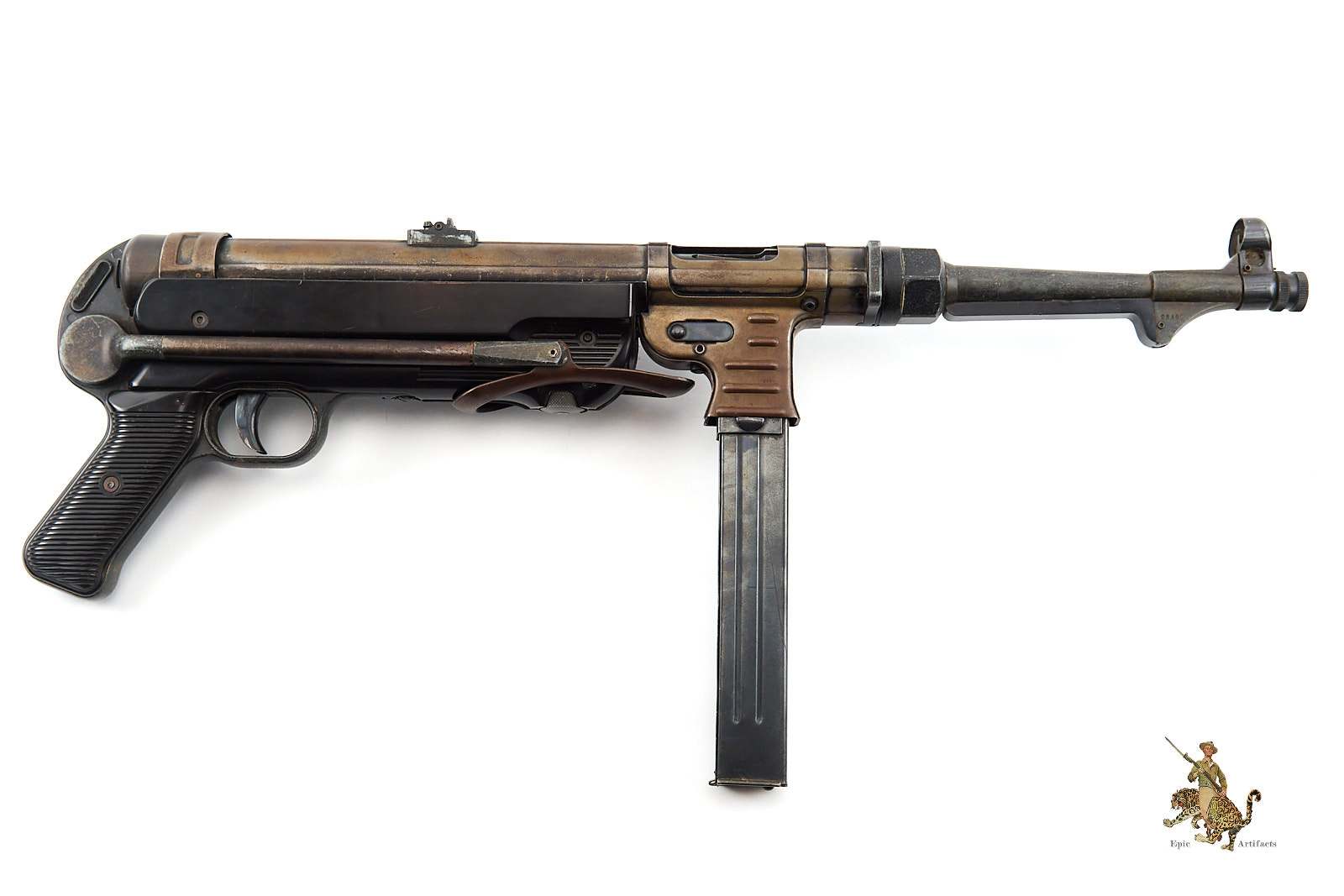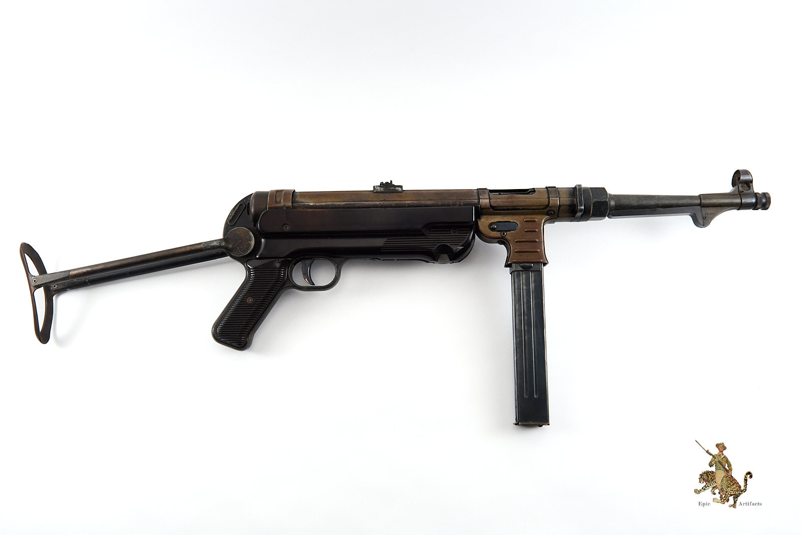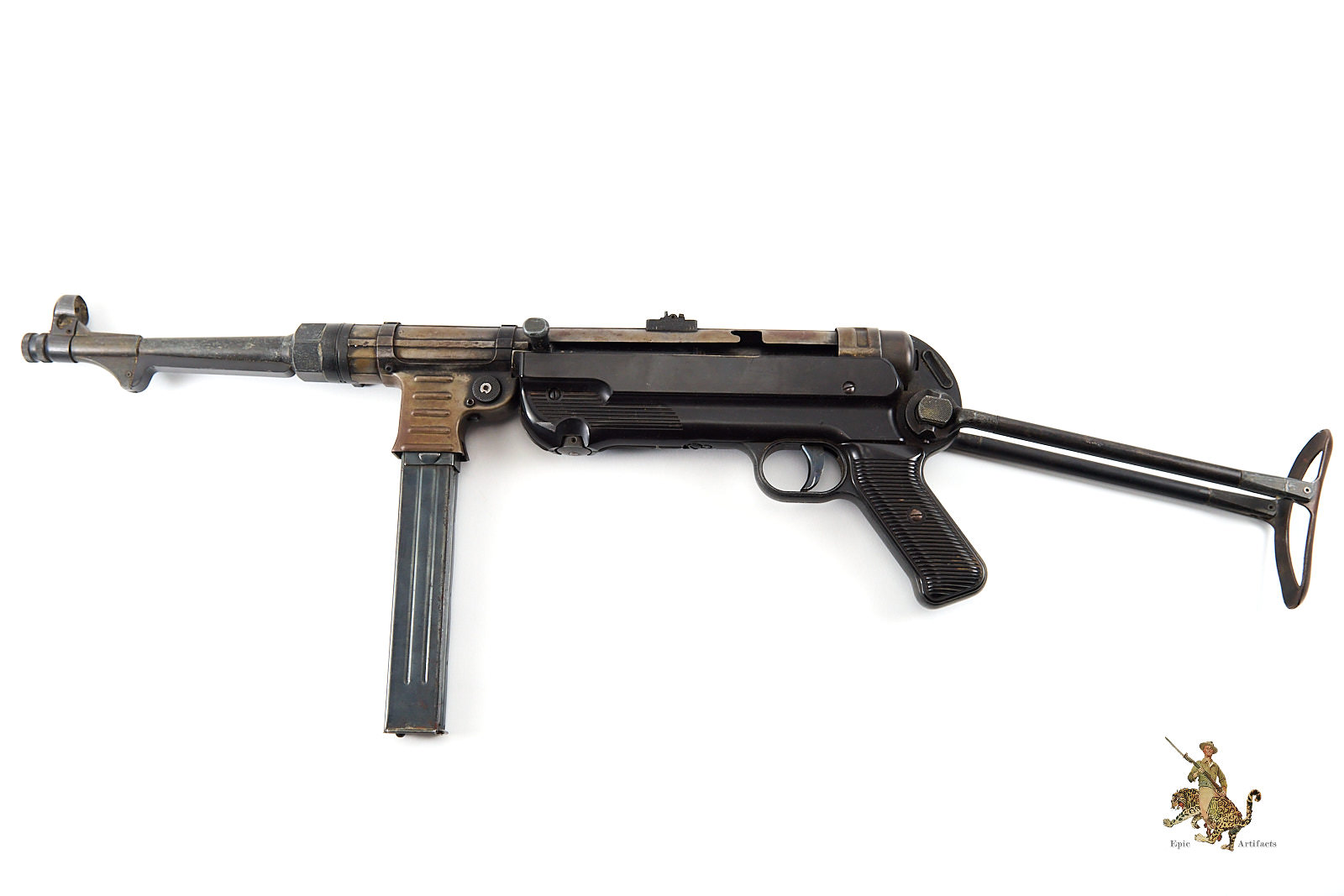 Historical Description: The Maschinenpistole 40 (MP40) is one of the most iconic firearms of the Second World War and a defining weapon of the German Wehrmacht. Developed by Heinrich Vollmer and introduced in 1940 as a refinement of the MP38, it was manufactured primarily by Erma Werke and Steyr-Daimler-Puch. Chambered in 9×19mm Parabellum and firing from an open bolt in fully automatic mode, the MP40 featured extensive use of stamped steel components, allowing for efficient mass production. Its folding metal stock and manageable rate of fire made it especially suited to mechanized infantry, paratroopers, and armored vehicle crews.