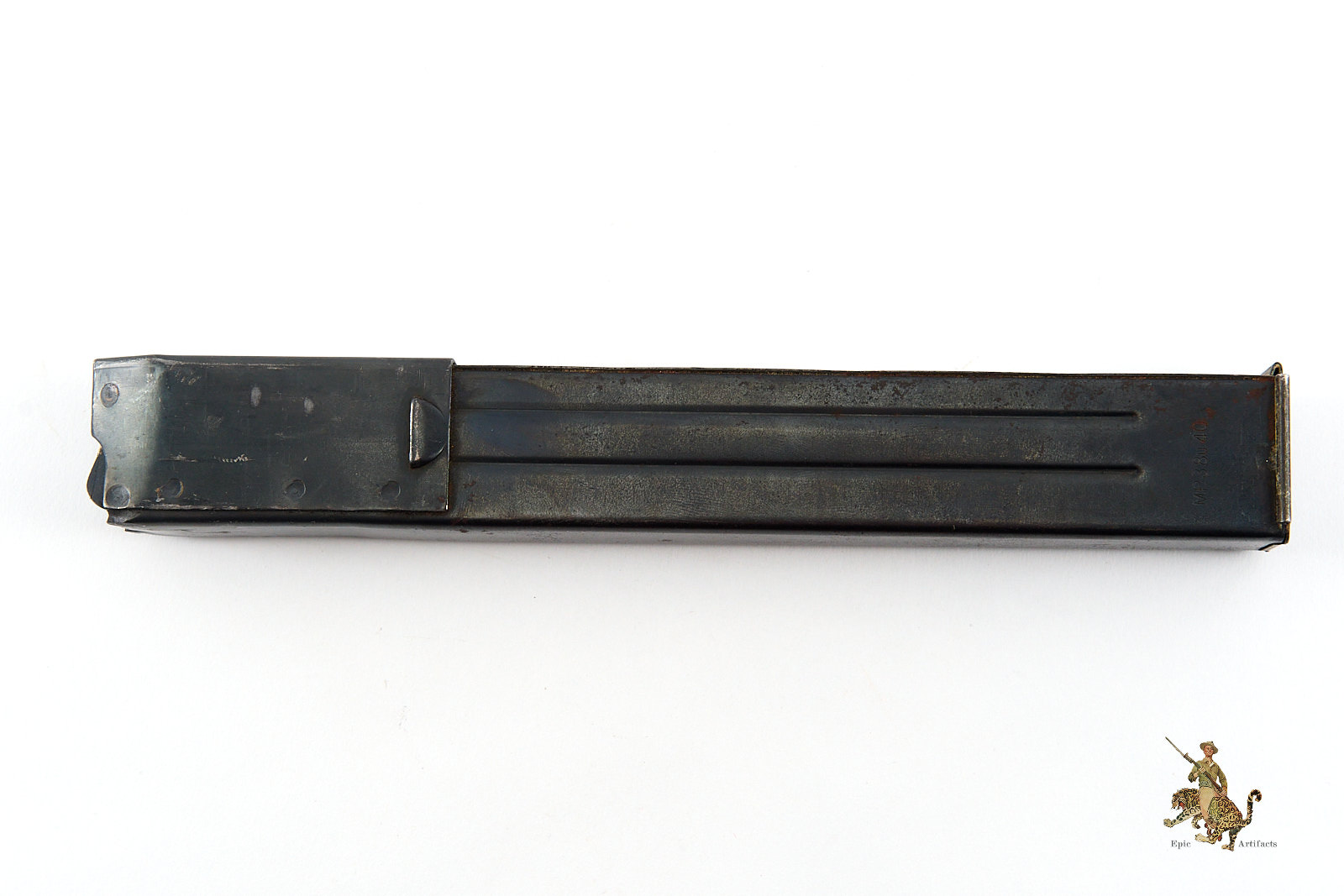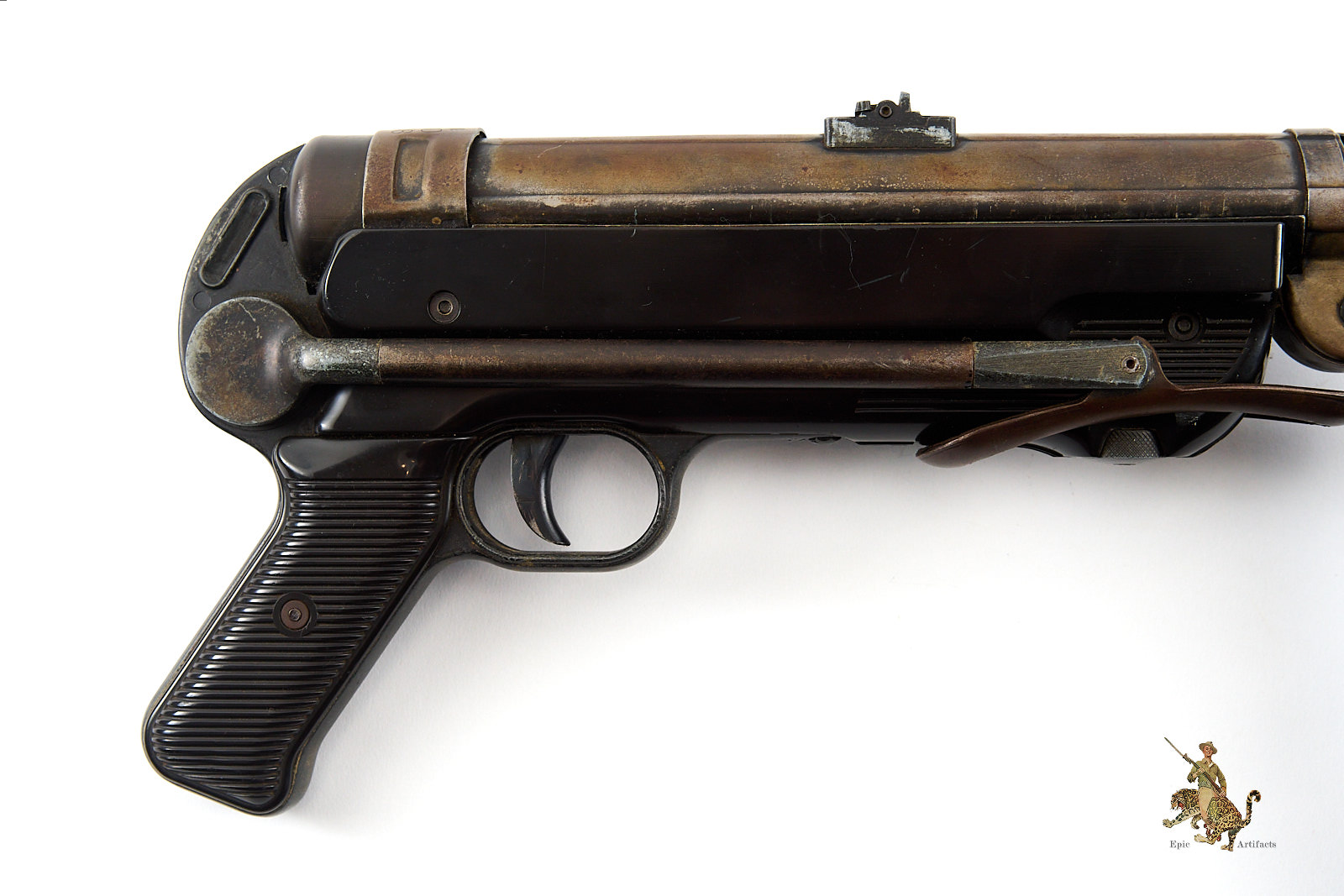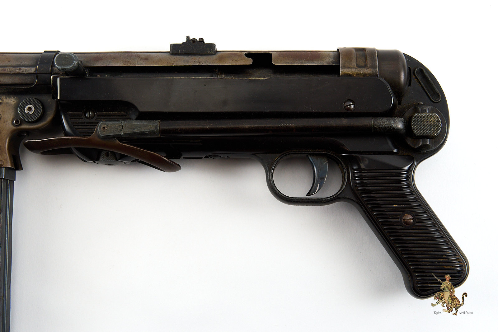 Historical Description: The Maschinenpistole 40 (MP40) is one of the most iconic firearms of the Second World War and a defining weapon of the German Wehrmacht. Developed by Heinrich Vollmer and introduced in 1940 as a refinement of the MP38, it was manufactured primarily by Erma Werke and Steyr-Daimler-Puch. Chambered in 9×19mm Parabellum and firing from an open bolt in fully automatic mode, the MP40 featured extensive use of stamped steel components, allowing for efficient mass production. Its folding metal stock and manageable rate of fire made it especially suited to mechanized infantry, paratroopers, and armored vehicle crews.