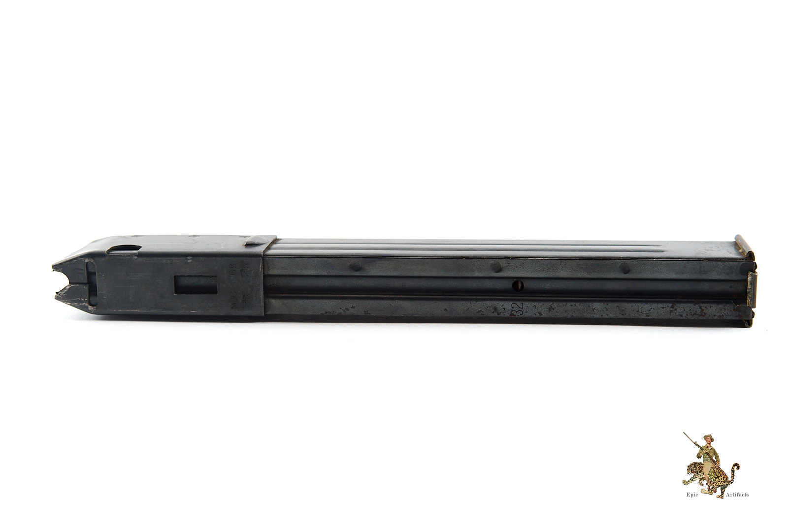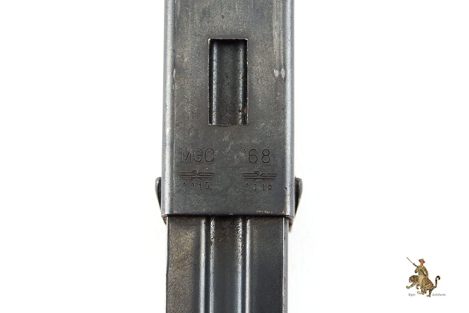 Designed to operate with replica cartridges fitted with cap “plugs,” the model features a functioning replica bolt that detonates the caps and ejects the cartridges in a manner closely analogous to live fire operation. (The cartridge plugs and caps are not present.) The barrel bears the serial number 08491, while the reverse of the magazine is crisply marked “MP40 / MGC 68,” widely understood to denote the year of manufacture.