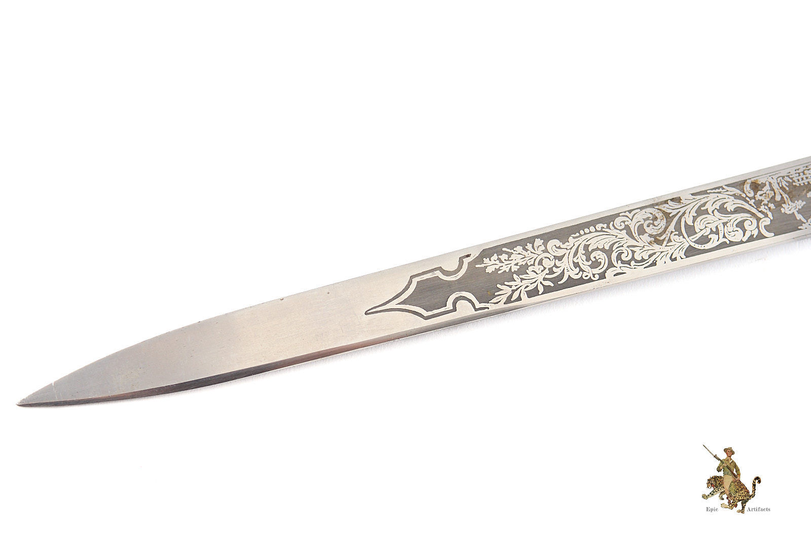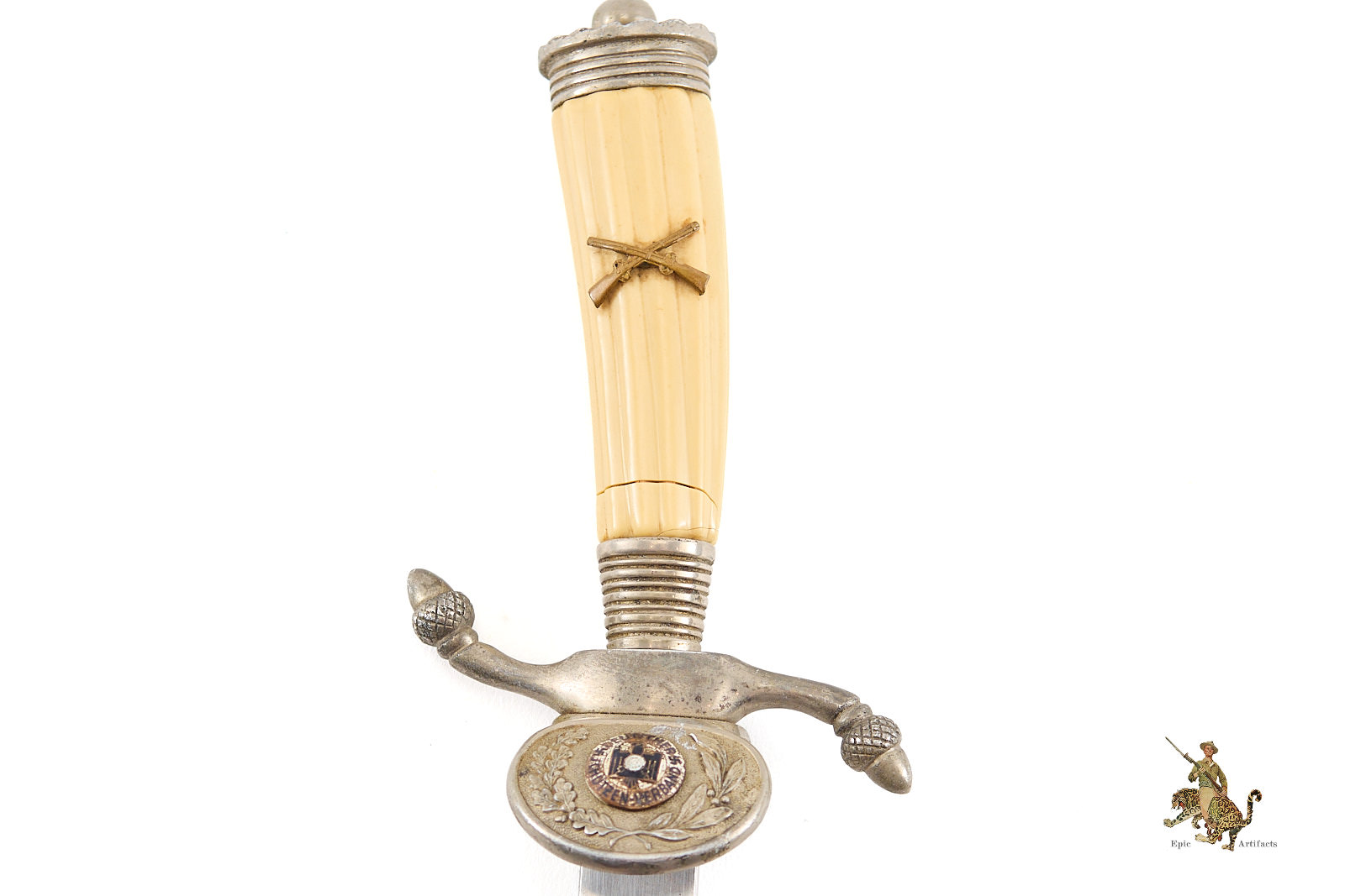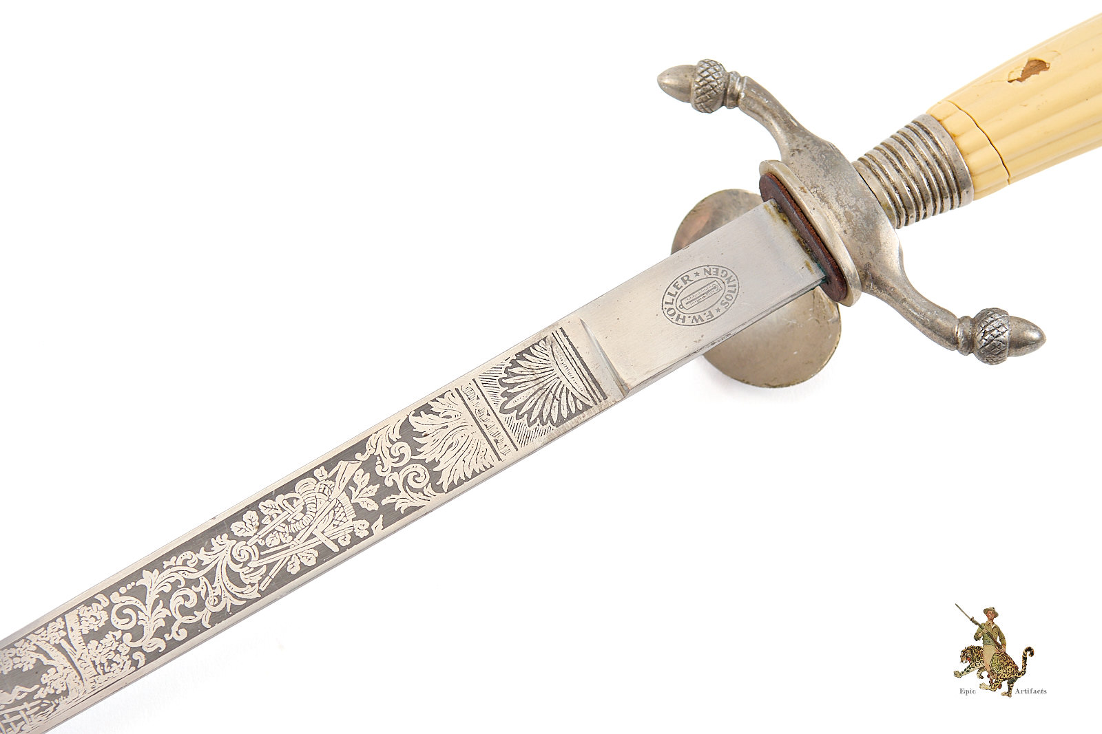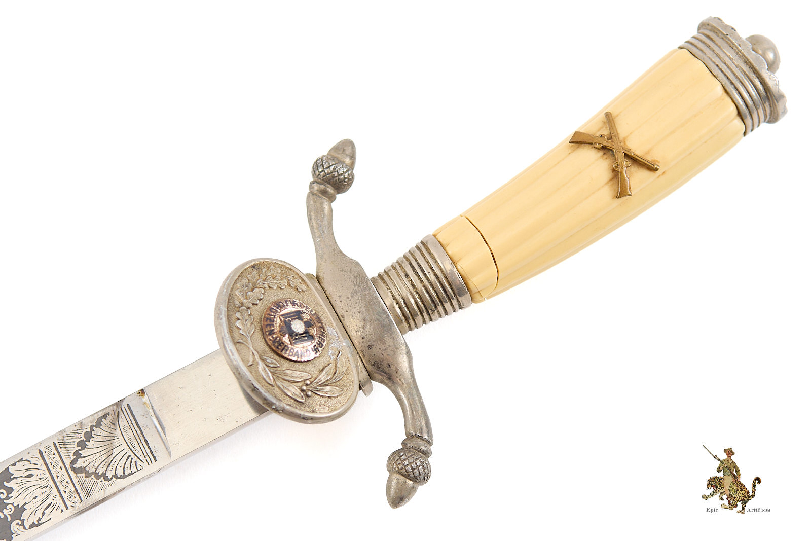 Product Description: A rare Rifle Association Dagger by Holler, highly sought after and notably absent from many collections. The blade is elegantly etched on both sides, exhibiting crisp detail with only minimal age patina, and is stamped on the reverse with Holler’s distinctive “thermometer” maker’s mark. The handle retains plated fittings and a cream-colored grip, which shows a puncture and crack; the original crossed rifle emblem has been replaced with a U.S. Infantry rifle insignia, likely installed by a returning American veteran.