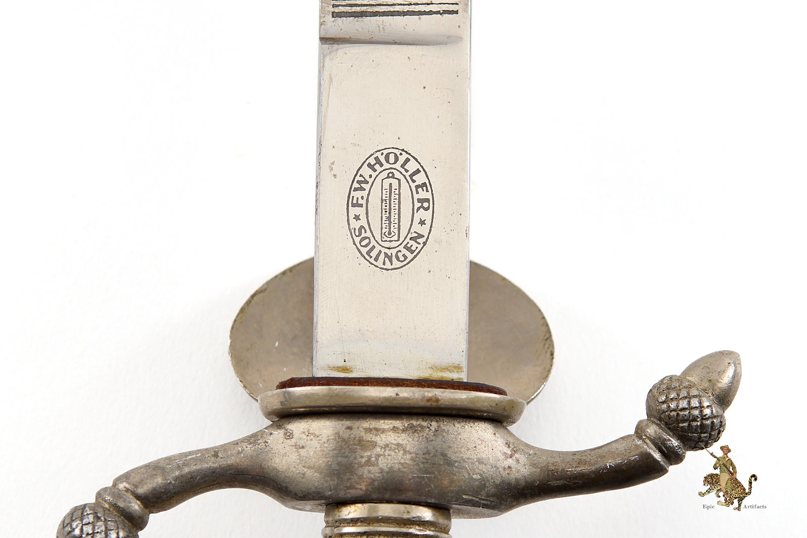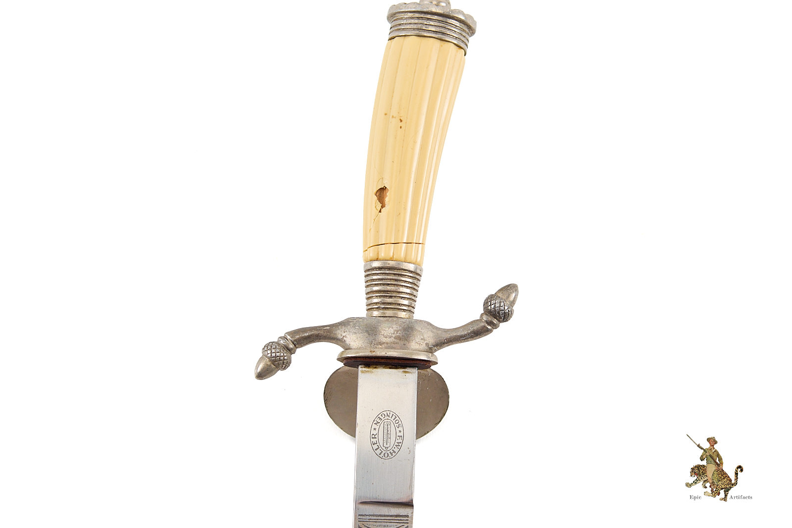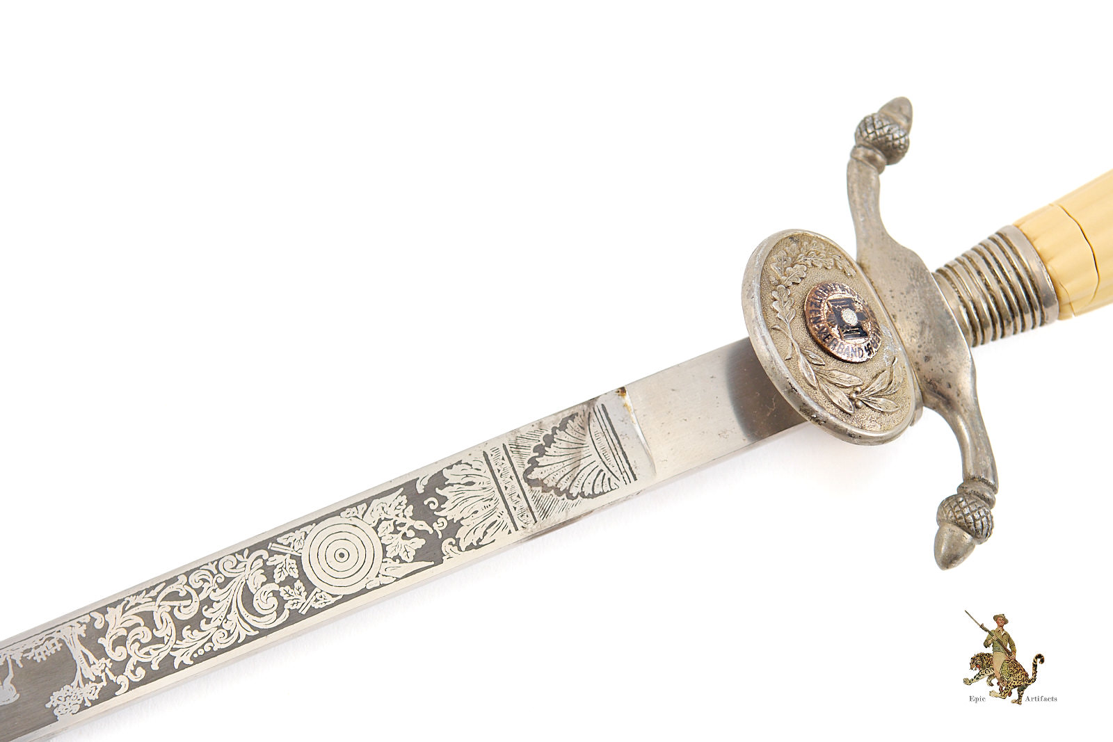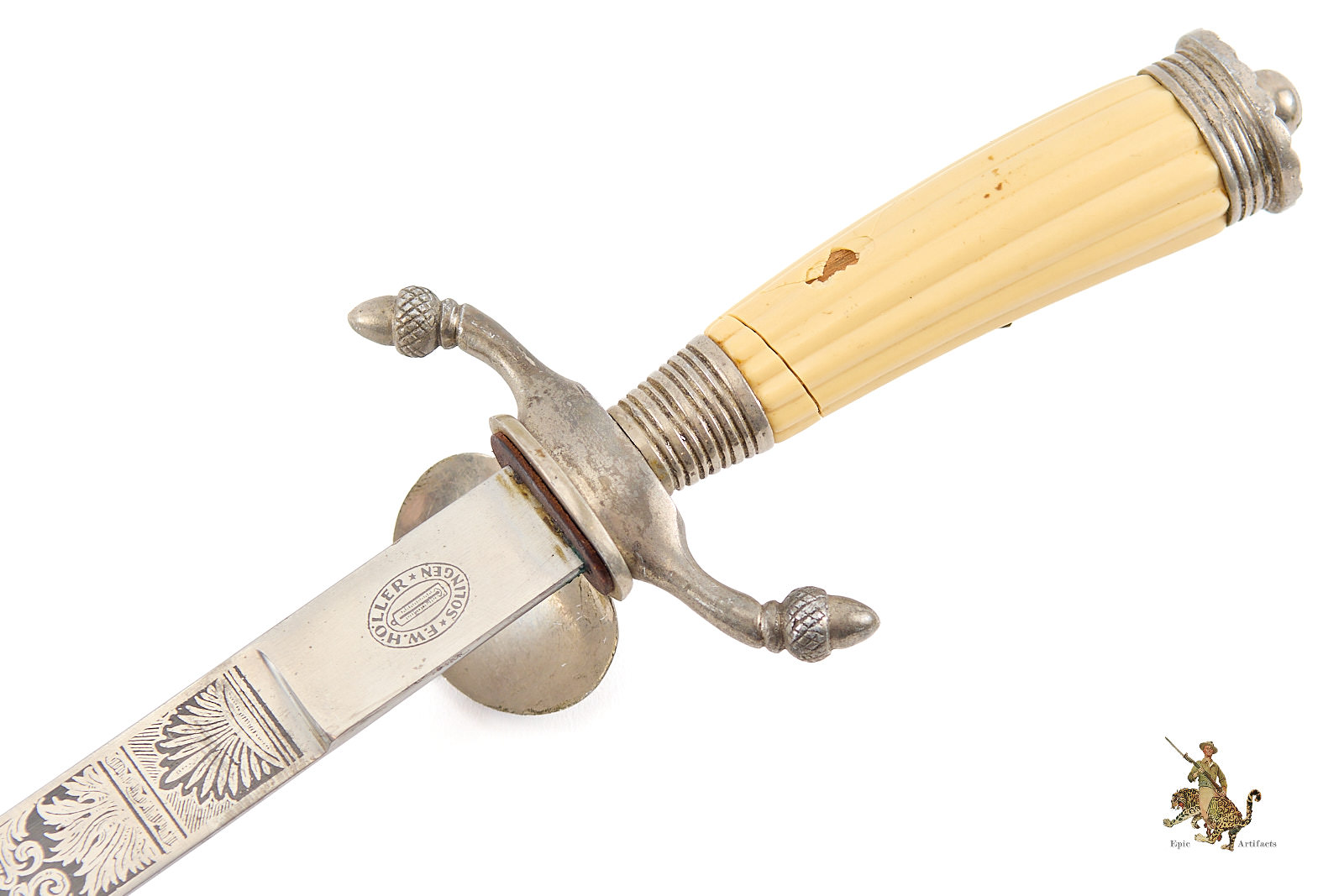 Product Description: A rare Rifle Association Dagger by Holler, highly sought after and notably absent from many collections. The blade is elegantly etched on both sides, exhibiting crisp detail with only minimal age patina, and is stamped on the reverse with Holler’s distinctive “thermometer” maker’s mark. The handle retains plated fittings and a cream-colored grip, which shows a puncture and crack; the original crossed rifle emblem has been replaced with a U.S. Infantry rifle insignia, likely installed by a returning American veteran.