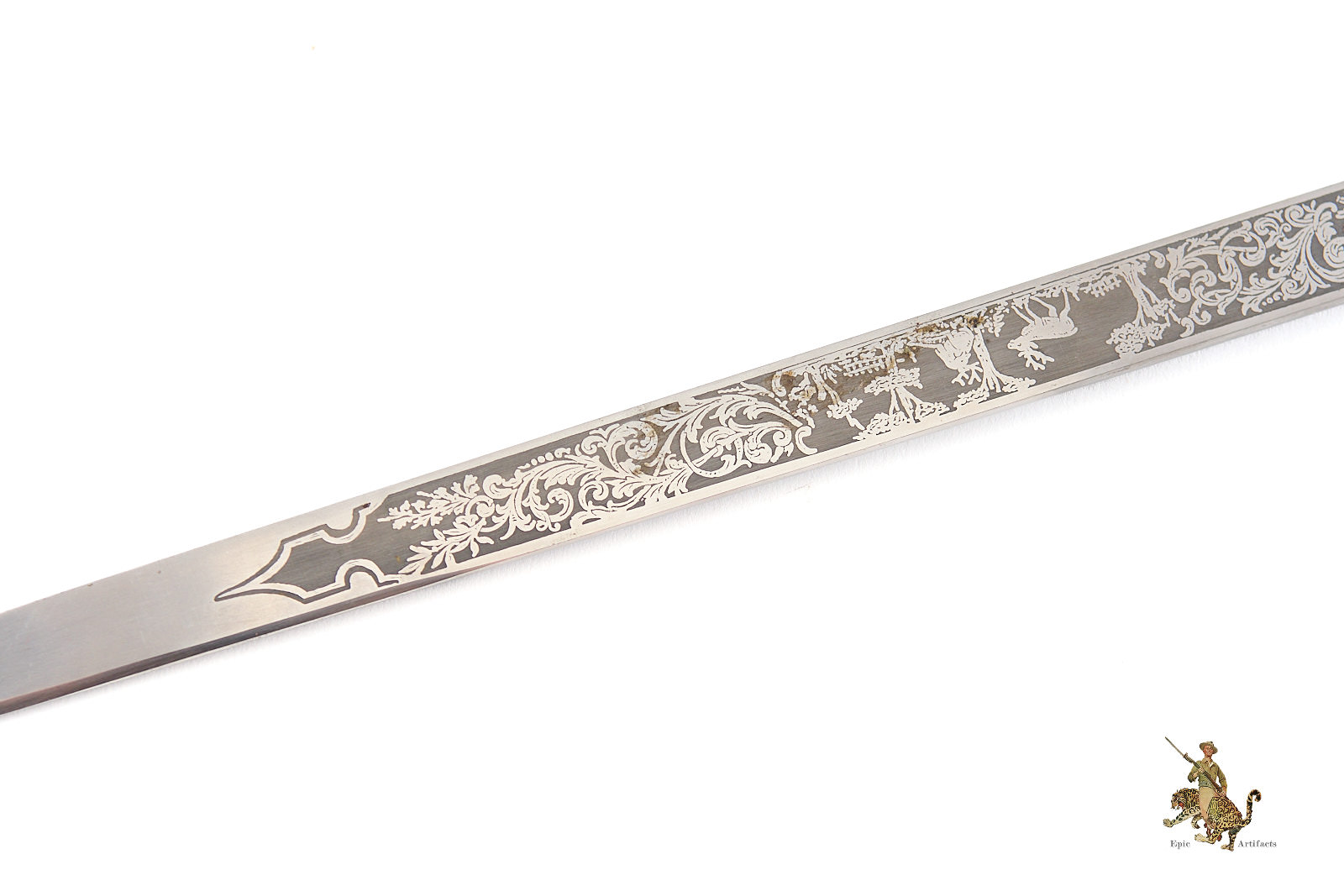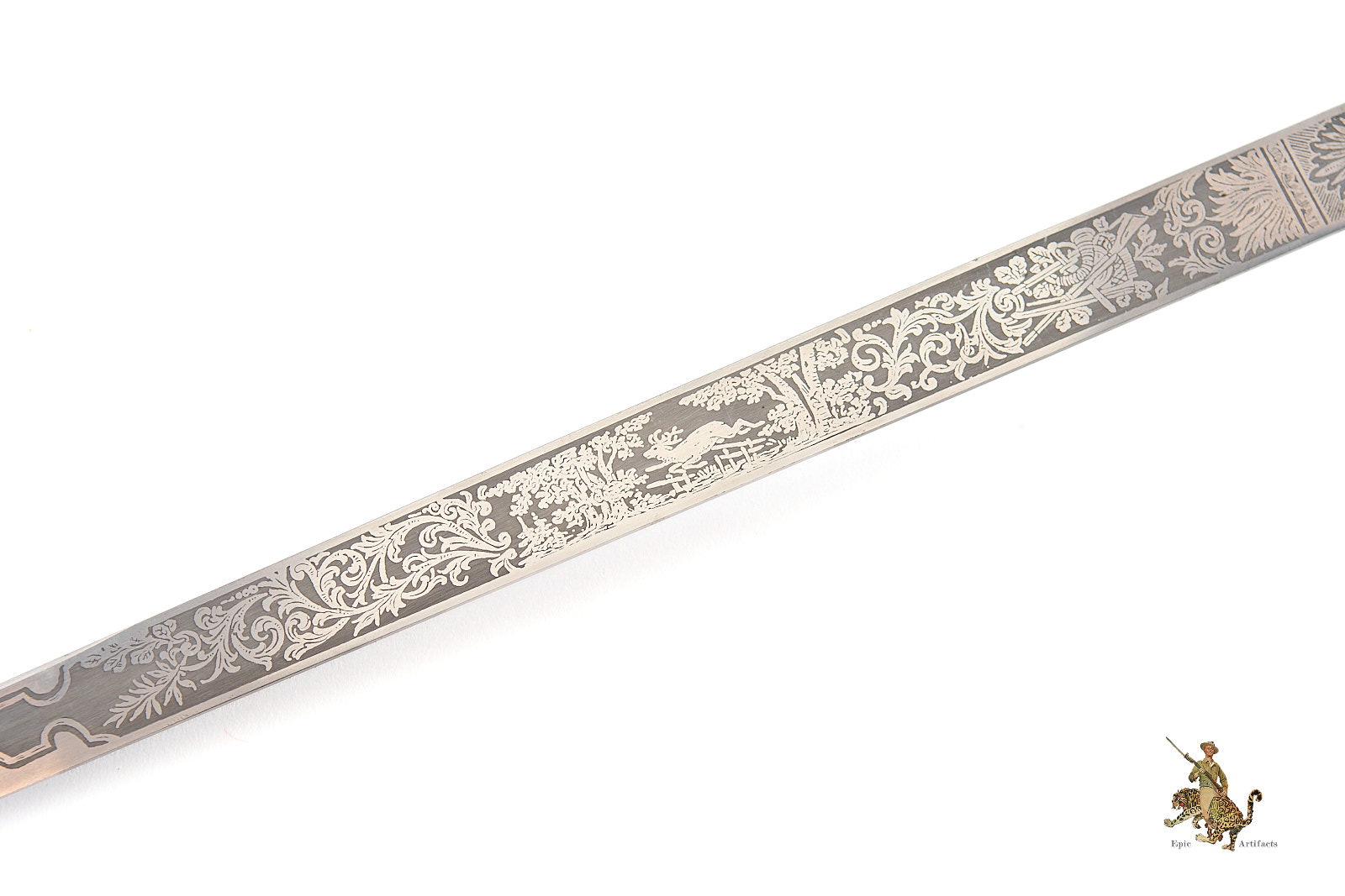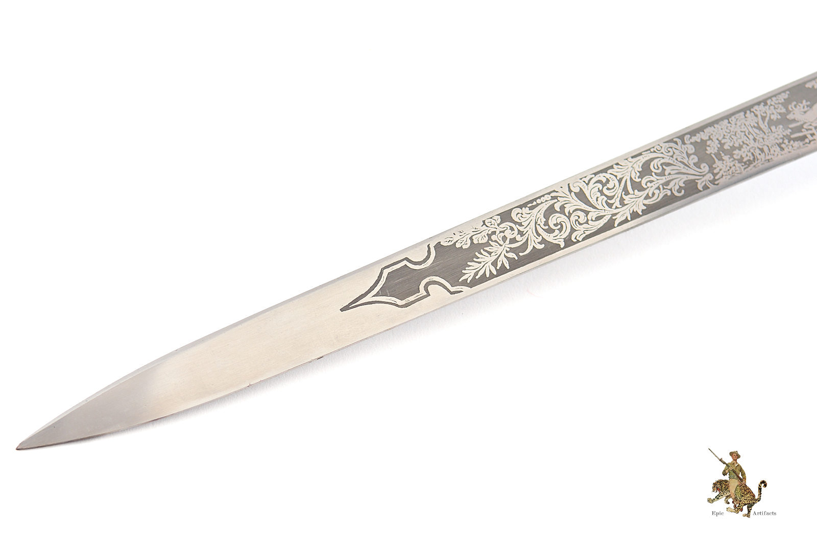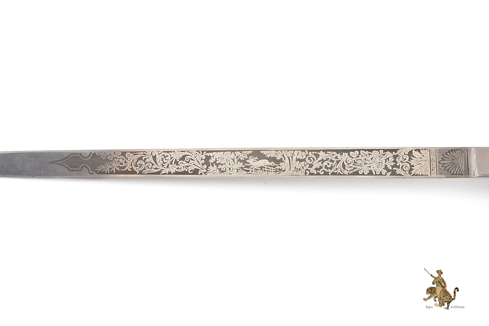 Product Description: A rare Rifle Association Dagger by Holler, highly sought after and notably absent from many collections. The blade is elegantly etched on both sides, exhibiting crisp detail with only minimal age patina, and is stamped on the reverse with Holler’s distinctive “thermometer” maker’s mark. The handle retains plated fittings and a cream-colored grip, which shows a puncture and crack; the original crossed rifle emblem has been replaced with a U.S. Infantry rifle insignia, likely installed by a returning American veteran.