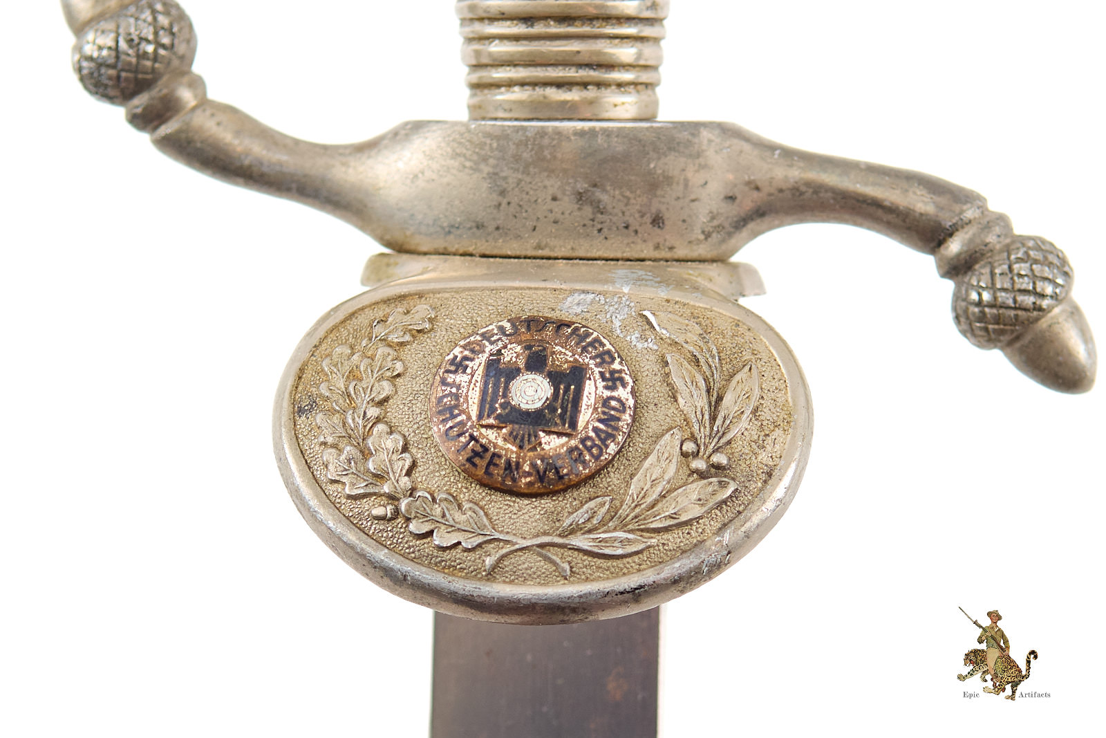 Accompanied by its original brown leather blade buffer, fully intact, the dagger is missing the original scabbard. Despite the condition issues of the grip, this Rifle Association Dagger by Holler remains a rare and historically significant example of mid-20th-century marksmanship regalia, combining fine craftsmanship with a unique narrative of wartime provenance.