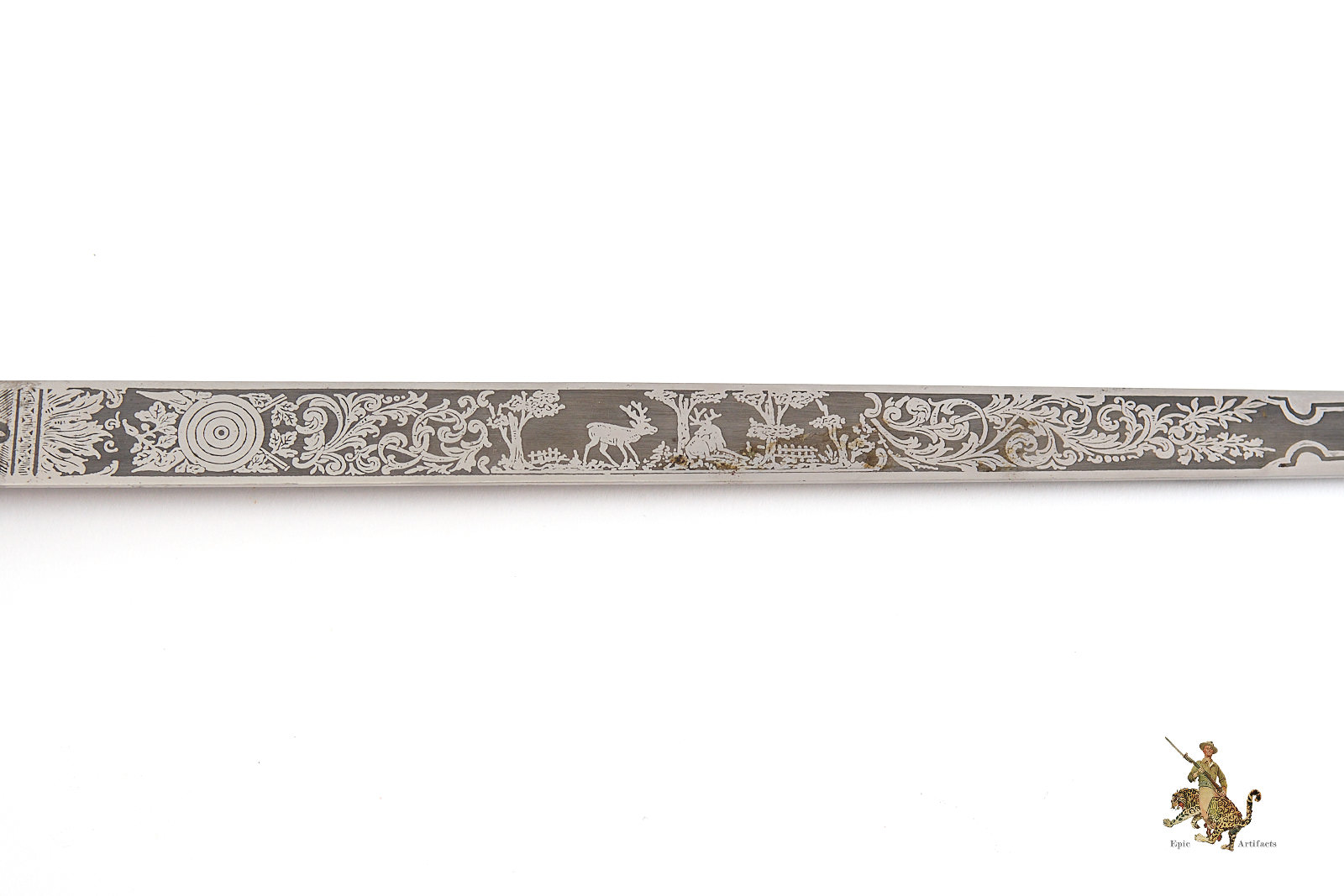 Historical Description: Hunting is a sport with a long tradition in Germany. As with any long tradition, it grew to become a practice steeped in ritual. Hunters generally were members of hunting clubs and organizations, which had permission to hunt specific state-owned forests, under the auspices of forestry organizations. Both the members of the hunting clubs, and those involved in forestry, had traditional hunting clothes, a sort of regalia that by the time of the Third Reich, had evolved into a uniform. These men carried traditional hunting daggers and cutlasses as part of their regalia. These was an almost infinite variety of these edged weapons, made by many makers, and available in countless styles to suit individual preferences. Some of these hunting daggers and cutlasses were mostly utilitarian and practical. They were used for the final thrust at the close of a successful hunt. Others were ornate, with detailed ornamentation, and were used for formal and ceremonial occasions when the traditional regalia were worn. These edged weapons were expensive and very personal objects for their original owners.