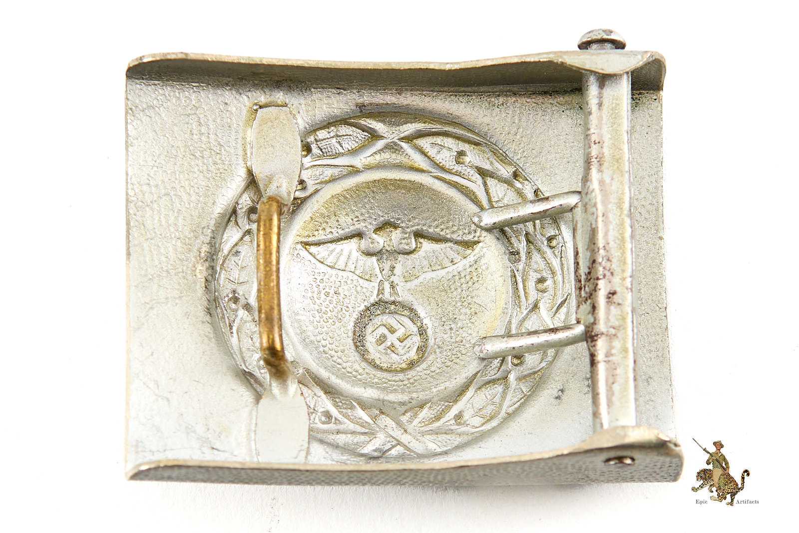 Historical Description: The belt buckle was an important part of the regalia worn by all uniformed military, civil, political, and paramilitary organizations during the Third Reich. The belt (“Koppel”) was part of the uniform and would always be worn while on duty. The belt buckle (“Koppelschloss”) was generally specific to each organization, with many organizations having separate belt buckles for officers and for enlisted personnel, sometimes with different colors and finishes to further denote specific purposes. The buckles were adorned with various mottos and designs specific to the organizations for which they were intended. Many designs used the German national eagle emblem, in a variety of forms. Belt buckles were worn with uniforms ranging from finely tailored officer parade uniforms, to the issue uniforms of enlisted soldiers in combat. Generally speaking, most German belt buckles of the Third Reich were made with two prongs on the reverse, to allow the buckle to be worn and adjusted on a belt. The buckle had a catch that would mate with a hook on the belt, when worn. The earliest Third Reich buckles were often made of brass, or nickel silver. Later, aluminum became very common, and was used on private purchase as well as enlisted buckles of the German military, with or without a painted or plated finish. After WWII began, most enlisted military buckles were steel. Nazi belt buckles were popular souvenirs for Allied troops who served in Europe. Some types were made by the millions and remain quite common today. Others were made in limited numbers and are very rare.