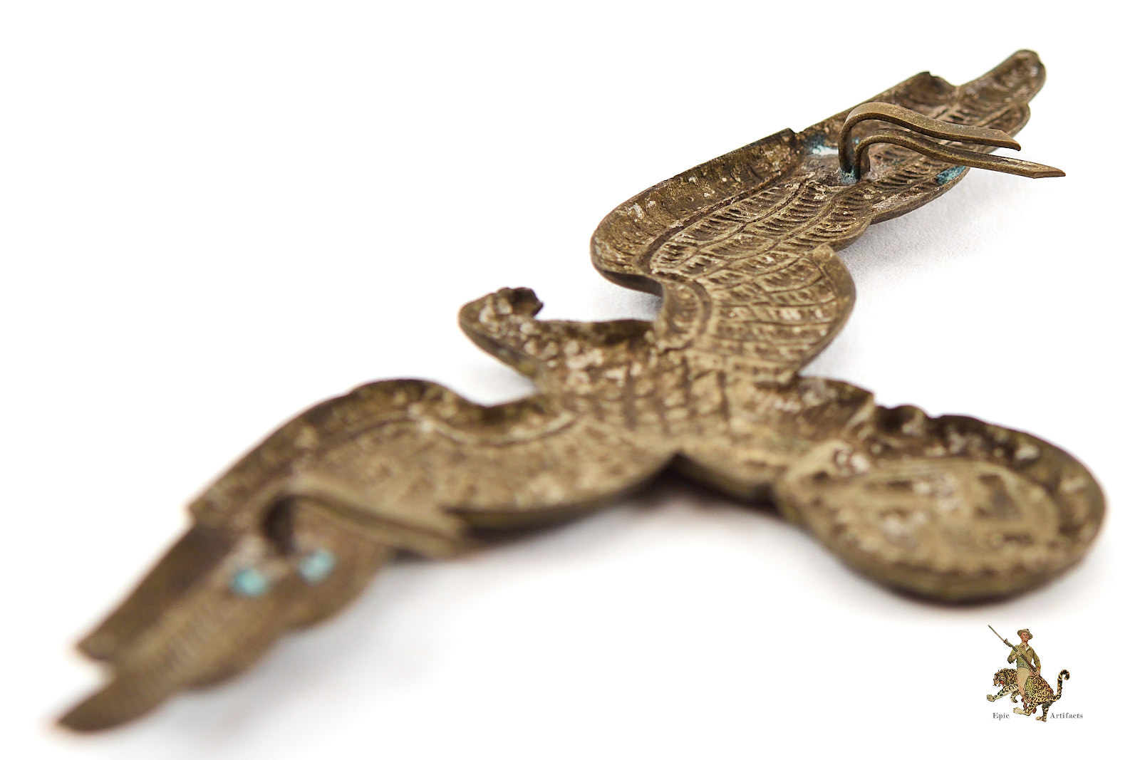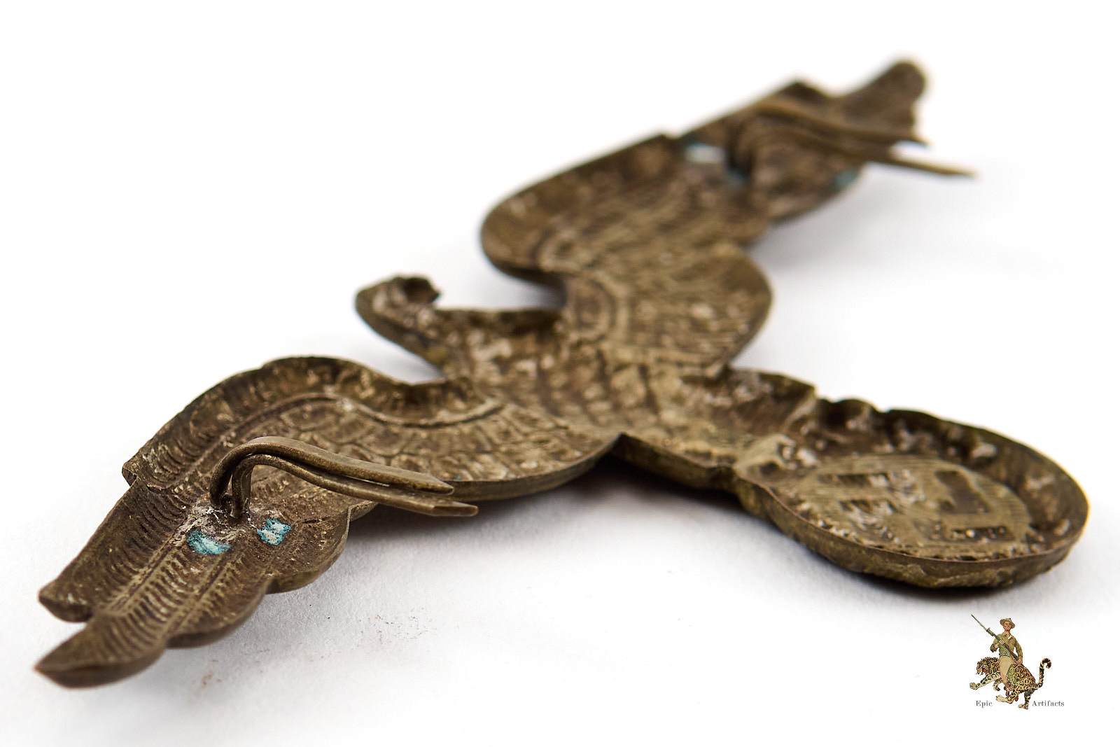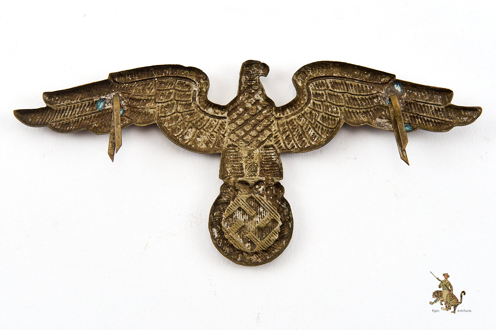 Product Description: This RMBO Visor Cap Eagle is a tough piece of insignia to find. This eagle pattern was used by the Reich Ministry for the Occupied Eastern Territories, the RMBO. It’s a fairly large eagle, measuring approximately 4 3/4″ across wings, with a bold and impressive-looking distinctive eagle and swastika organizational emblem. The eagle is brass tone and appears to be made of Tombak. The reverse of this Eastern People’s Visor Eagle shows RZM mark, but no maker number found. Eagle retains the original attachment prongs, two on each side in good unbroken condition. This scarce eagle remains in excellent condition.
