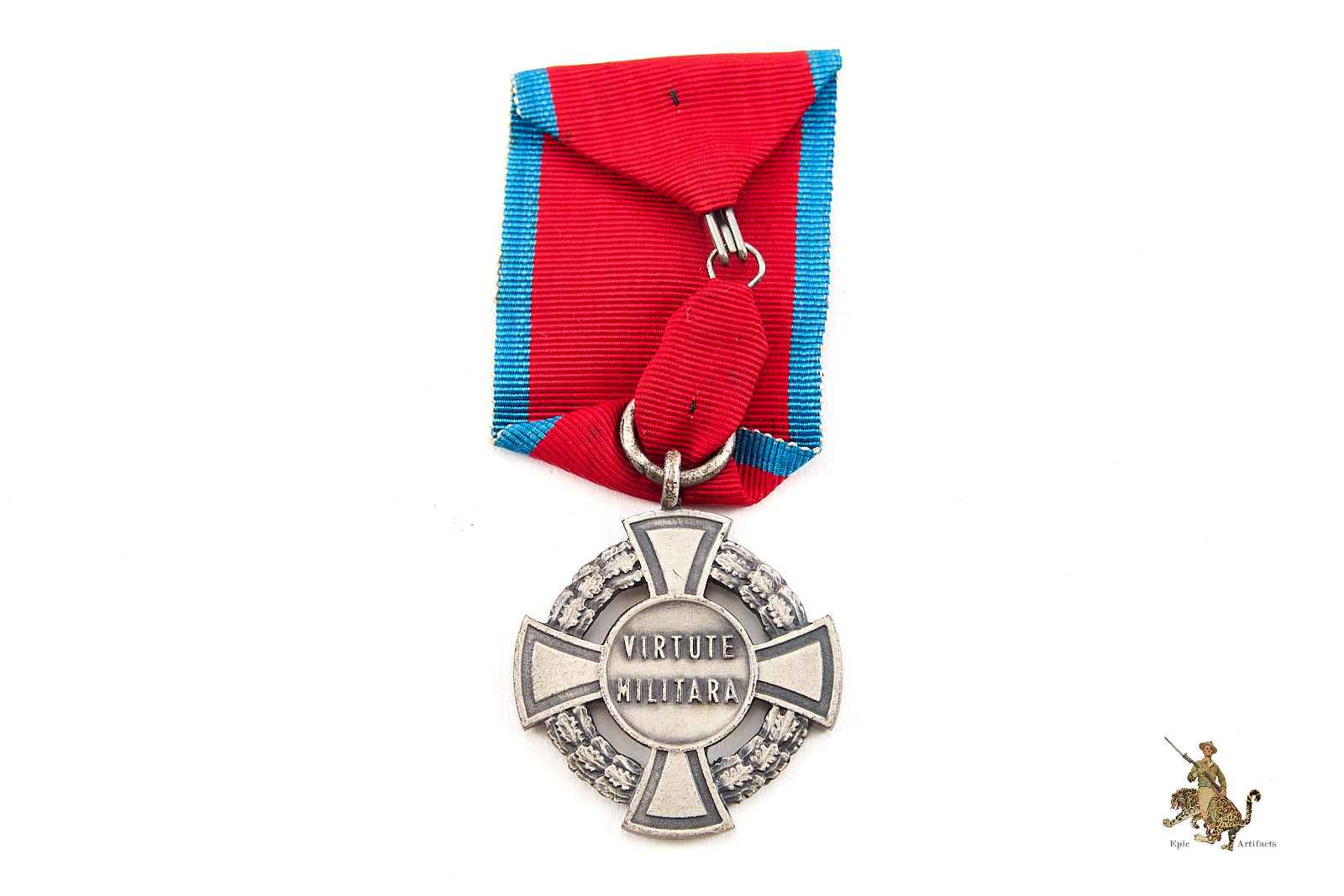 Product Description: A finely preserved example of Romanian military decoration, this Romanian Military Virtue Medal – 2nd Class displays a pleasing, even patina across both obverse and reverse surfaces, reflecting careful preservation over time. The original suspension ribbon remains intact, exhibiting only light signs of age and gentle wear consistent with period use.