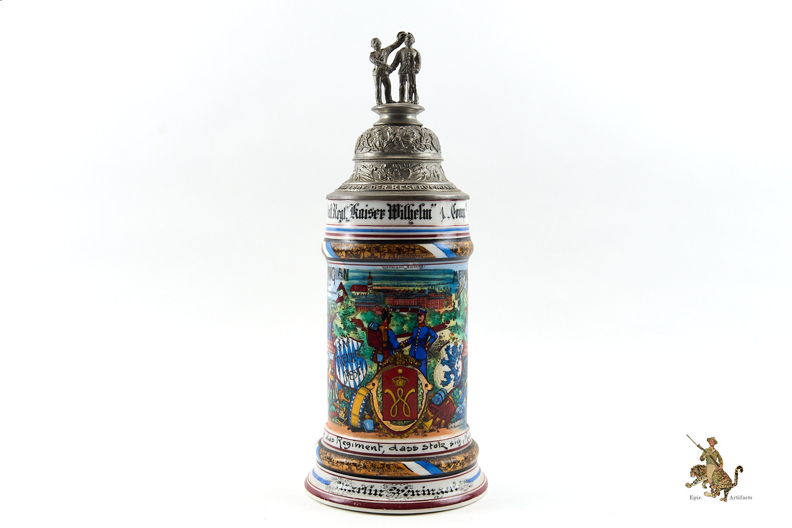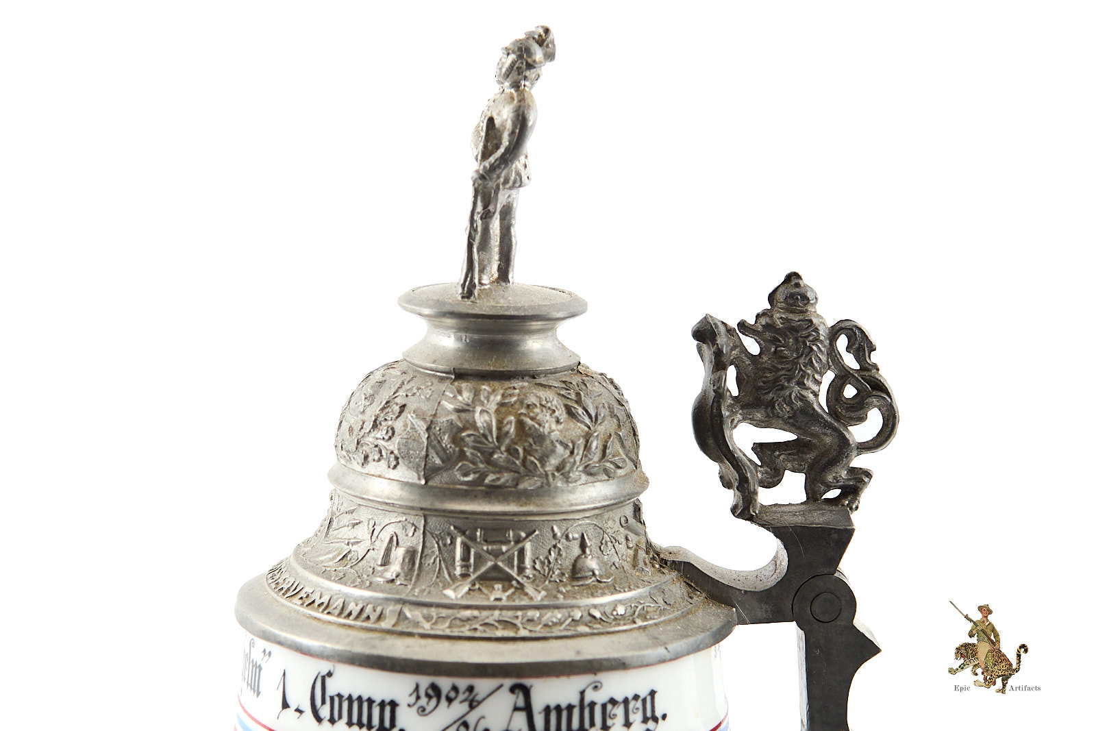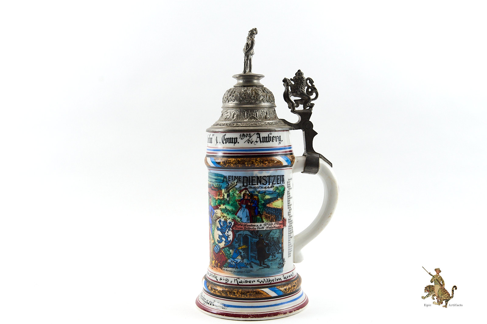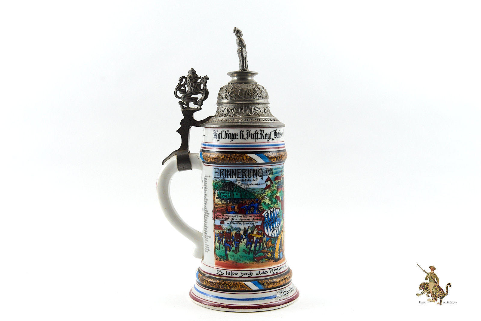 Crafted from porcelain or stoneware, the steins were richly decorated with hand-painted scenes of military life, patriotic emblems, and inscriptions naming the soldier, unit, and service dates. Pewter lids often featured ornate finials—such as soldiers or artillery shells—and some included lithophanes depicting farewells between soldiers and loved ones.