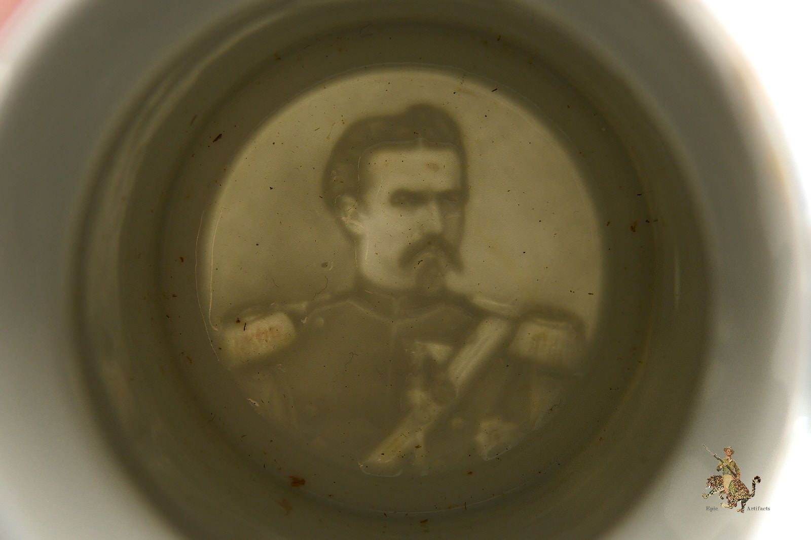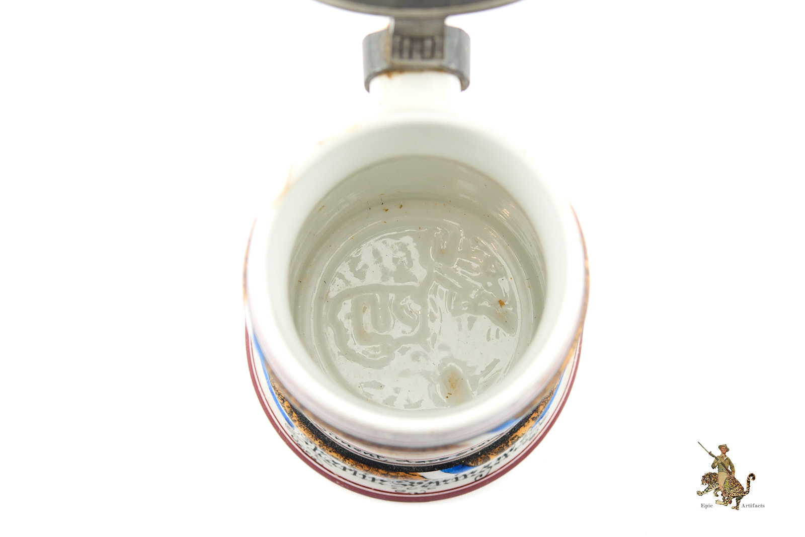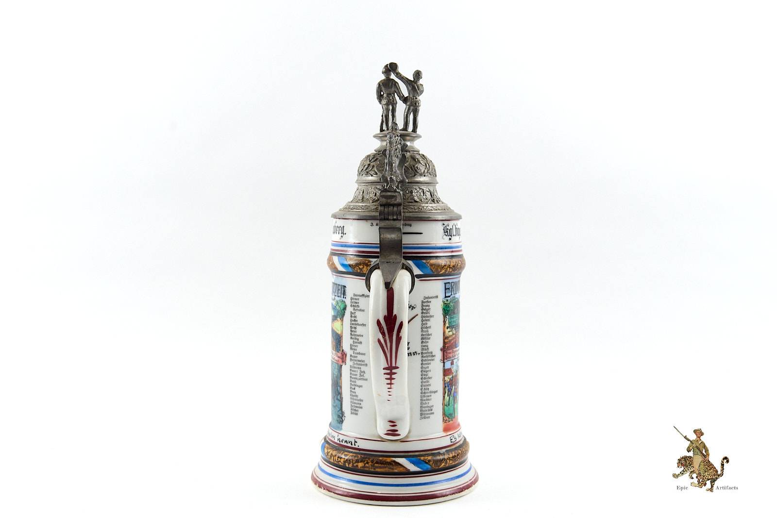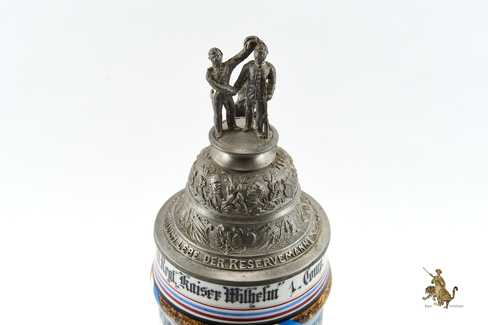 Crafted from porcelain or stoneware, the steins were richly decorated with hand-painted scenes of military life, patriotic emblems, and inscriptions naming the soldier, unit, and service dates. Pewter lids often featured ornate finials—such as soldiers or artillery shells—and some included lithophanes depicting farewells between soldiers and loved ones.