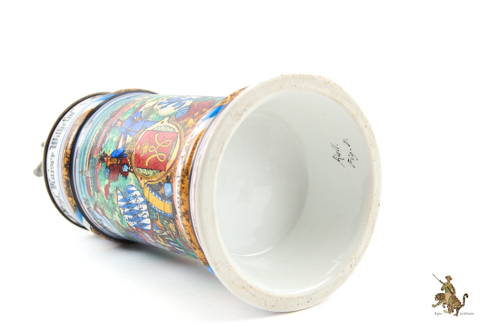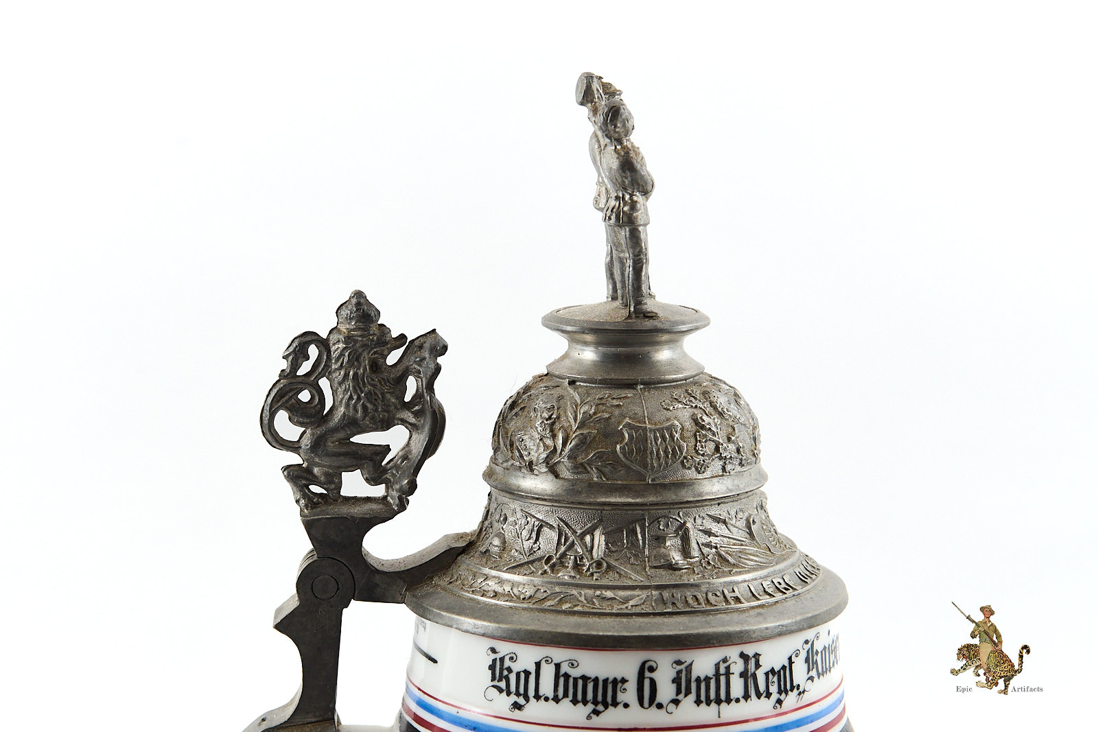 This Royal Bavarian 6th Infantry 1st Co Imperial Stein is an nice example of an infantry regimental stein, notable for its artistry, vivid preservation, and strong provenance to a named soldier. Such pieces offer both historical and aesthetic appeal, reflecting the pride and tradition of service in the Imperial German Army at the dawn of the twentieth century.