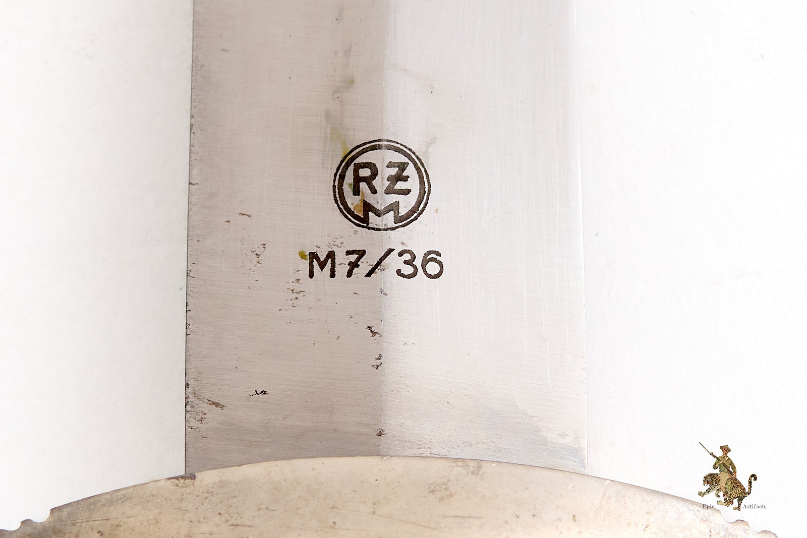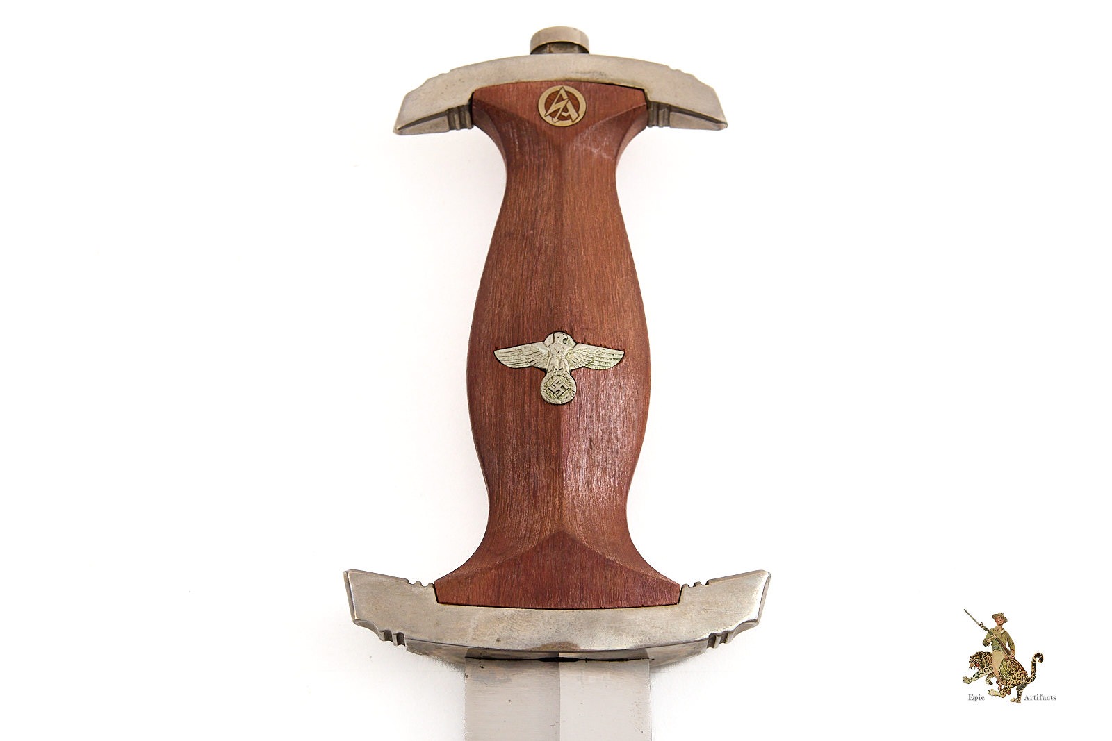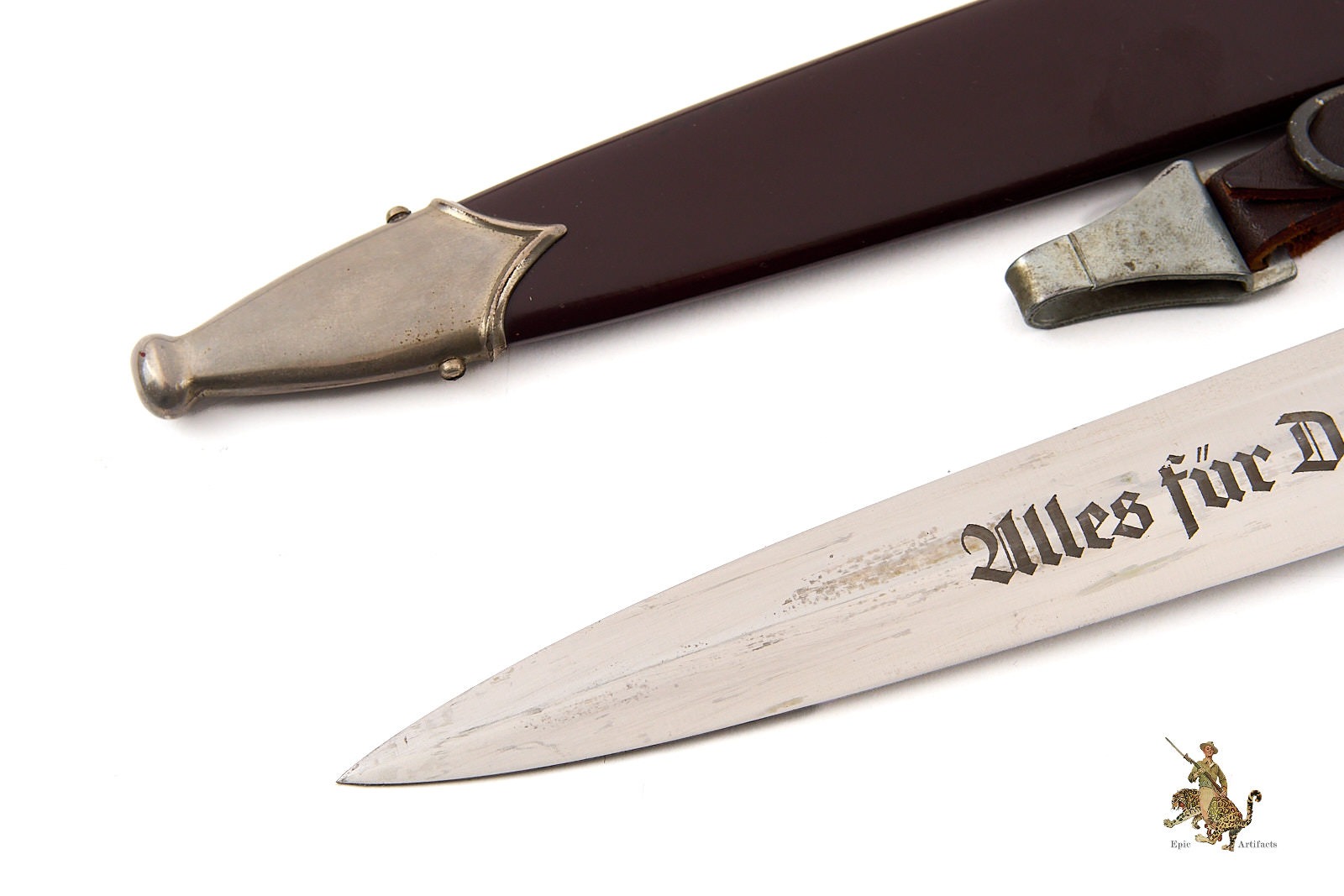 Historical Description: The “Sturmabteilung” (SA), formed in 1921, was the original paramilitary branch of the Nazi party. With the Nazi rise to power in 1933, a dress dagger was introduced for wear with the iconic “brown shirt” uniform. As the SA was a huge organization, with an eventual strength of close to three million men, there was a huge demand for these daggers, and they were produced by 123 different makers, from larger factories to small, cottage-industry workshops. The daggers featured a wood grip with an inset enameled SA emblem and the German national eagle and swastika emblem. The blade was etched with the motto of the SA, “Alles für Deutschland.” The early daggers were crafted with the utmost quality, in both workmanship and materials. Originally, the name and logo of each manufacturer was etched on the reverse of the blade. These early daggers featured hand-fitted nickel silver fittings, and scabbards that had an anodized coating. Prior to around 1935, the daggers were stamped with an SA group letter on the reverse of the crossguard. In 1936, the Reichszeugmeisterie der NSDAP (RZM) organization began to standardize the manufacture of the SA dagger. Commercial type manufacturer markings were to be eliminated, and replaced with the RZM logo as well as an RZM code to indicate the manufacturer. Late production daggers marked with RZM logos usually are made with plated zinc fittings and have aluminum grip eagles. Instead of the early anodizing process, later scabbards were simply painted. During the transitional period around 1936, many daggers were manufactured bearing the RZM logo and maker code in combination with the earlier type maker names and logos. These transitional daggers can be found with early or late features, or a mix of both.