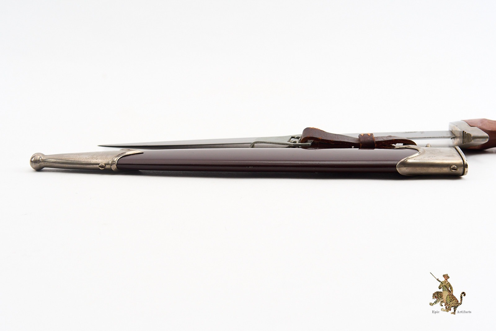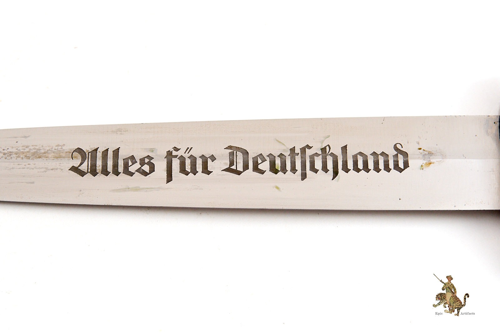 The blade retains much of its original factory cross-grain and the etched motto “Alles für Deutschland” remains deep and legible. Some scattered spotting is visible on the blade surface, along with a few small nicks along the edge—common signs of age and honest handling. The scabbard finish is intact with light wear, and the fittings remain tight and undisturbed. A fine and highly desirable example from a reputable maker, this dagger exemplifies the craftsmanship of late Third Reich edged weapons and would make a strong addition to any edged weapon or WWII-era militaria collection.