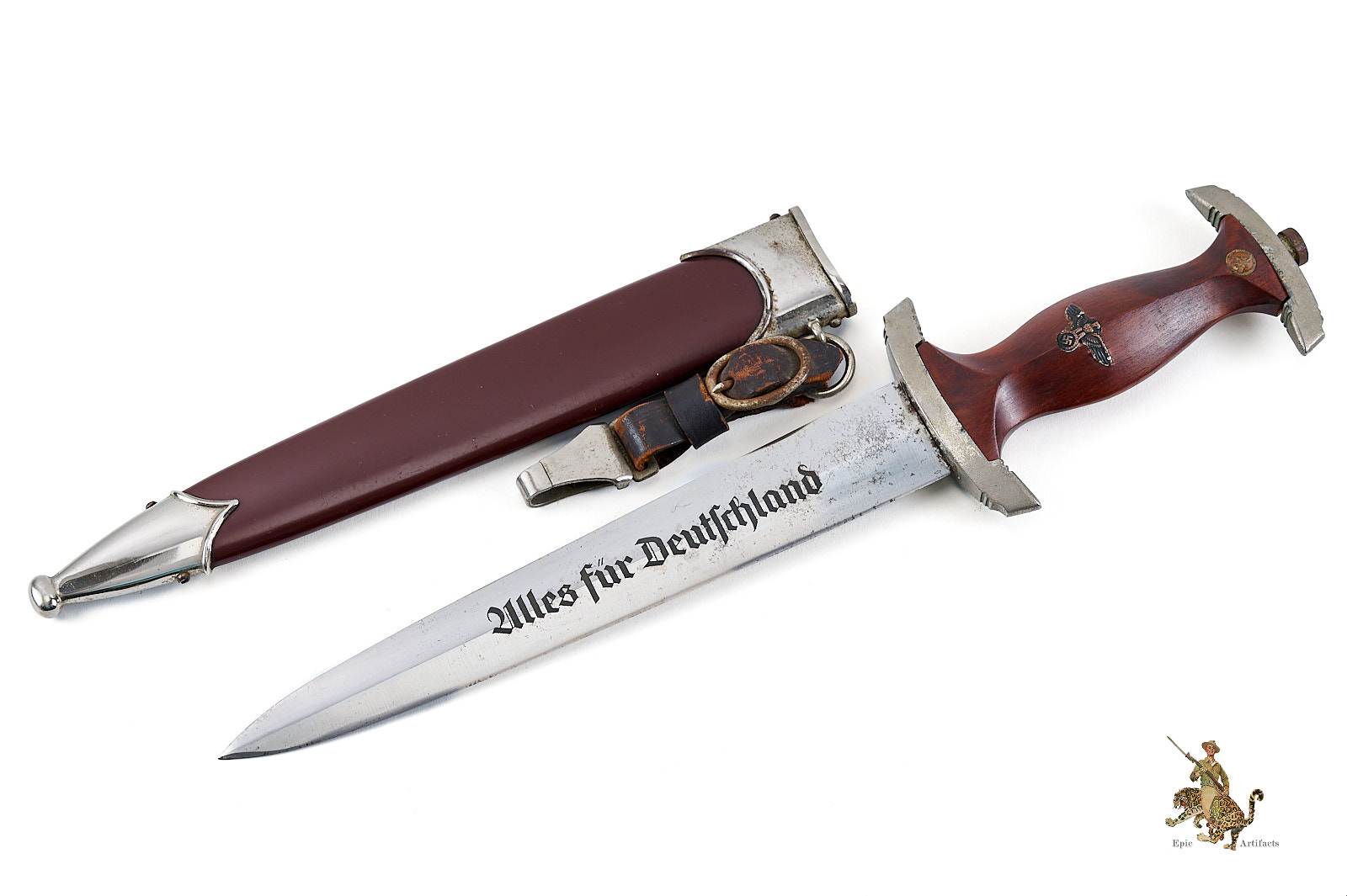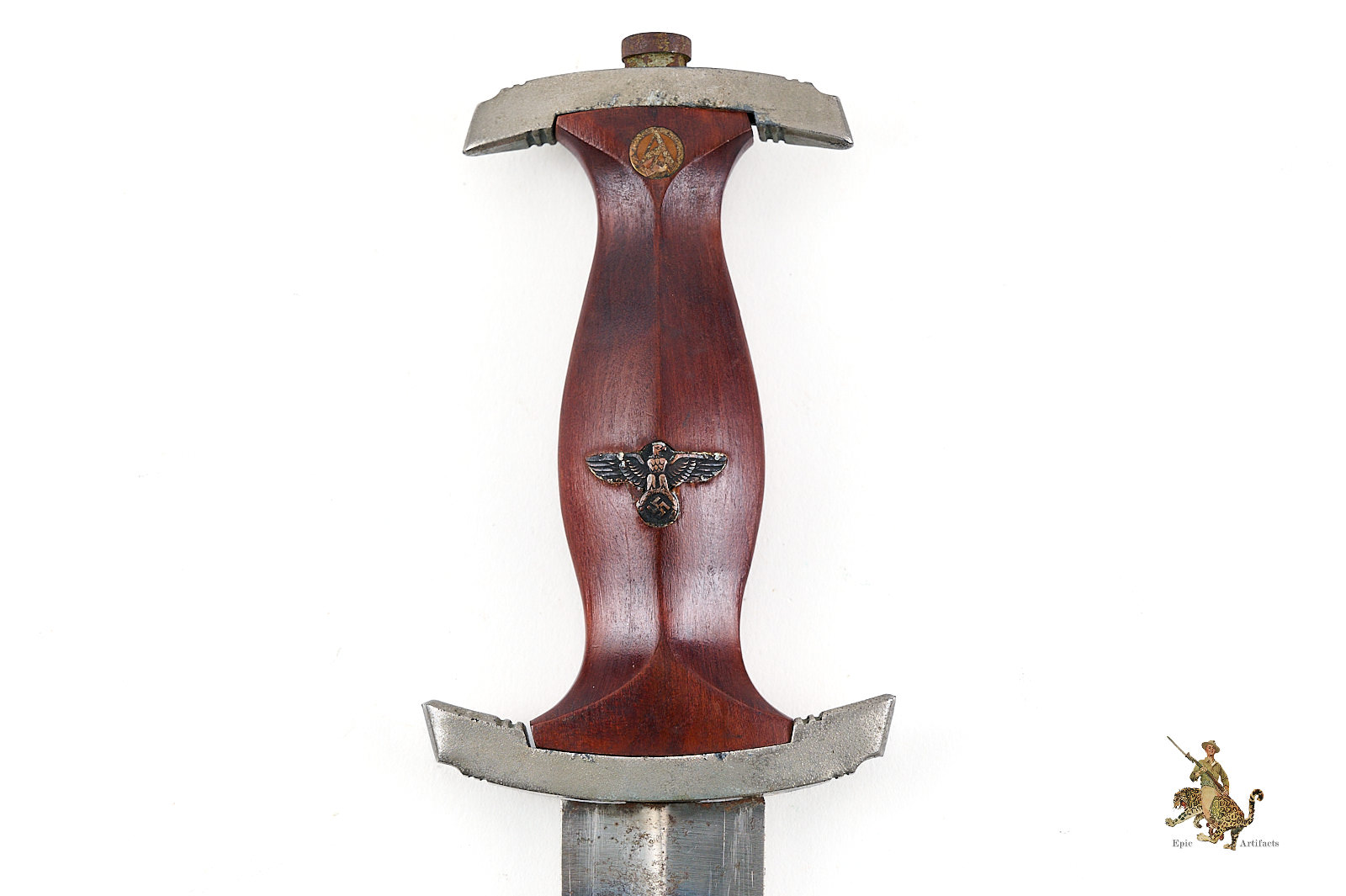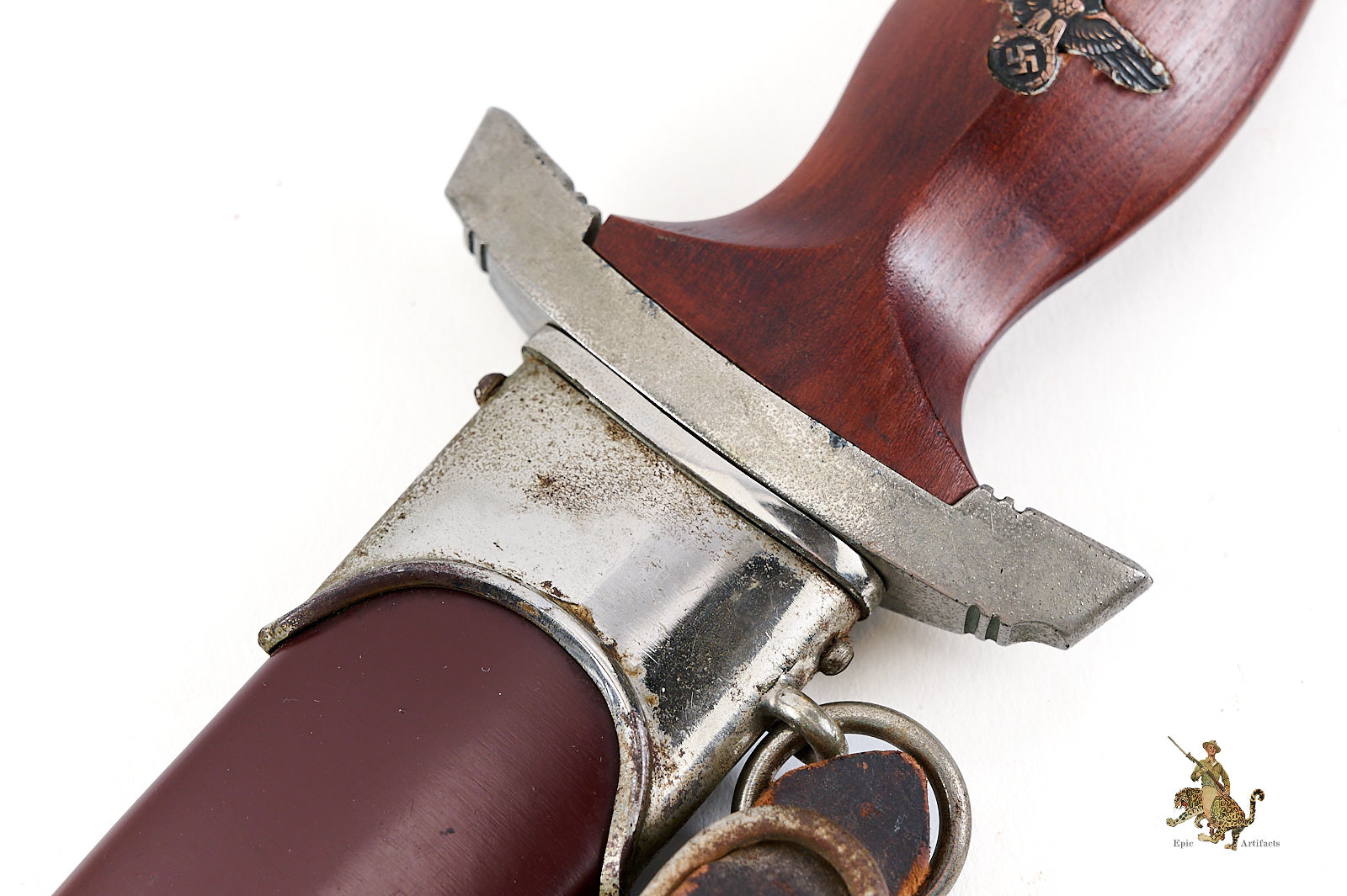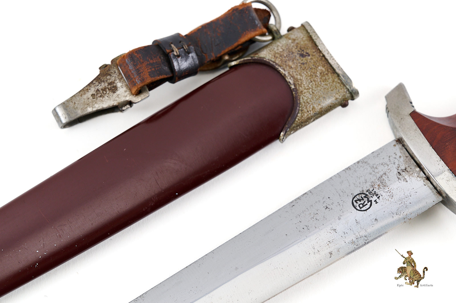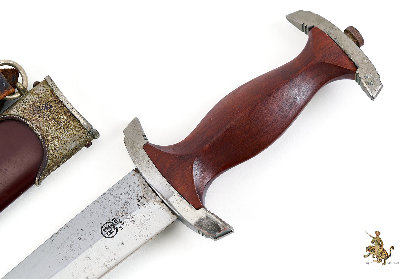 Historical Description: The “Sturmabteilung” (SA), formed in 1921, was the original paramilitary branch of the Nazi party. With the Nazi rise to power in 1933, a dress dagger was introduced for wear with the iconic “brown shirt” uniform. As the SA was a huge organization, with an eventual strength of close to three million men, there was a huge demand for these daggers, and they were produced by 123 different makers, from larger factories to small, cottage-industry workshops. The daggers featured a wood grip with an inset enameled SA emblem and the German national eagle and swastika emblem. The blade was etched with the motto of the SA, “Alles für Deutschland.” The early daggers were crafted with the utmost quality, in both workmanship and materials. Originally, the name and logo of each manufacturer was etched on the reverse of the blade. These early daggers featured hand-fitted nickel silver fittings, and scabbards that had an anodized coating. Prior to around 1935, the daggers were stamped with an SA group letter on the reverse of the crossguard. In 1936, the Reichszeugmeisterie der NSDAP (RZM) organization began to standardize the manufacture of the SA dagger. Commercial type manufacturer markings were to be eliminated, and replaced with the RZM logo as well as an RZM code to indicate the manufacturer. Late production daggers marked with RZM logos usually are made with plated zinc fittings, and have aluminum grip eagles. Instead of the early anodizing process, later scabbards were simply painted. During the transitional period around 1936, many daggers were manufactured bearing the RZM logo and maker code in combination with the earlier type maker names and logos. These transitional daggers can be found with early or late features, or a mix of both.