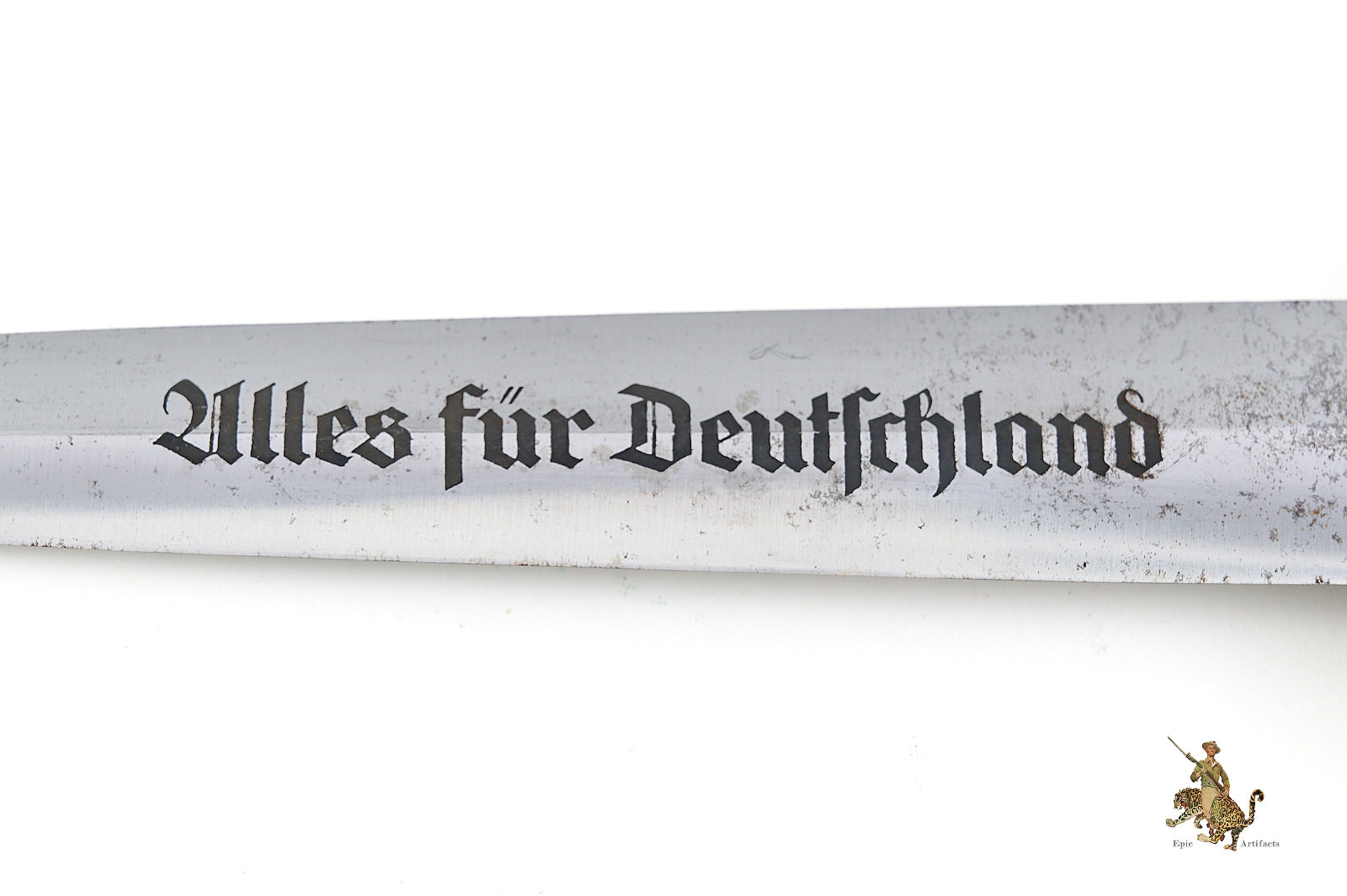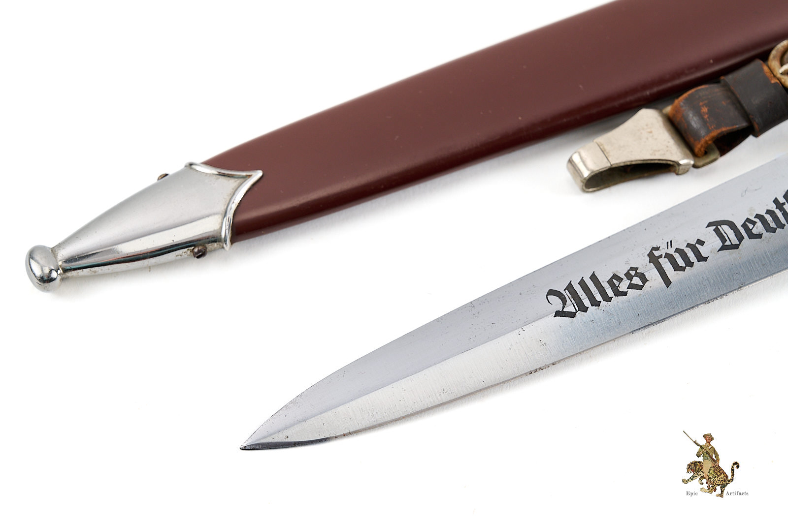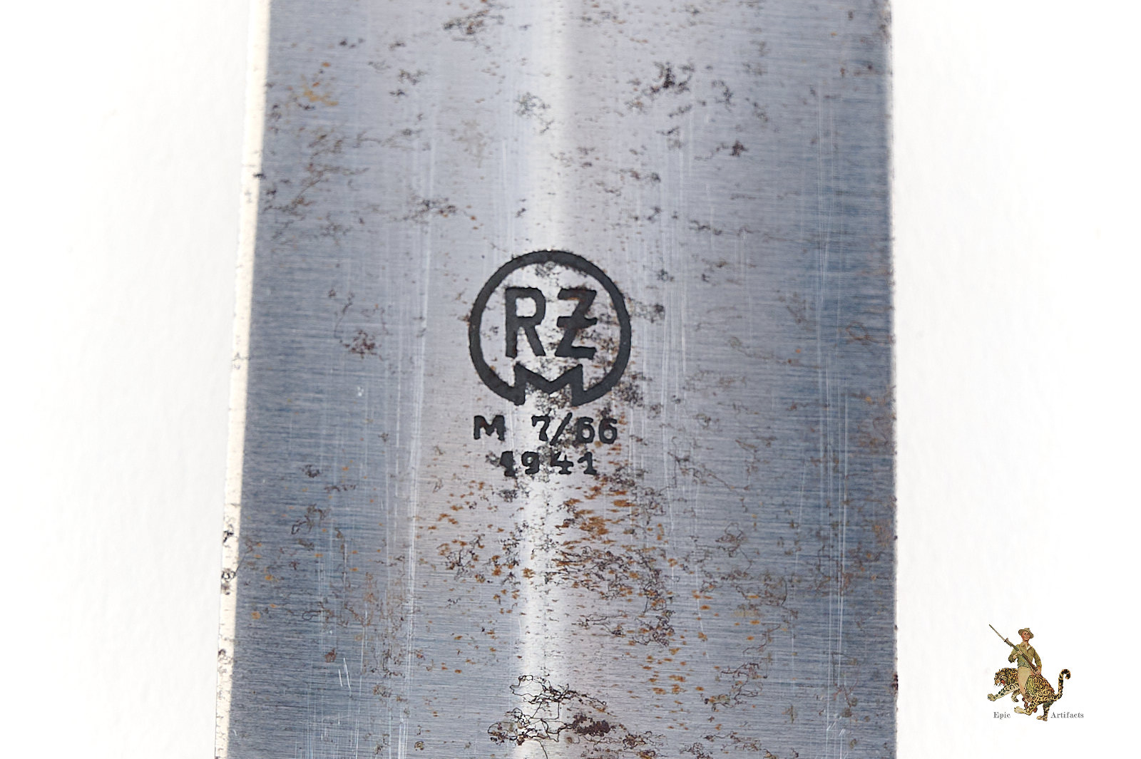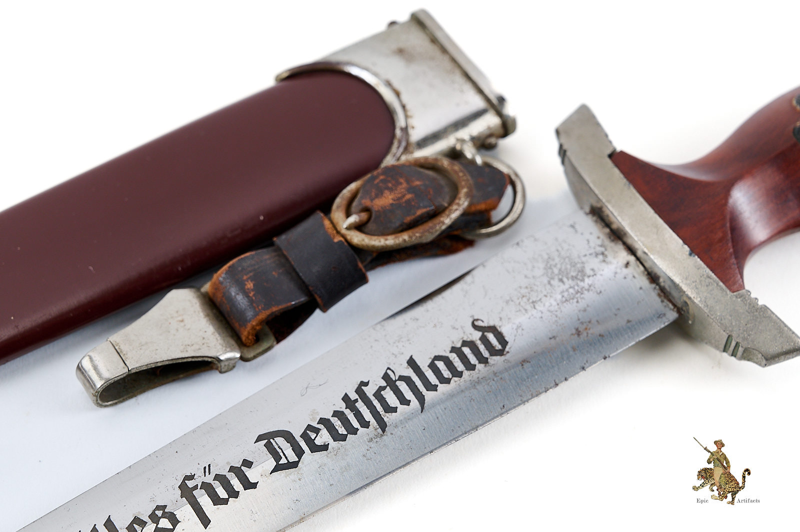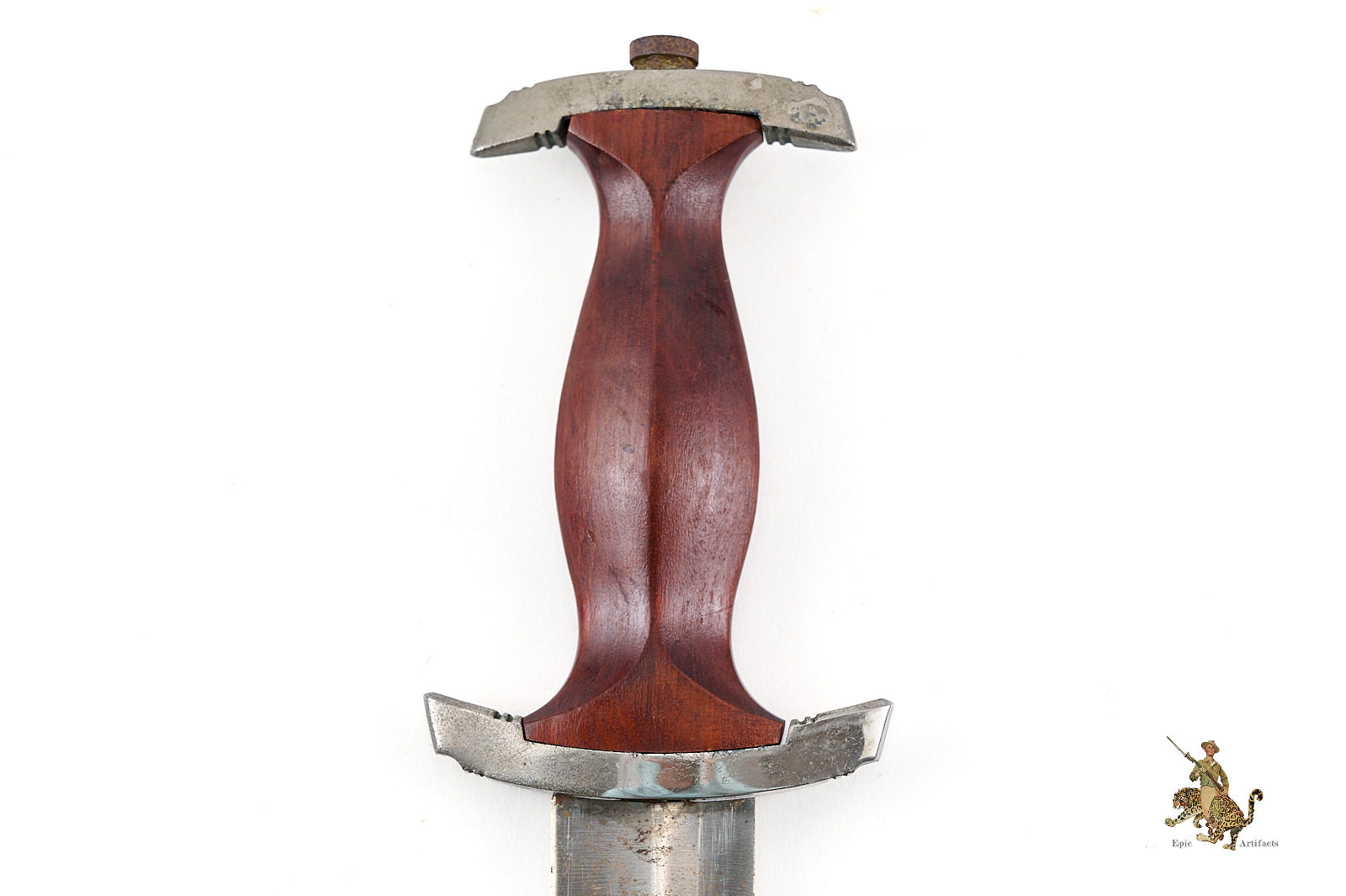 Historical Description: The “Sturmabteilung” (SA), formed in 1921, was the original paramilitary branch of the Nazi party. With the Nazi rise to power in 1933, a dress dagger was introduced for wear with the iconic “brown shirt” uniform. As the SA was a huge organization, with an eventual strength of close to three million men, there was a huge demand for these daggers, and they were produced by 123 different makers, from larger factories to small, cottage-industry workshops. The daggers featured a wood grip with an inset enameled SA emblem and the German national eagle and swastika emblem. The blade was etched with the motto of the SA, “Alles für Deutschland.” The early daggers were crafted with the utmost quality, in both workmanship and materials. Originally, the name and logo of each manufacturer was etched on the reverse of the blade. These early daggers featured hand-fitted nickel silver fittings, and scabbards that had an anodized coating. Prior to around 1935, the daggers were stamped with an SA group letter on the reverse of the crossguard. In 1936, the Reichszeugmeisterie der NSDAP (RZM) organization began to standardize the manufacture of the SA dagger. Commercial type manufacturer markings were to be eliminated, and replaced with the RZM logo as well as an RZM code to indicate the manufacturer. Late production daggers marked with RZM logos usually are made with plated zinc fittings, and have aluminum grip eagles. Instead of the early anodizing process, later scabbards were simply painted. During the transitional period around 1936, many daggers were manufactured bearing the RZM logo and maker code in combination with the earlier type maker names and logos. These transitional daggers can be found with early or late features, or a mix of both.