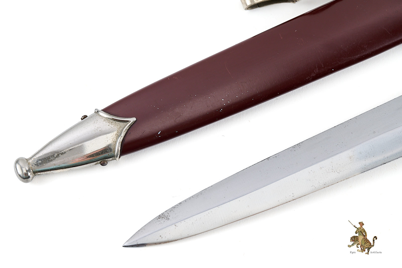 Overall, a strong and visually appealing collector-grade dagger, combining an excellent blade surface, well-preserved scabbard finish, and untouched structural integrity, with age-appropriate wear throughout metal fittings consistent with its historical use and storage.