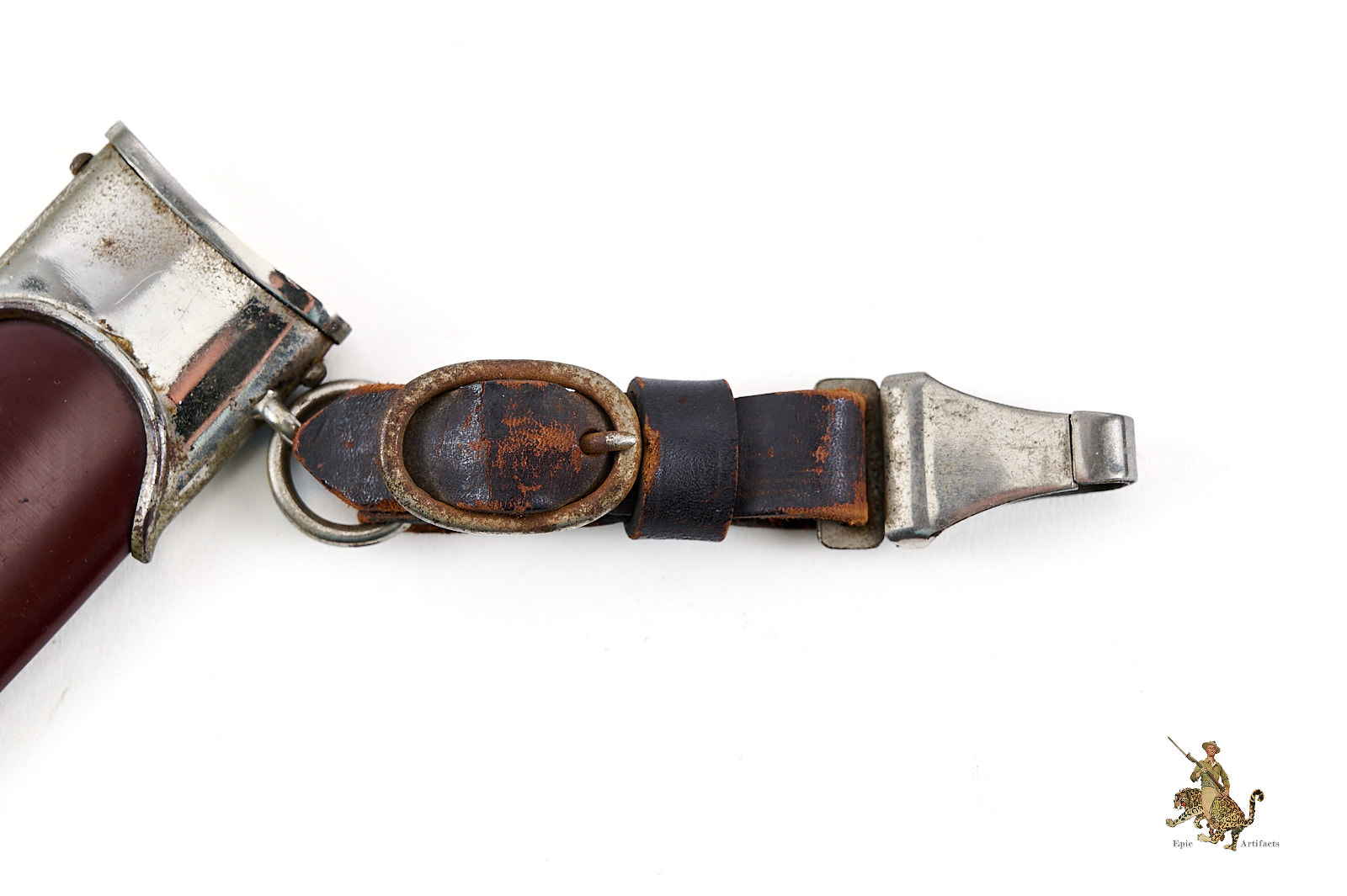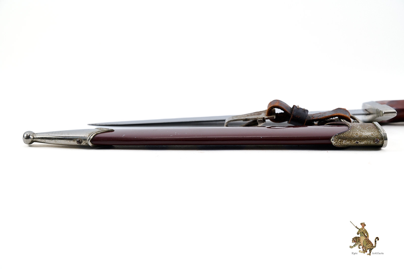 The scabbard presents particularly well, retaining a highly attractive near-original finish with very fine paint retention and minimal loss, a notable strength of the piece. The accompanying fittings to the scabbard likewise display corrosion and age wear, in keeping with the overall character of the dagger.