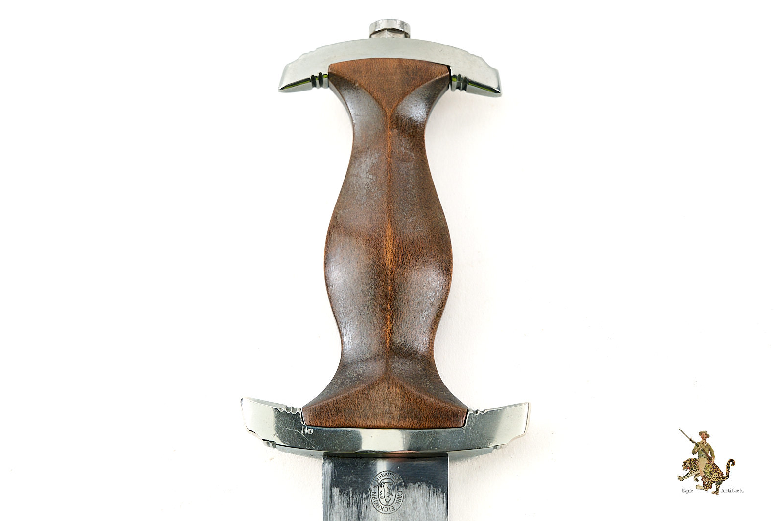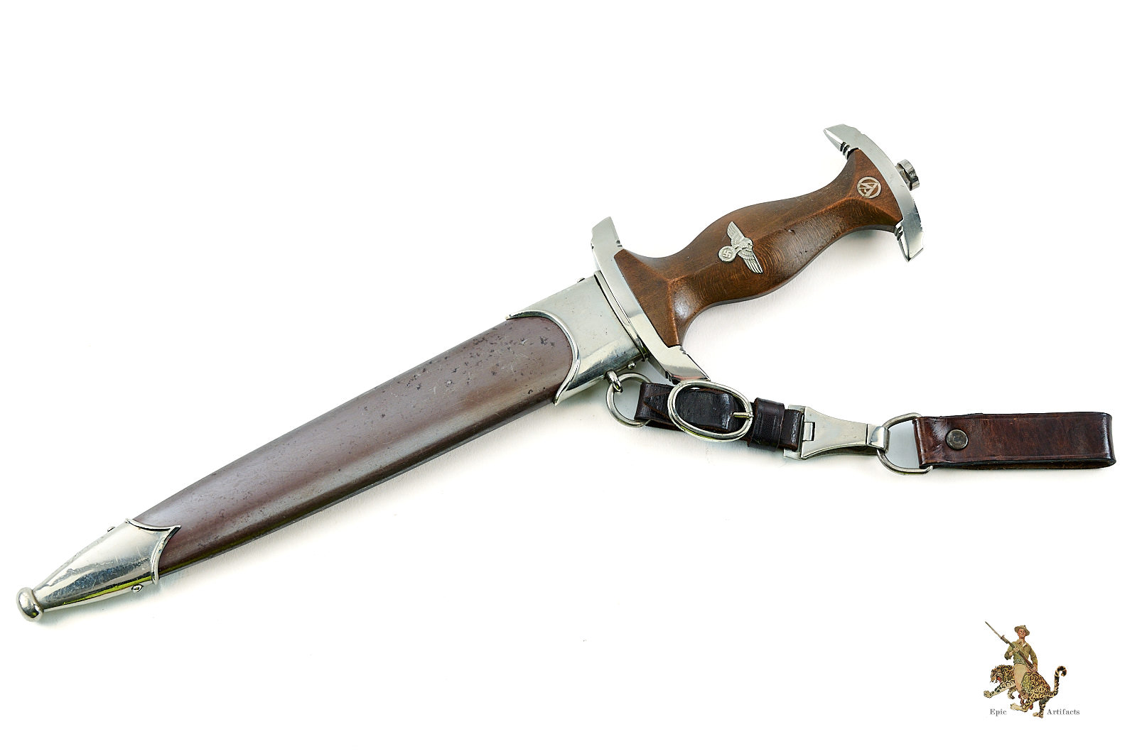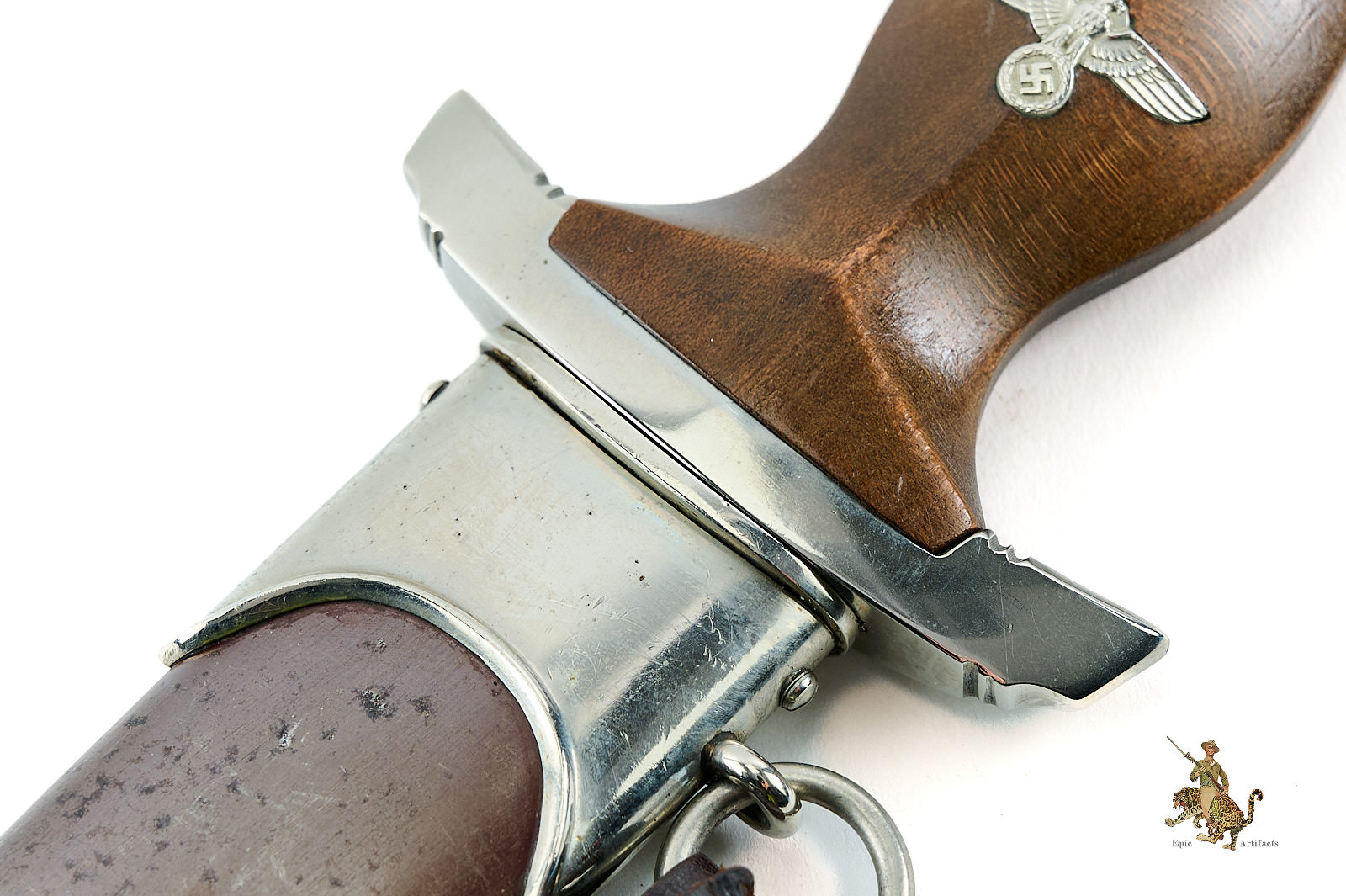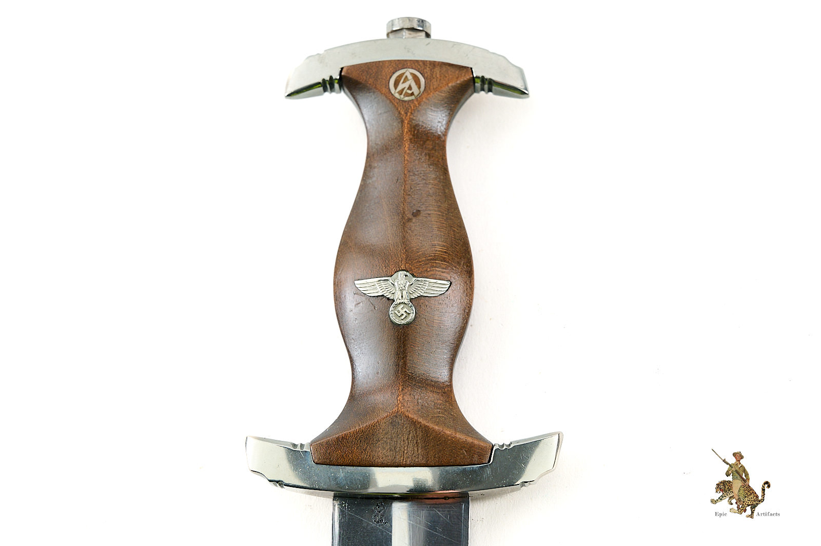 Historical Description: The “Sturmabteilung” (SA), formed in 1921, was the original paramilitary branch of the Nazi party. With the Nazi rise to power in 1933, a dress dagger was introduced for wear with the iconic “brown shirt” uniform. As the SA was a huge organization, with an eventual strength of close to three million men, there was a huge demand for these daggers, and they were produced by 123 different makers, from larger factories to small, cottage-industry workshops. The daggers featured a wood grip with an inset enameled SA emblem and the German national eagle and swastika emblem. The blade was etched with the motto of the SA, “Alles für Deutschland.” The early daggers were crafted with the utmost quality, in both workmanship and materials. Originally, the name and logo of each manufacturer was etched on the reverse of the blade. These early daggers featured hand-fitted nickel silver fittings, and scabbards that had an anodized coating. Prior to around 1935, the daggers were stamped with an SA group letter on the reverse of the crossguard. In 1936, the Reichszeugmeisterie der NSDAP (RZM) organization began to standardize the manufacture of the SA dagger. Commercial type manufacturer markings were to be eliminated, and replaced with the RZM logo as well as an RZM code to indicate the manufacturer. Late production daggers marked with RZM logos usually are made with plated zinc fittings and have aluminum grip eagles. Instead of the early anodizing process, later scabbards were simply painted. During the transitional period around 1936, many daggers were manufactured bearing the RZM logo and maker code in combination with the earlier type maker names and logos. These transitional daggers can be found with early or late features, or a mix of both.
