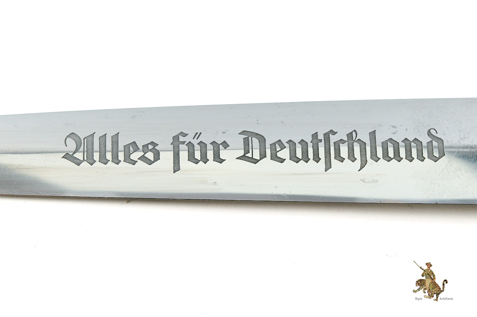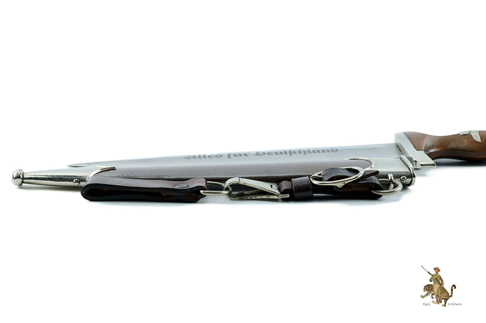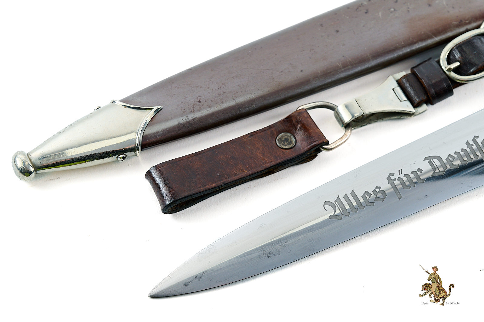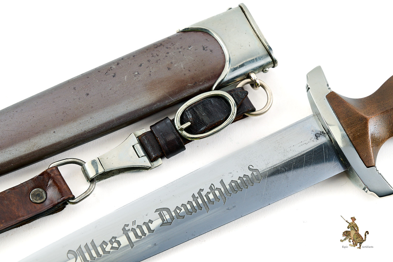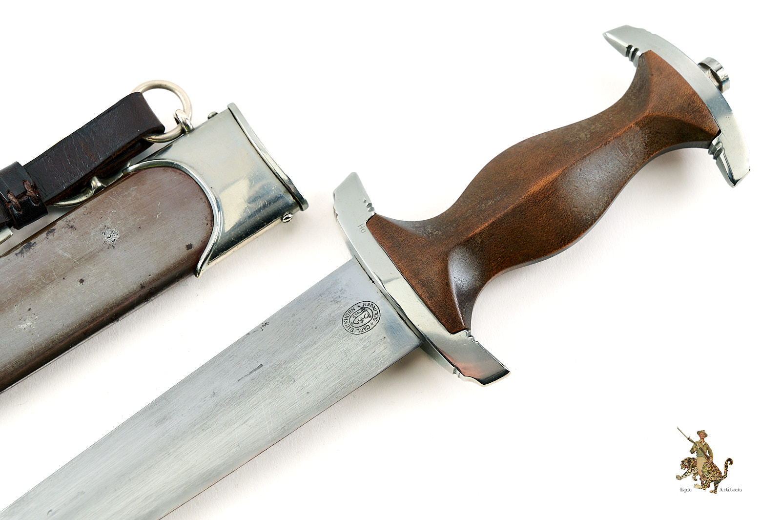 Historical Description: The “Sturmabteilung” (SA), formed in 1921, was the original paramilitary branch of the Nazi party. With the Nazi rise to power in 1933, a dress dagger was introduced for wear with the iconic “brown shirt” uniform. As the SA was a huge organization, with an eventual strength of close to three million men, there was a huge demand for these daggers, and they were produced by 123 different makers, from larger factories to small, cottage-industry workshops. The daggers featured a wood grip with an inset enameled SA emblem and the German national eagle and swastika emblem. The blade was etched with the motto of the SA, “Alles für Deutschland.” The early daggers were crafted with the utmost quality, in both workmanship and materials. Originally, the name and logo of each manufacturer was etched on the reverse of the blade. These early daggers featured hand-fitted nickel silver fittings, and scabbards that had an anodized coating. Prior to around 1935, the daggers were stamped with an SA group letter on the reverse of the crossguard. In 1936, the Reichszeugmeisterie der NSDAP (RZM) organization began to standardize the manufacture of the SA dagger. Commercial type manufacturer markings were to be eliminated, and replaced with the RZM logo as well as an RZM code to indicate the manufacturer. Late production daggers marked with RZM logos usually are made with plated zinc fittings and have aluminum grip eagles. Instead of the early anodizing process, later scabbards were simply painted. During the transitional period around 1936, many daggers were manufactured bearing the RZM logo and maker code in combination with the earlier type maker names and logos. These transitional daggers can be found with early or late features, or a mix of both.
