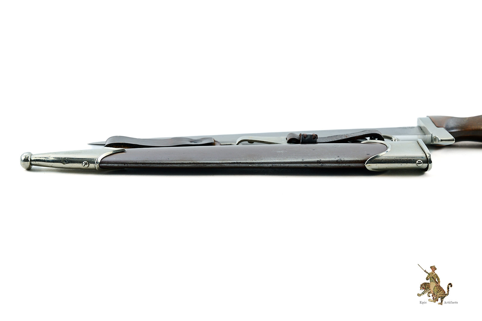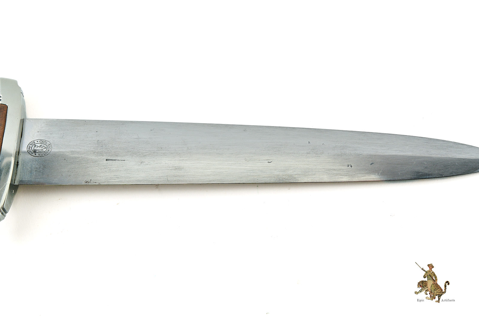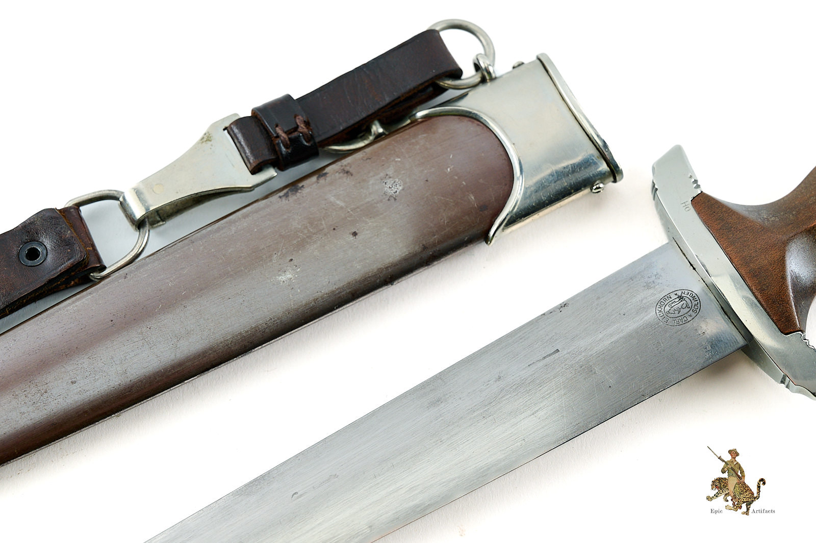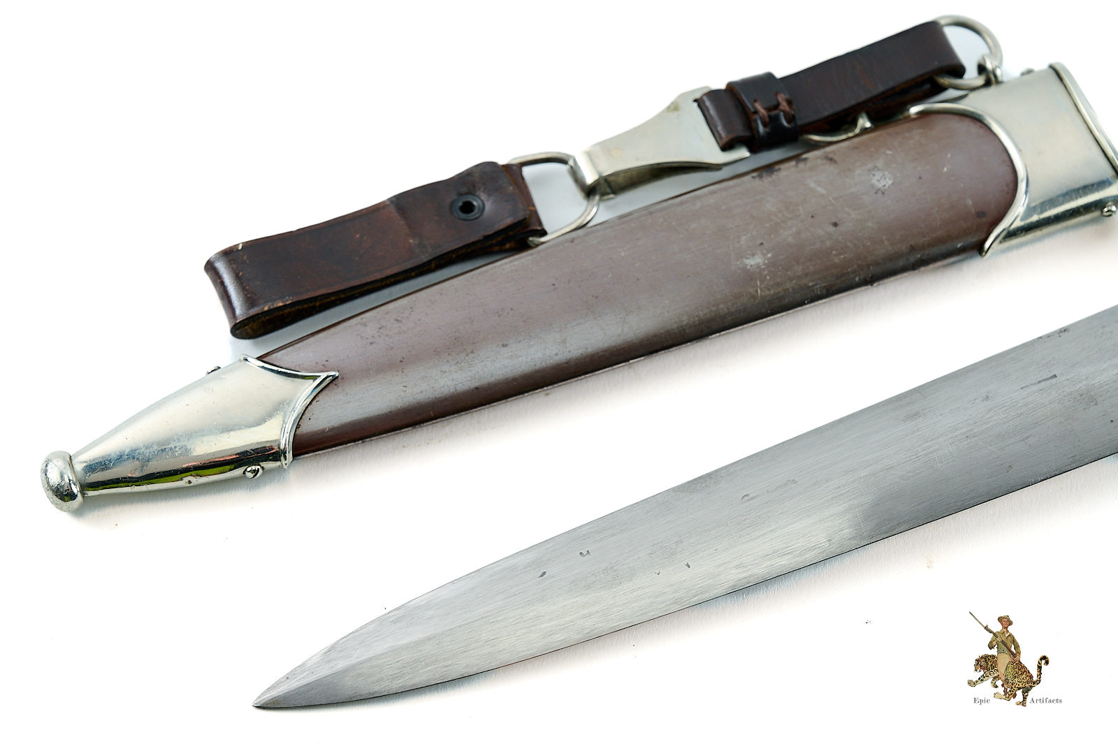 Historical Description: The “Sturmabteilung” (SA), formed in 1921, was the original paramilitary branch of the Nazi party. With the Nazi rise to power in 1933, a dress dagger was introduced for wear with the iconic “brown shirt” uniform. As the SA was a huge organization, with an eventual strength of close to three million men, there was a huge demand for these daggers, and they were produced by 123 different makers, from larger factories to small, cottage-industry workshops. The daggers featured a wood grip with an inset enameled SA emblem and the German national eagle and swastika emblem. The blade was etched with the motto of the SA, “Alles für Deutschland.” The early daggers were crafted with the utmost quality, in both workmanship and materials. Originally, the name and logo of each manufacturer was etched on the reverse of the blade. These early daggers featured hand-fitted nickel silver fittings, and scabbards that had an anodized coating. Prior to around 1935, the daggers were stamped with an SA group letter on the reverse of the crossguard. In 1936, the Reichszeugmeisterie der NSDAP (RZM) organization began to standardize the manufacture of the SA dagger. Commercial type manufacturer markings were to be eliminated, and replaced with the RZM logo as well as an RZM code to indicate the manufacturer. Late production daggers marked with RZM logos usually are made with plated zinc fittings and have aluminum grip eagles. Instead of the early anodizing process, later scabbards were simply painted. During the transitional period around 1936, many daggers were manufactured bearing the RZM logo and maker code in combination with the earlier type maker names and logos. These transitional daggers can be found with early or late features, or a mix of both.