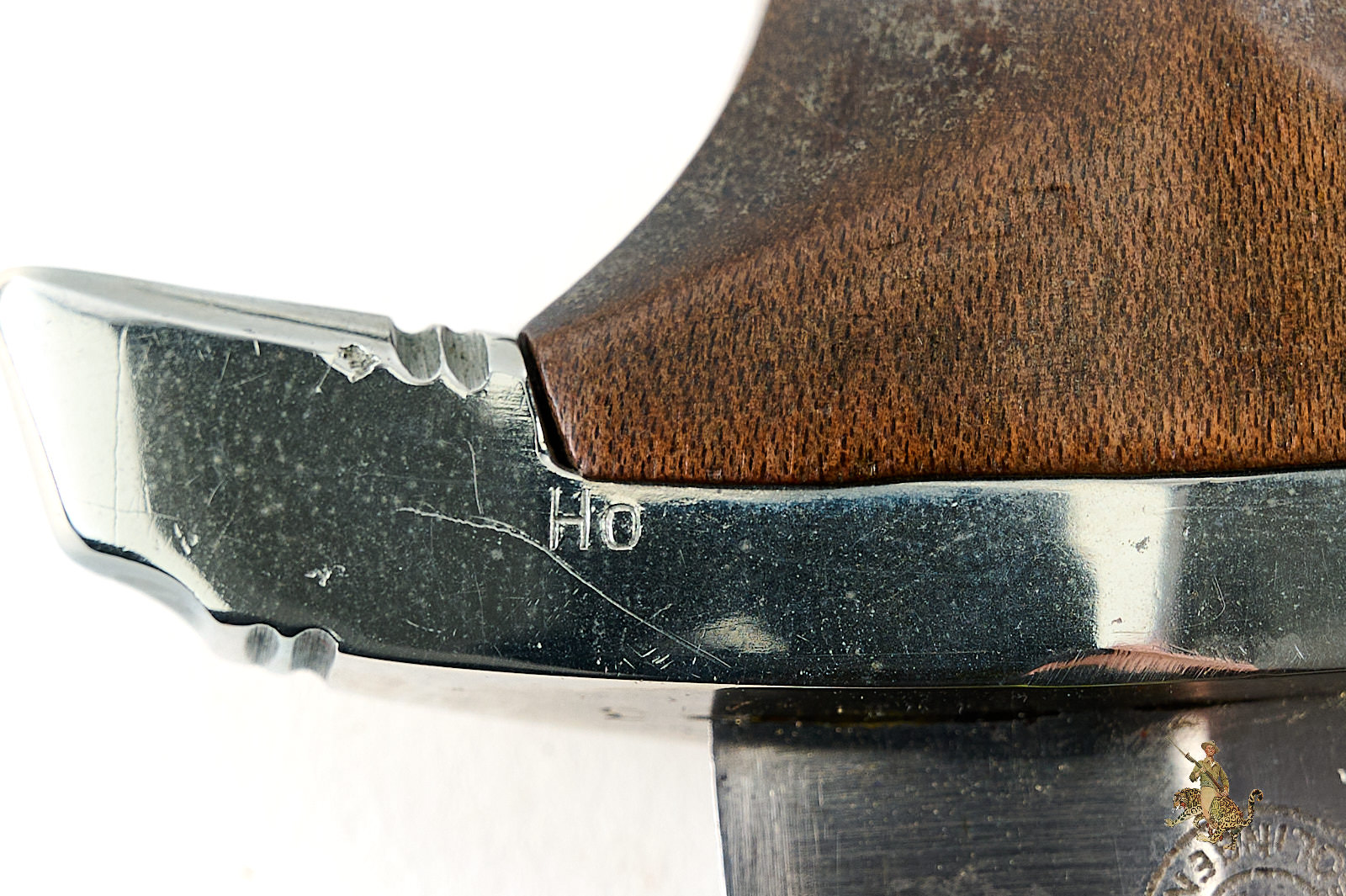 The lower crossguard is stamped “Ho,” denoting the Hochland Gau district, a regional marking of particular interest to collectors. The hilt features a finely shaped wooden grip in excellent condition, displaying light handling marks and indentations consistent with age, while maintaining a tight and undisturbed fit to the guards. The inset insignia remain intact, and the pommel nut and upper guard show honest wear and light tool marks, suggestive of careful period maintenance.