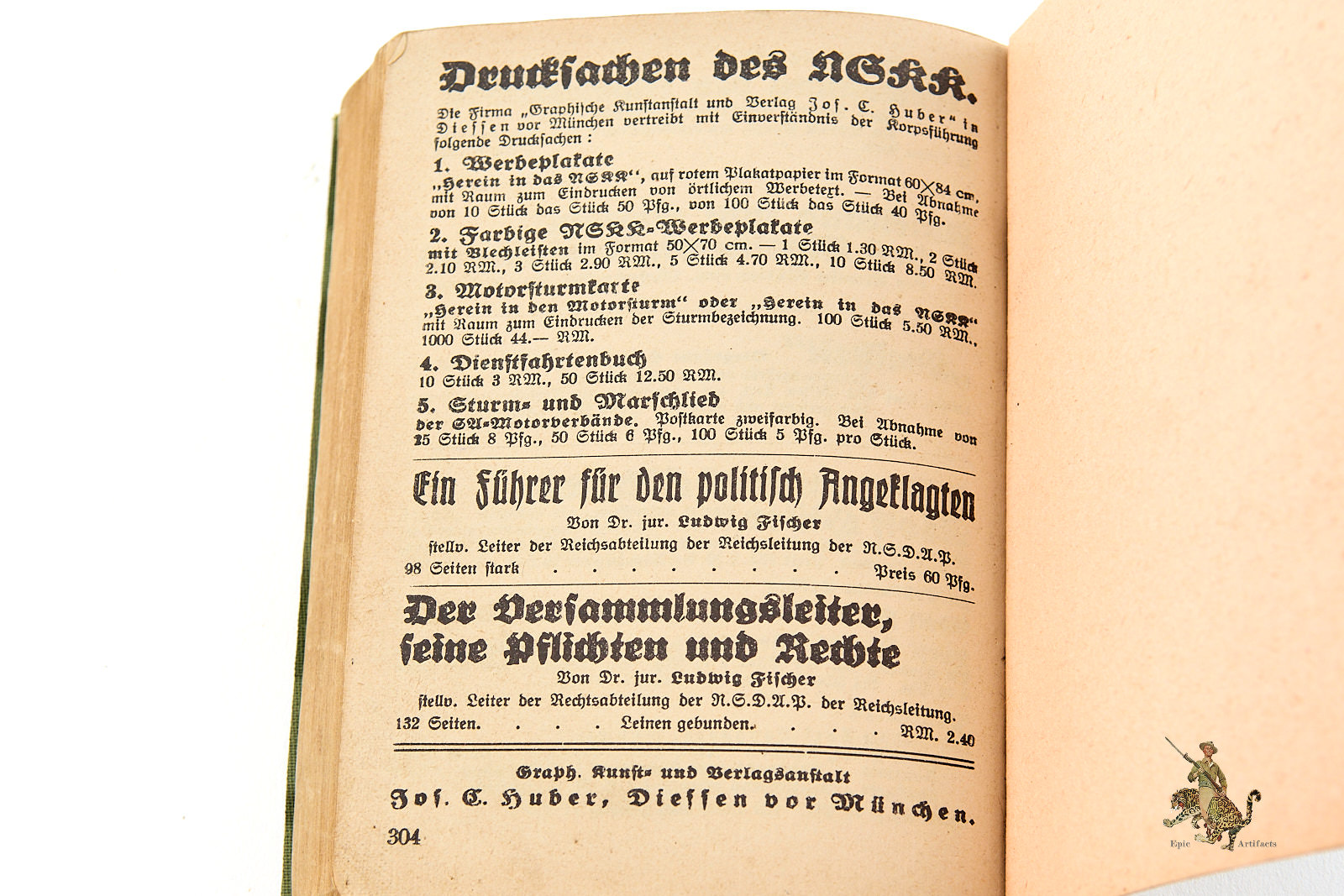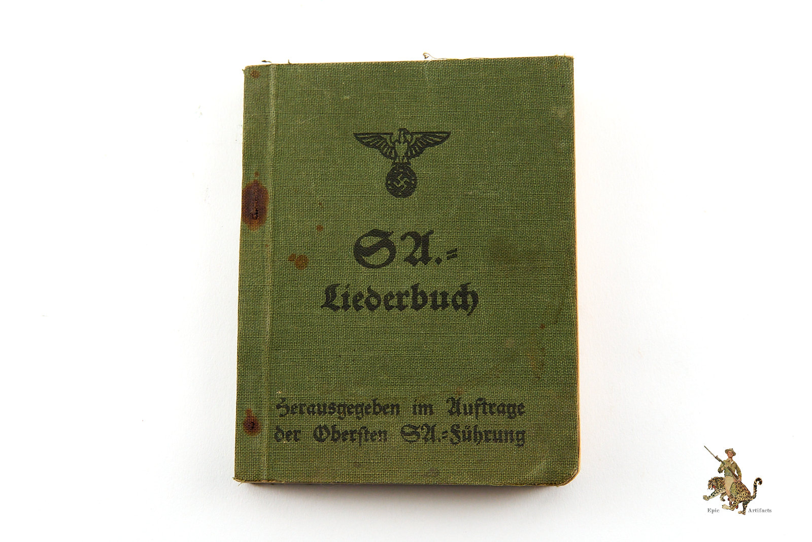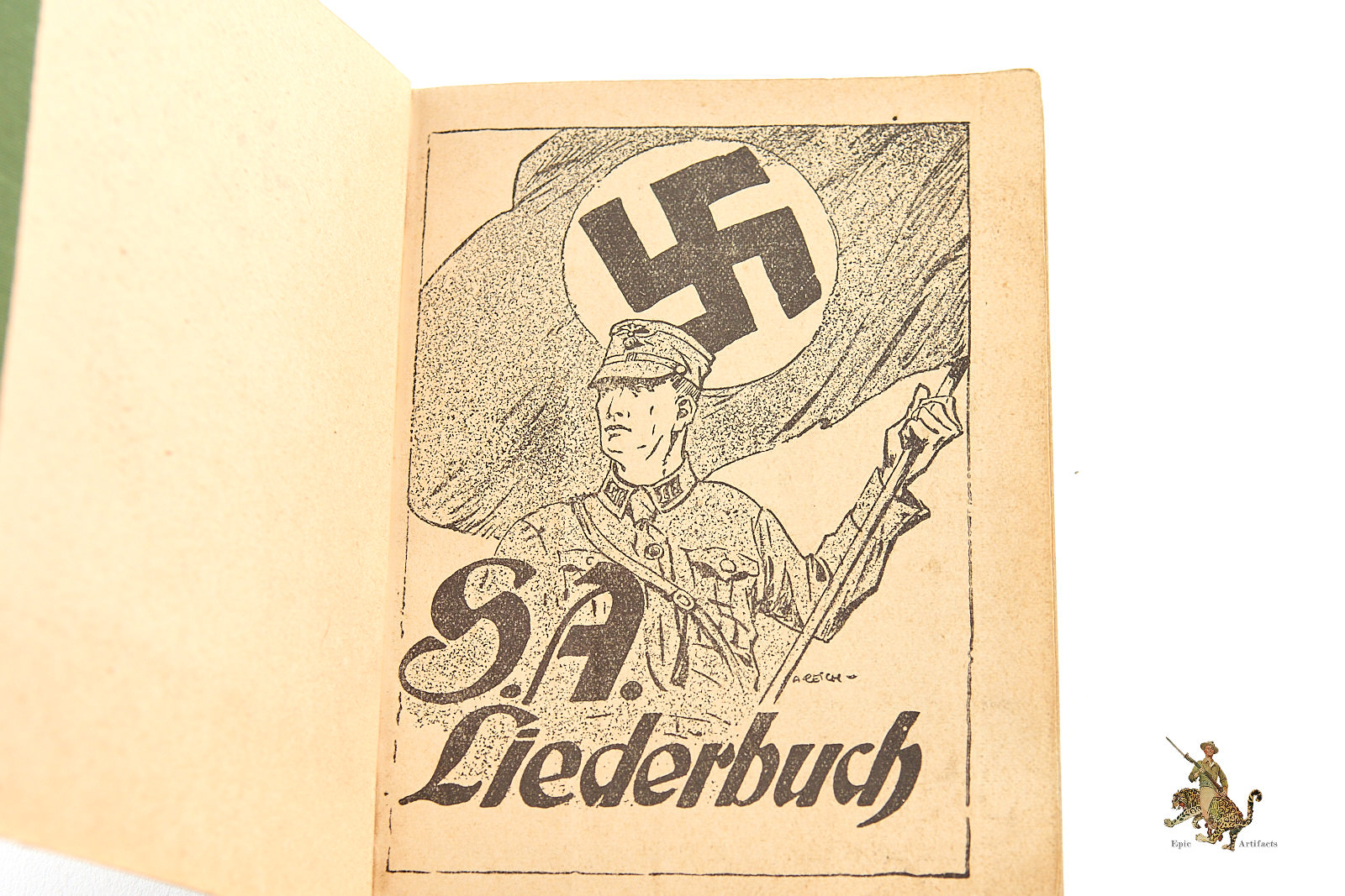 Historical Description: The SA Liederbuch (Sturmabteilung Song Book) was a standardized collection of songs used by members of the Nazi Party’s paramilitary organizations during the Third Reich, most prominently the SA but also within broader National Socialist gatherings. These songbooks compiled marching songs, folk tunes, and overtly political anthems that were intended to foster unity, discipline, and ideological commitment among participants. Singing was an integral part of rallies, marches, training, and social functions, reinforcing group identity and loyalty to the movement through shared ritual.