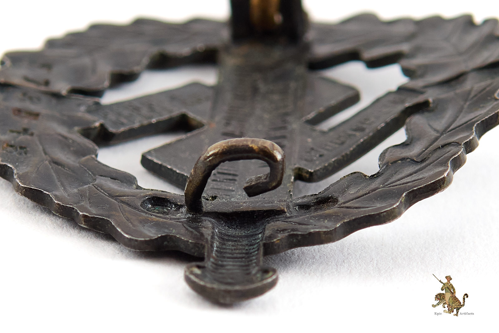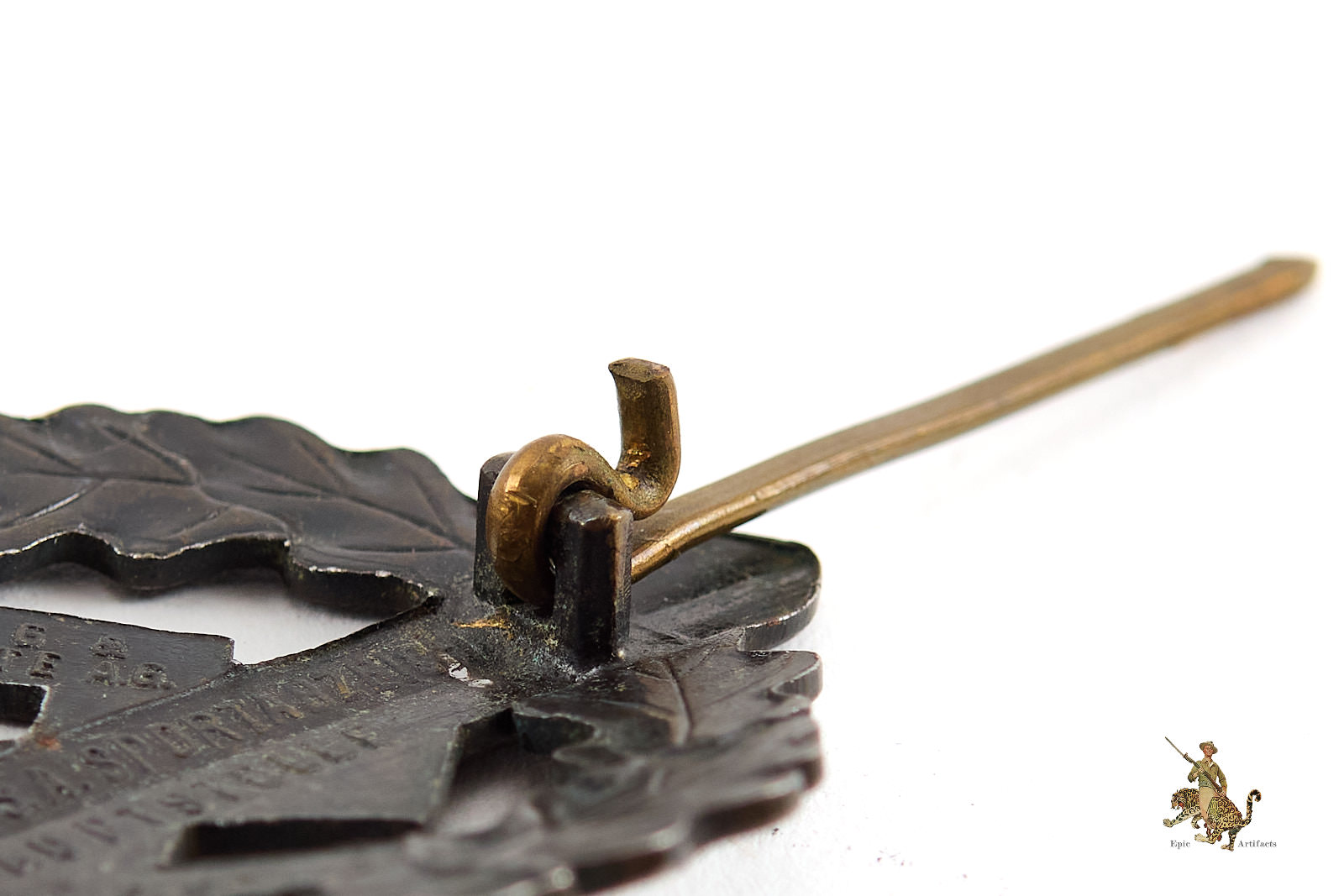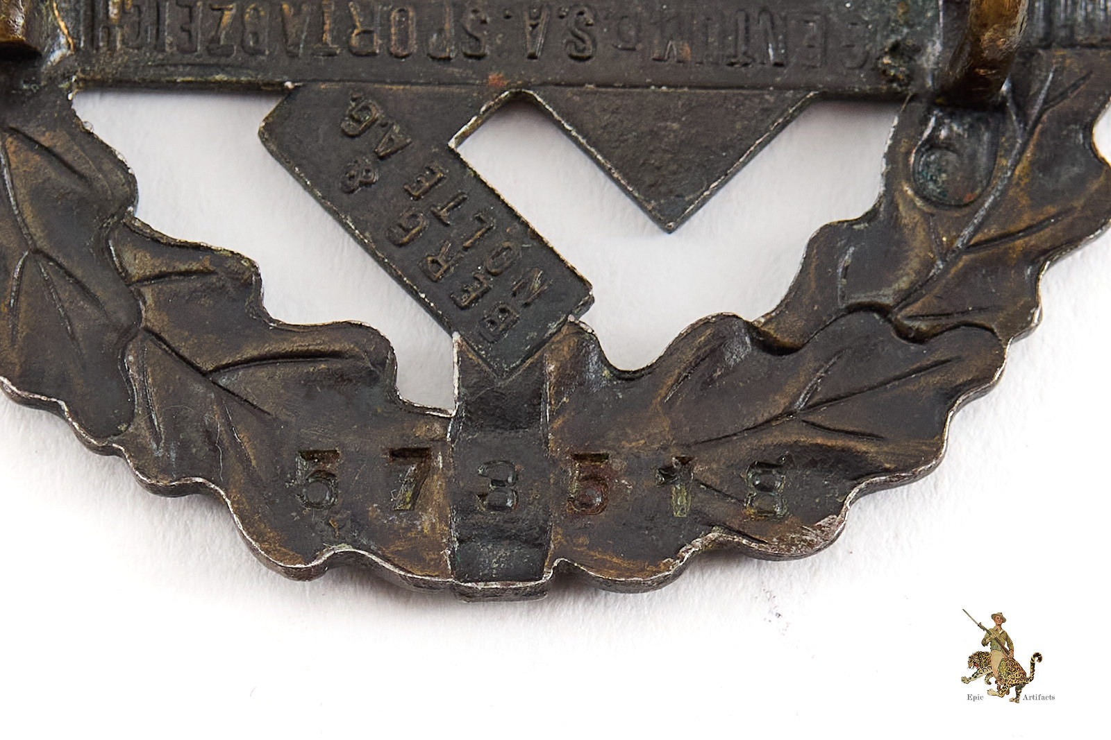 Product Description: This SA Sports Badge – Bronze is an honest original piece, showing very little wear and aging. The original bronze finish is mostly intact with loss to the high points as expected. The obverse retains lots of original detail and is truly lovely. It’s well marked, with typical SA Property wording, as well as the name of the maker, the firm of Berg & Nolte. The original reverse hardware setup is intact, functional, and shows no sign of any repair. This badge has pleasant character and remains in excellent condition.