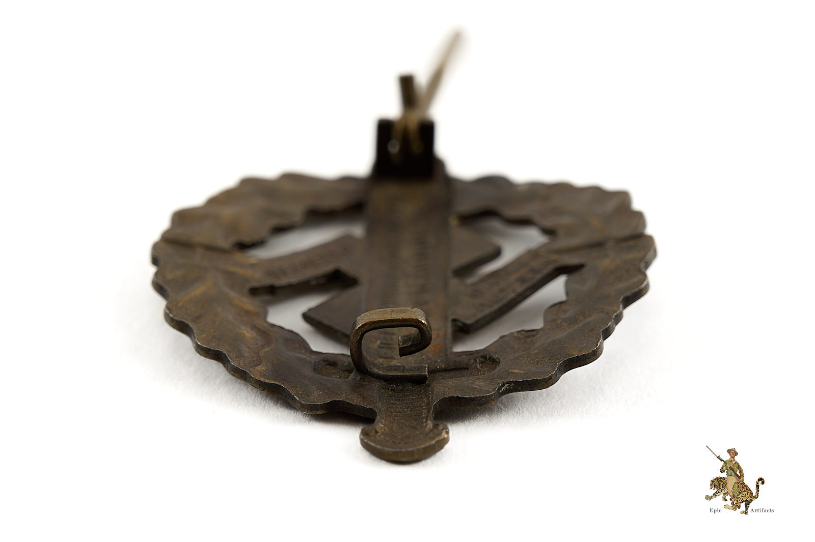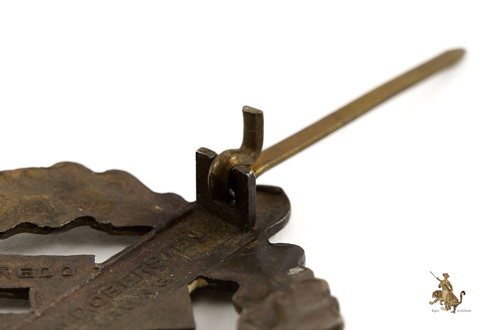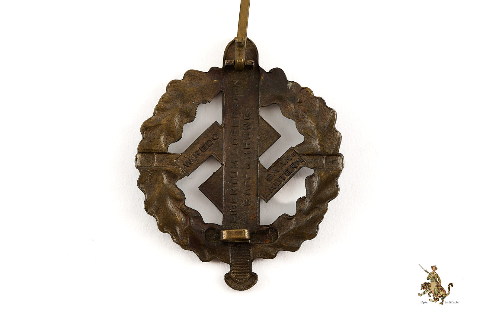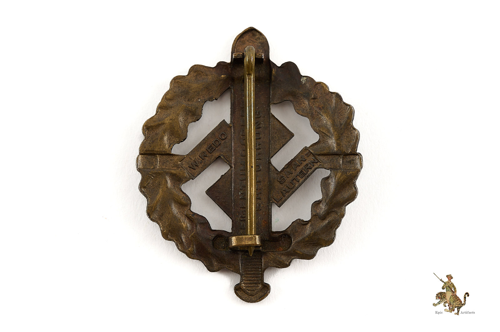 Product Description: This SA Sports Badge is an honest original piece. Badge is showing the base tombak tone, but the bronze wash is still visible throughout. Badge is well marked, with typical SA Property wording, as well as the name of the maker, the firm of Werner Redo Saarlautern. The original reverse hardware setup is intact, functional, and shows no sign of any repair. This badge has pleasant character and remains in excellent condition.