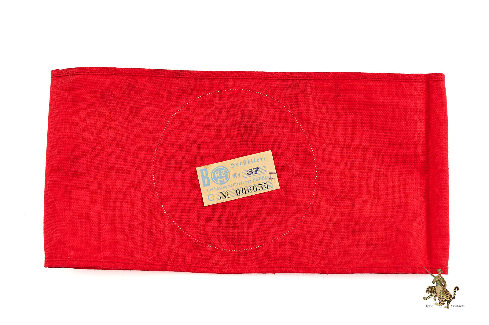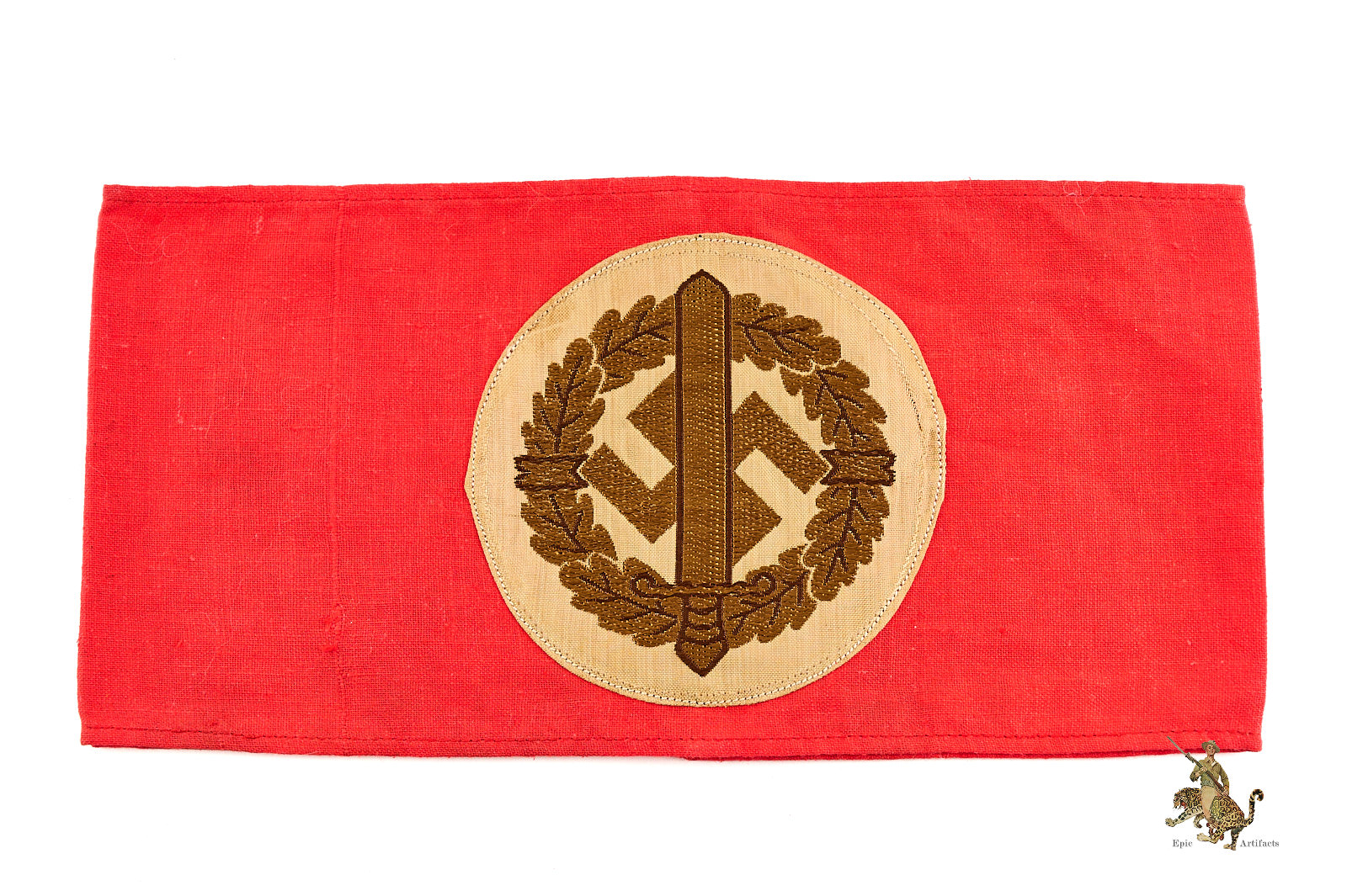 Historical Description: Nearly every military, civil, political and paramilitary organization in existence during the Third Reich used armbands. Armbands were worn on military and civilian uniforms and also on civilian clothes, from suit jackets to work clothing. They were used to denote membership in organizations, to indicate a specific role or function of the bearer, and as insignia of rank. Many organizations would change the design of their armbands over time, which added to the variety produced. These were manufactured in countless variations, ranging from simple printed bands to elaborately hand-embroidered pieces of the highest quality. Some Nazi armbands were worn by all members of large organizations and were made by the millions. Others were intended for use at a specific time and place and were unique. Many types were made in very limited numbers. Some bore metal insignia or special identifiers that indicated the wearer’s rank, unit affiliation, or nationality. Armbands were sometimes but not always marked with ink stamps by the issuing authorities.