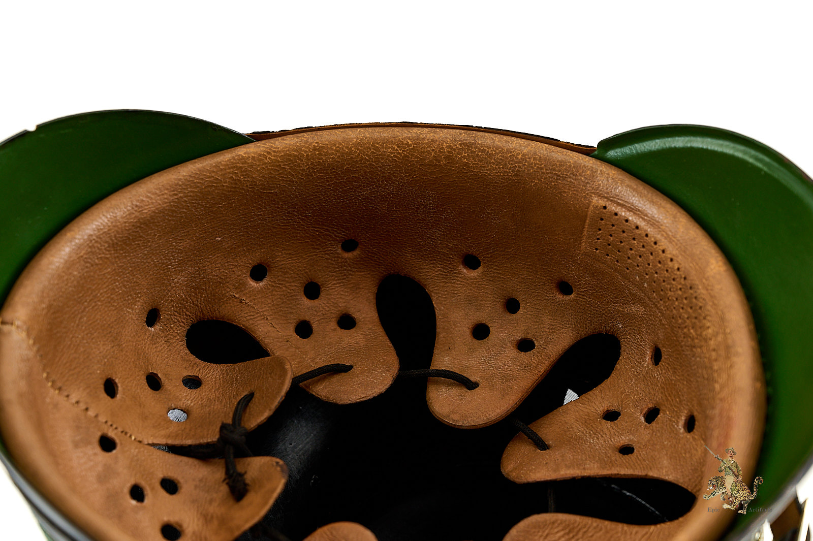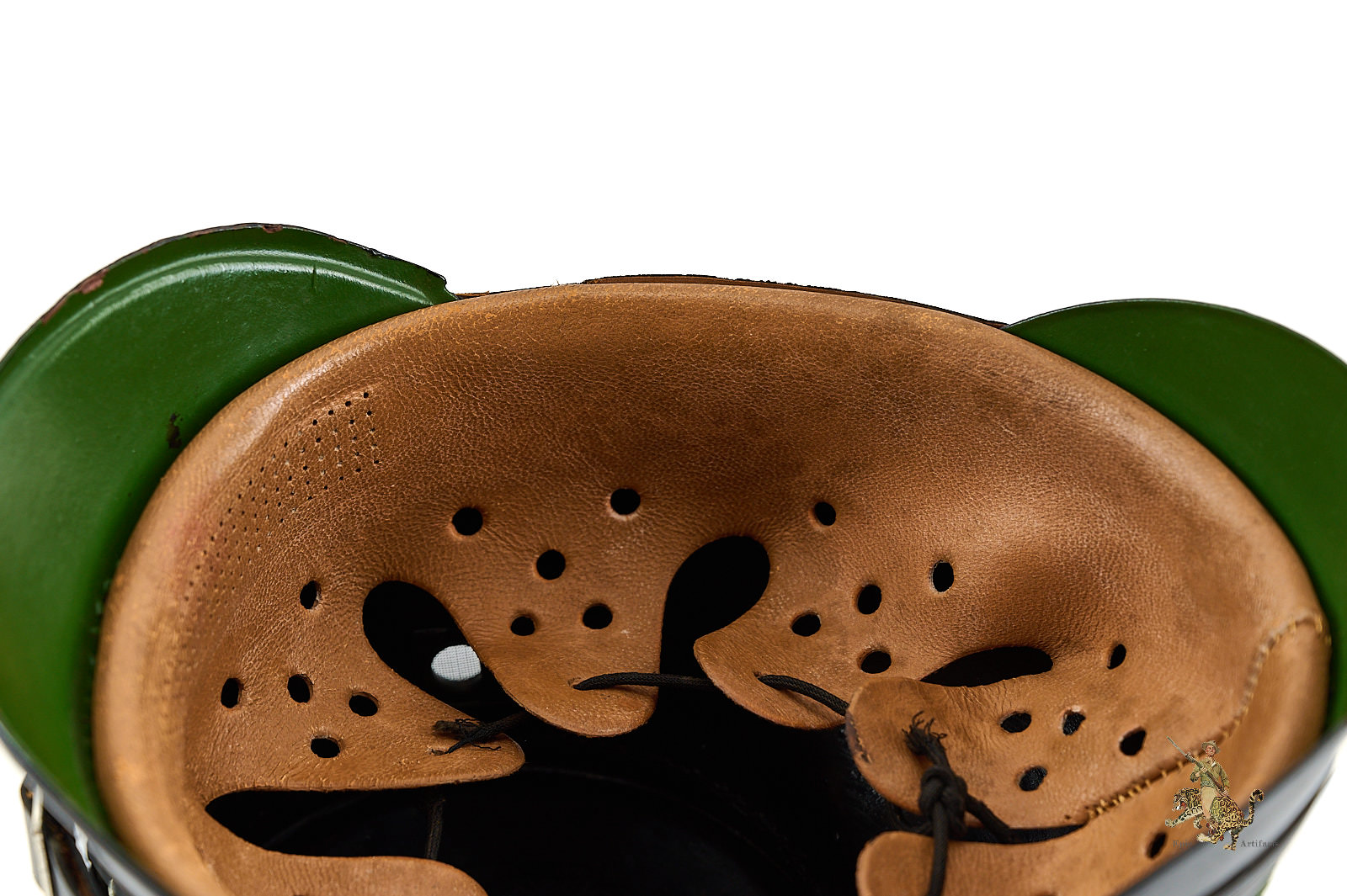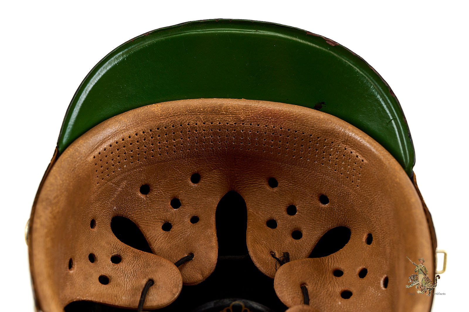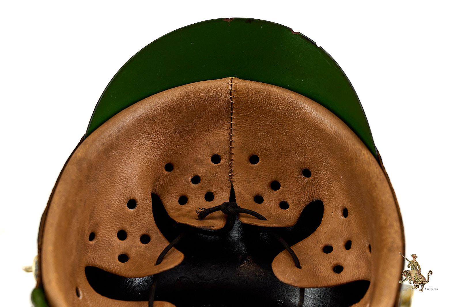 The interior displays a clean and supple leather liner, marked size 56½, with its original draw cord showing some thinning and wear. The polished aluminum police eagle and national cockade remain in excellent condition, the latter showing only minor paint loss from handling.