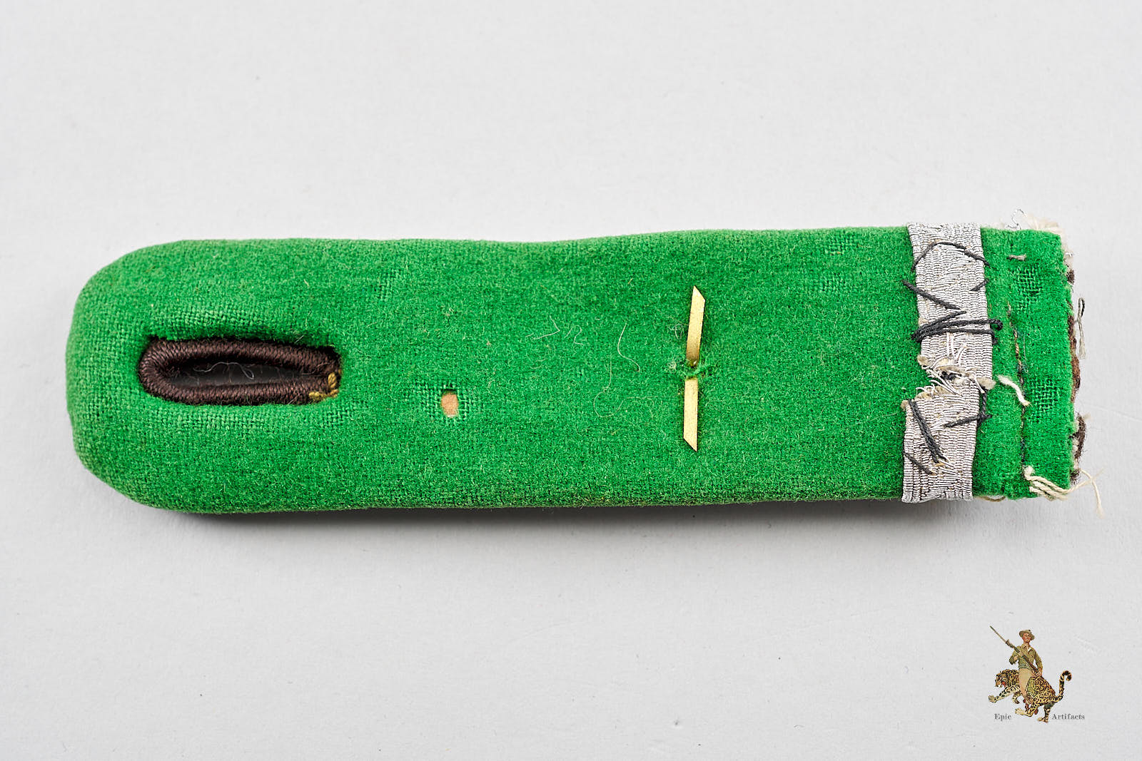 Product Description: This Schutzpolizei Single Shoulder Board presents in excellent condition with minor wear. Board features a green Waffenfarbe wool underlay retaining strong color. The silver/aluminum tress remains intact and in good condition. Shoulder board has a moth hole on the reverse and some wear to the edges of the silver bullion thread. An excellent, field-worn example of Schutzpolizei insignia from WWII, combining authenticity and visual appeal. This Schutzpolizei Single Shoulder Board rates in excellent condition.
