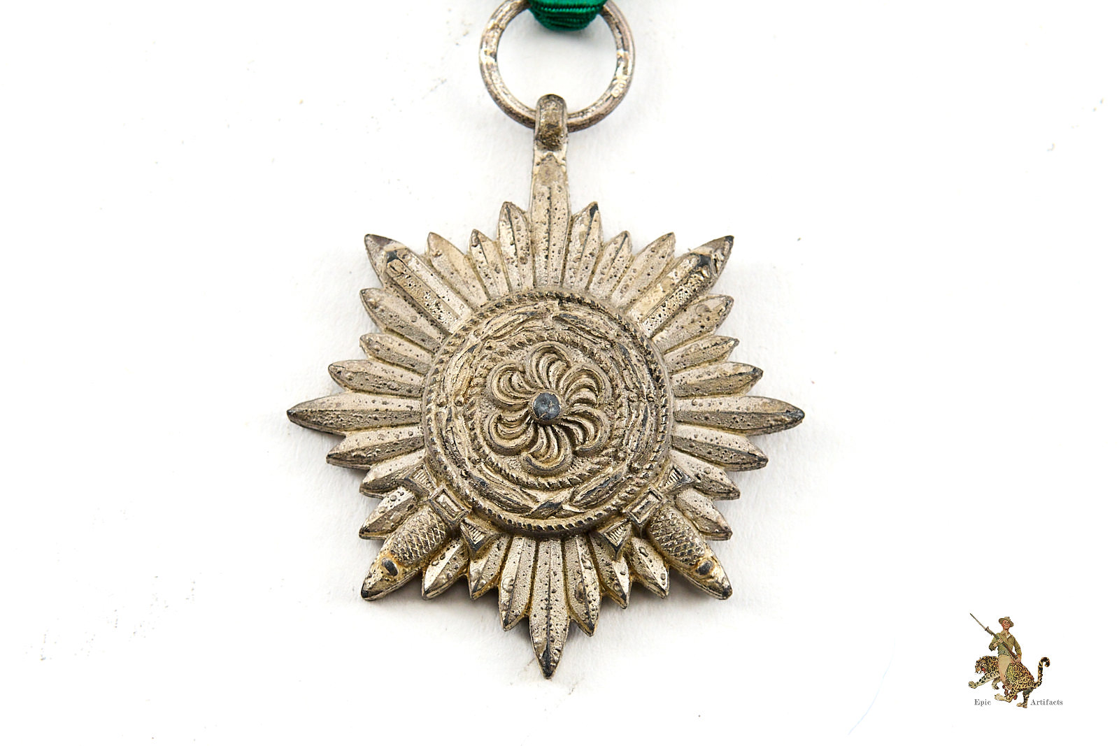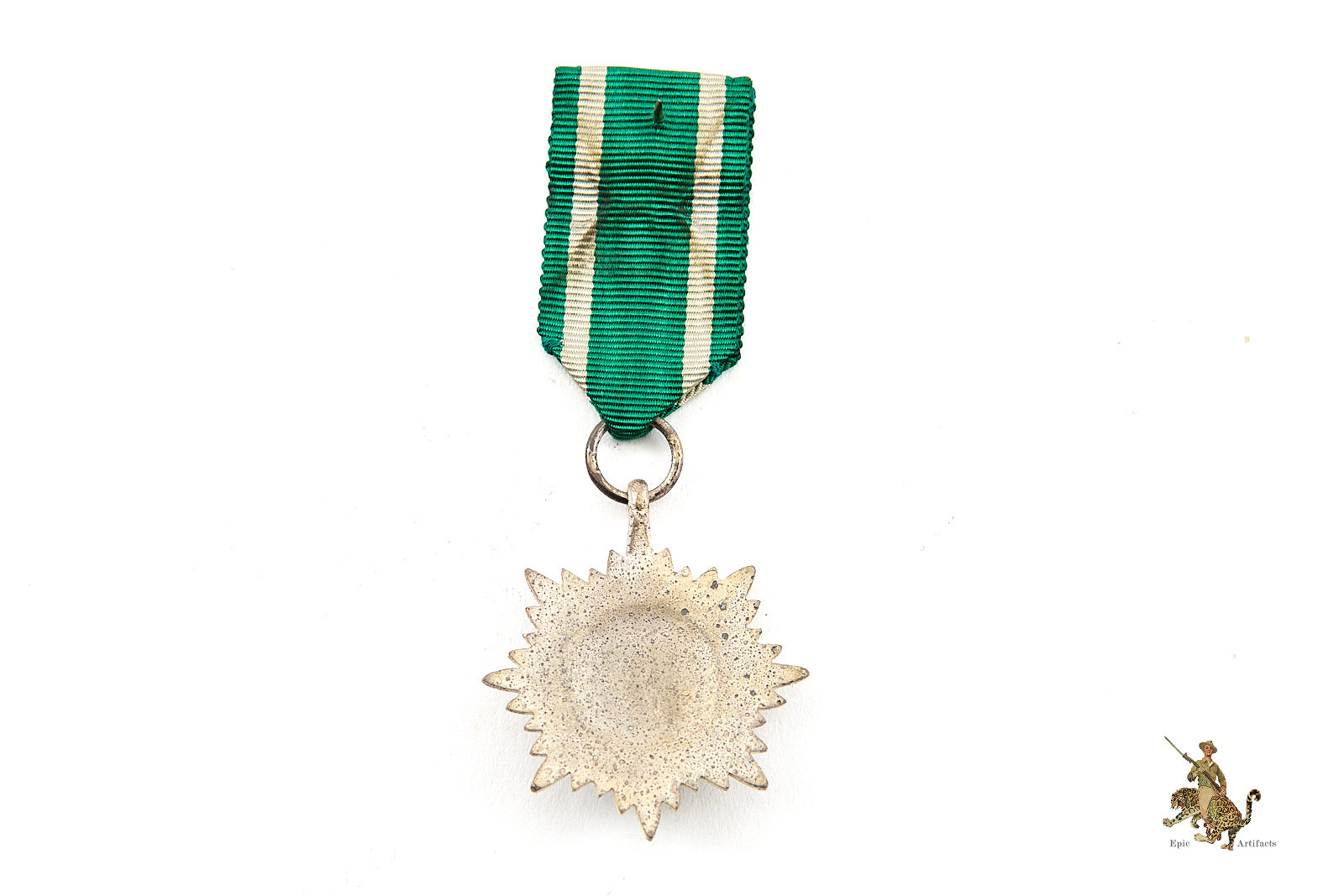 This particular medal is marked “100” for Wachtler & Lange. The medal is accompanied by an approximately 4-inch length of its original ribbon, correctly rendered in green with twin white stripes, as prescribed for the 2nd Class Silver variant. The ribbon has a tack and some glue or other residue on back from being mounted in some way.