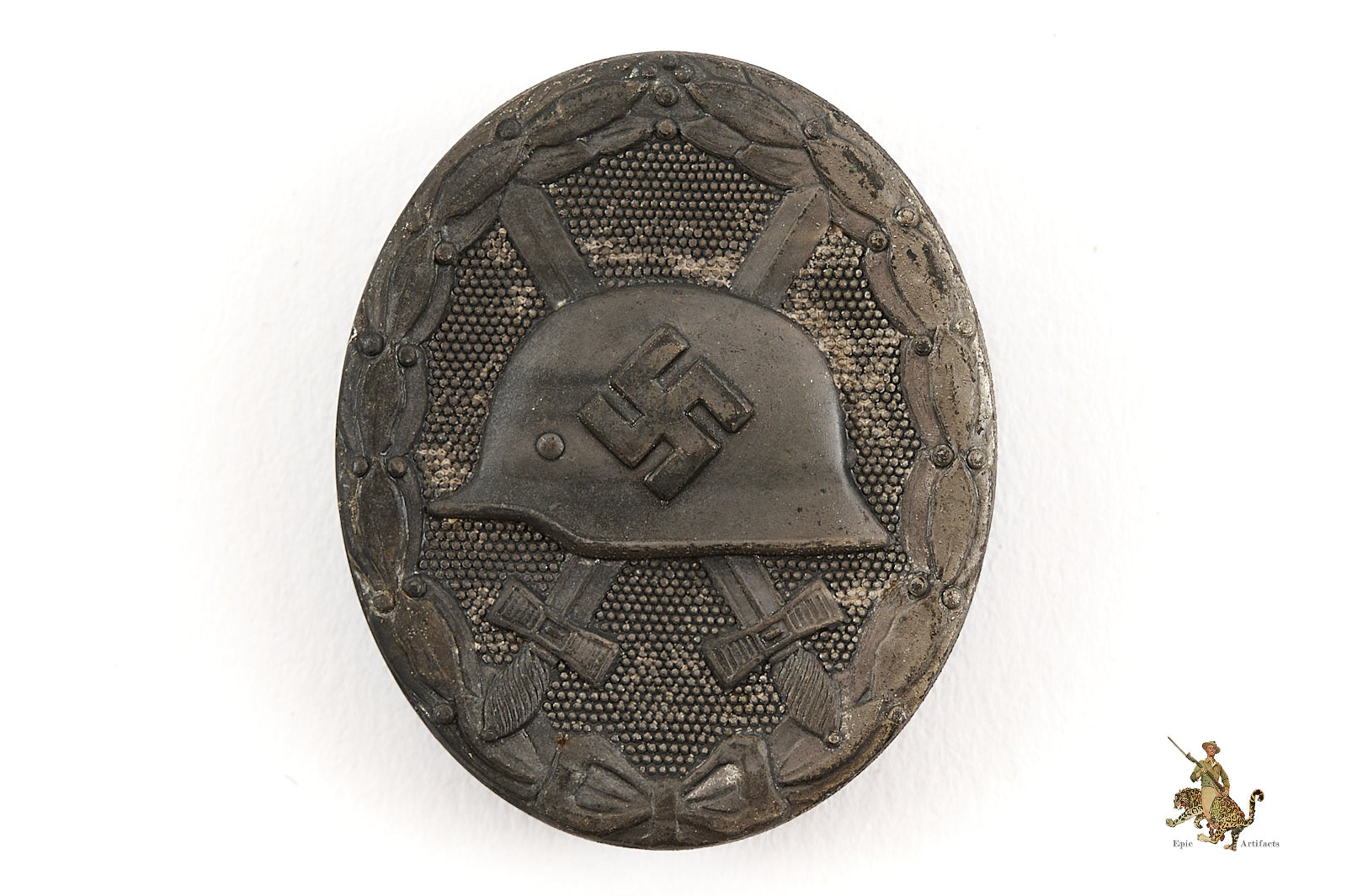 Historical Description: The German Wound Badge was instituted during the First World War to recognize those wounded in the conflict. It was designed using a World War One style Imperial German helmet as the main motif. The helmet was set on top two crossed swords against a pebbled background and surrounded by a laurel leaves wreath.