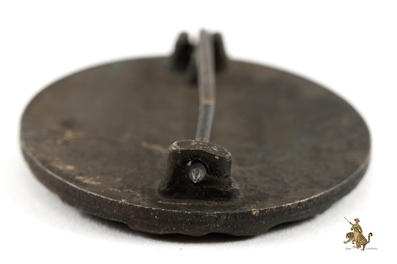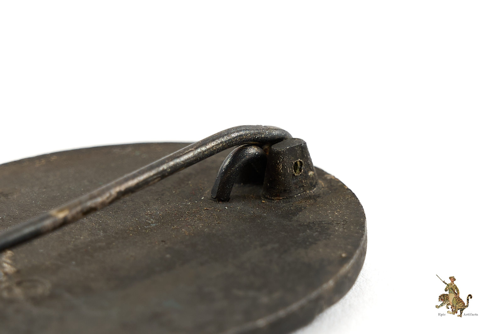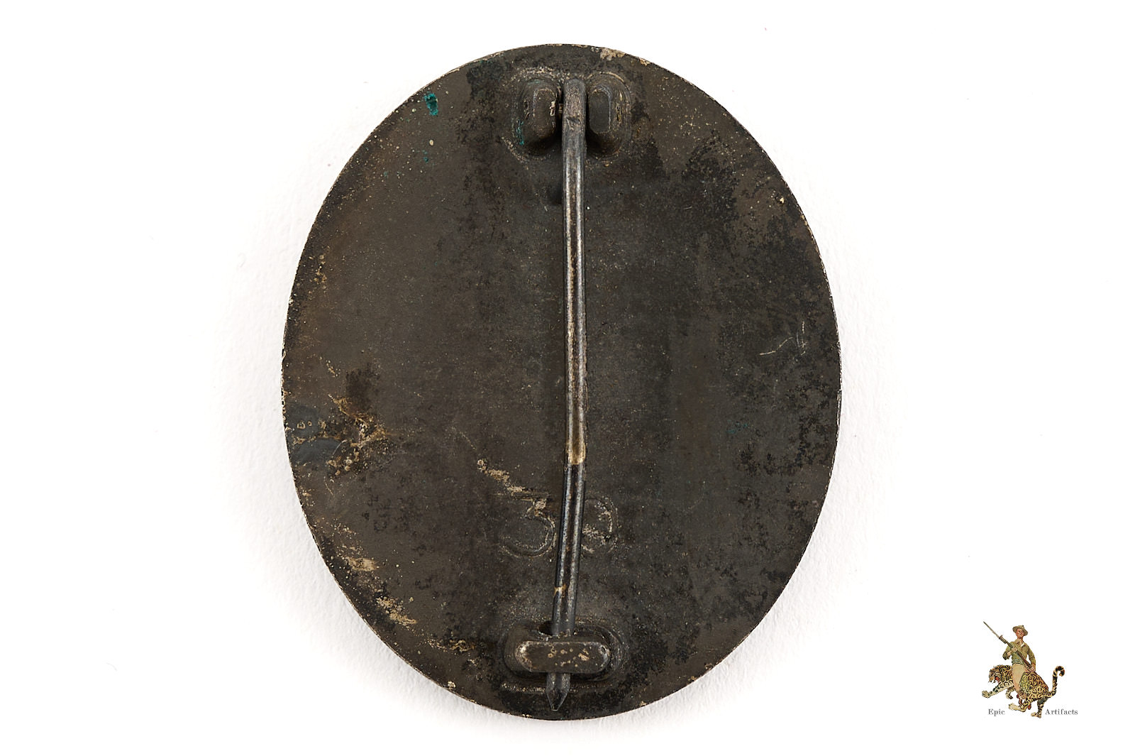 Product Description: This Silver Wound Badge is a textbook original maker marked 30 for Hauptmünzamt (Main Mint) in Vienna, Austria. The obverse has remnants of the original silver finish, with dull gray color of the base zinc metal showing through most of the badge. The reverse of this badge is flat, and has the Präsidialkanzlei code “30” in raised numerals, indicating manufacture by the firm of Hauptmünzamt (Main Mint) in Vienna, Austria – a fairly prolific maker of these badges. The reverse finish has faded to the dull gray zinc base metal with scattered remnants of the original silver finish. The badge retains the original integral hinge with round wire pin and integral catch. This Silver Wound Badge – 30 – Hauptmünzamt shows an even patina, and is a nice representative example of this variant. This Silver Wound Badge – 30 – Hauptmünzamt is in excellent condition.