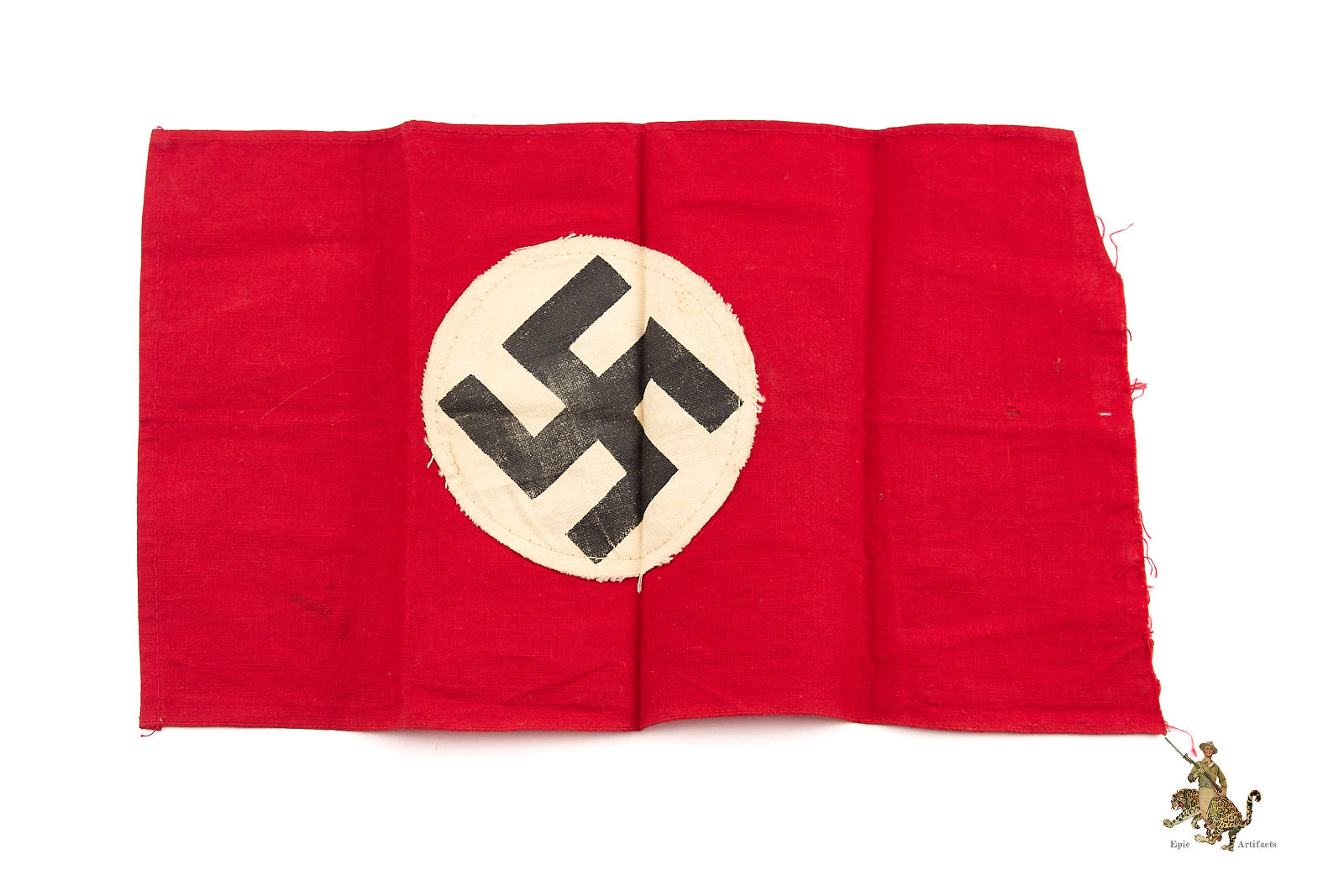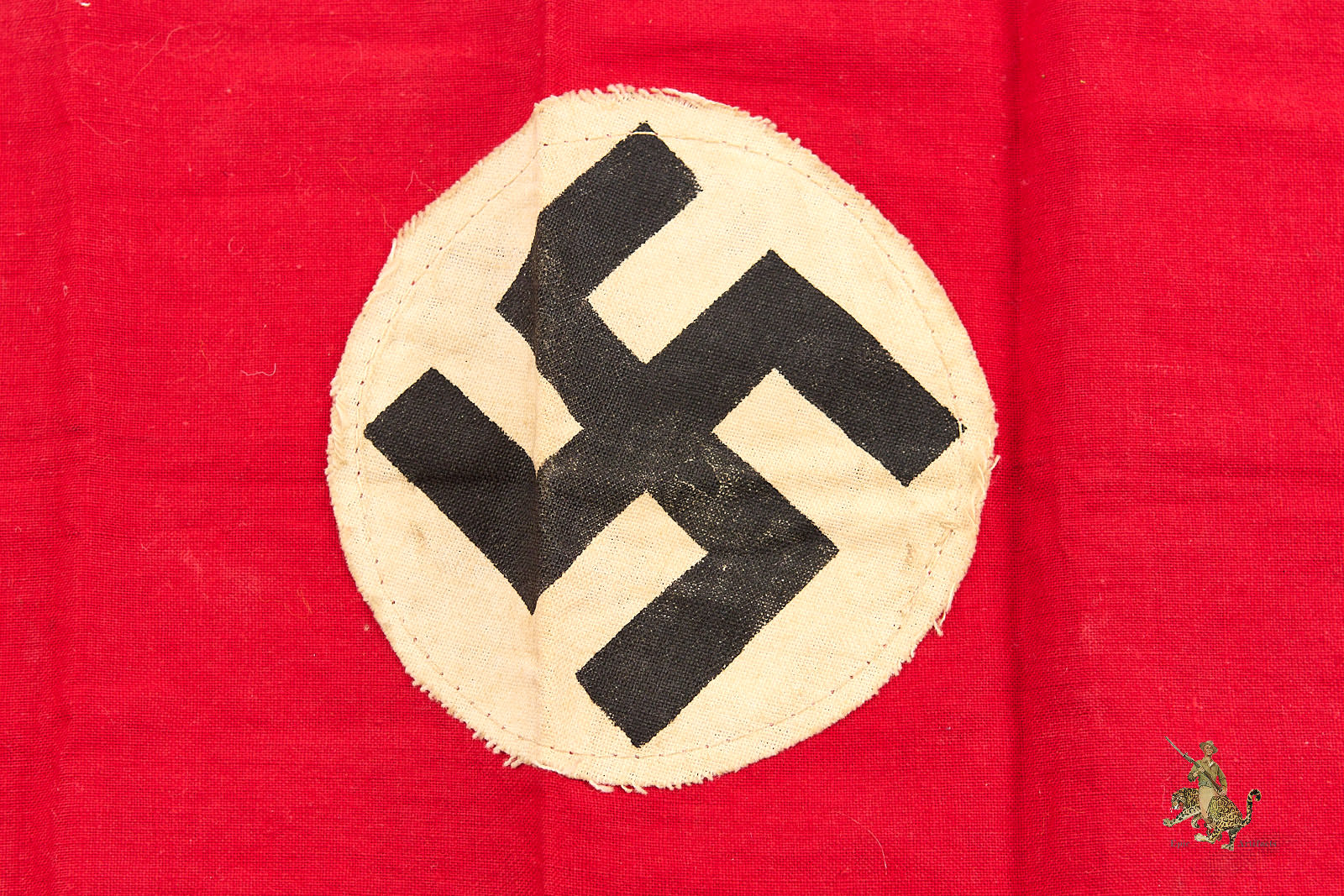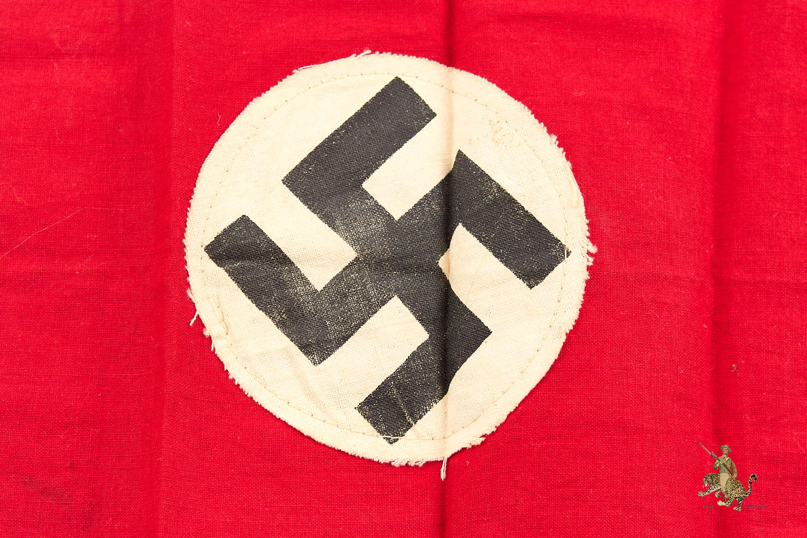 Historical Description: The red flag with white central disk and black swastika was introduced by Hitler in the 1920s as the flag of the National Socialist political party. In 1933, shortly after the Nazis took power, this party flag was recognized alongside the black-white-red Imperial tricolor as one of Germany’s national flags. In 1935, the use of the tricolor flag was discontinued, and between September 1935 and May 8, 1945, the Nazi party flag was the sole national flag of Germany. From its creation in the 1920s through the end of the war, this swastika flag was made and used in endless variations, from the massive banners hung at Party Day rallies to small pennants, bunting flags, and hand-held paper flags distributed along parade routes. These flags, banners and pennants flew from ships, were hung from official and private buildings, and were displayed outside business and private homes. At the end of WWII, the Allied military governments abolished the use of all Nazi symbols, including the national flag. Most Third Reich era German national flags were simply destroyed.